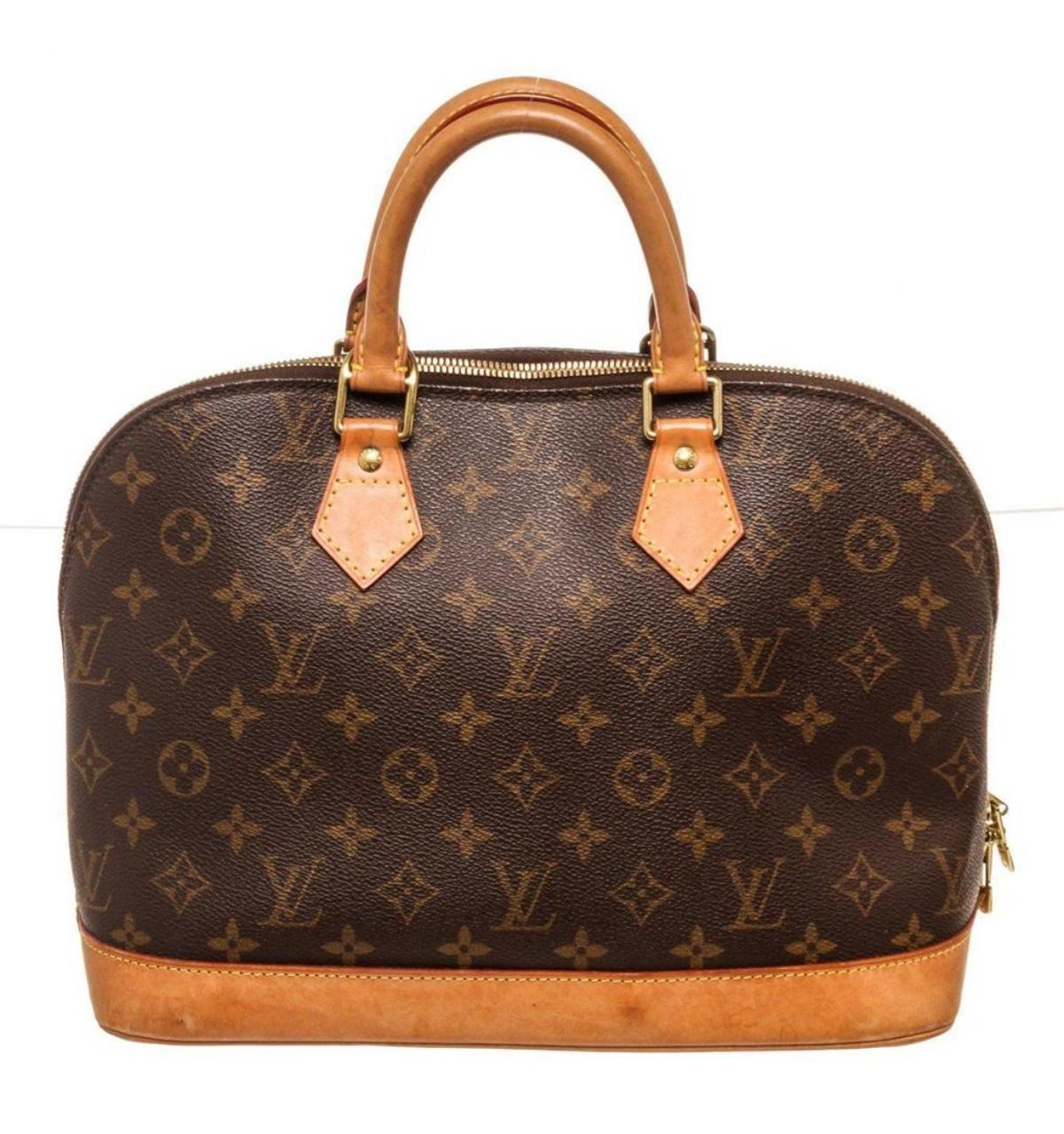 Louis Vuitton Brown Alma PM Satchel. Louis Vuitton Brown Alma PM Satchel with material monogram canvas, gold-tone hardware, trim tan vachetta leather, interior slip pockets, dual top handle and zipper closure.