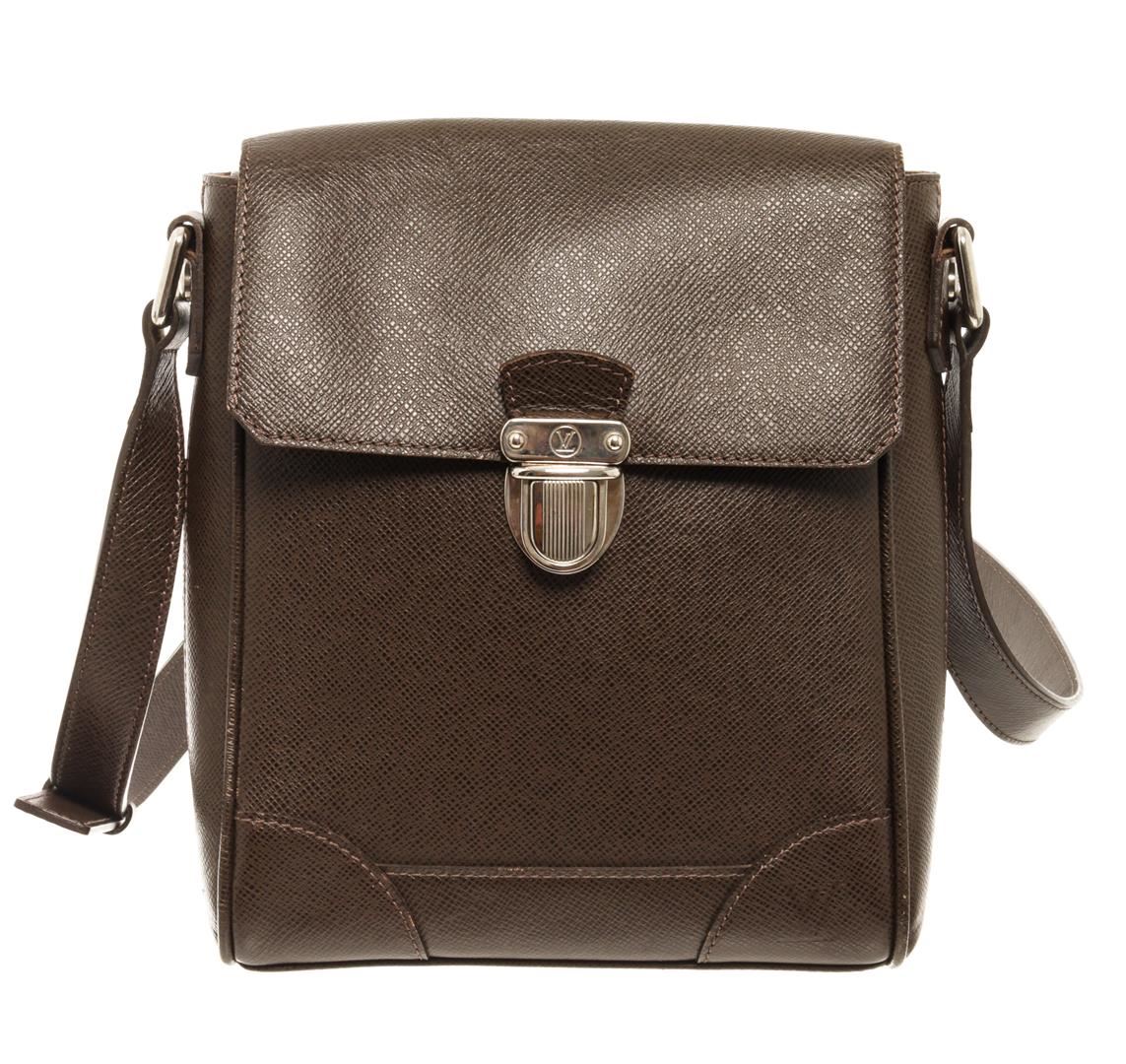 One Louis Vuitton Brown Ardoise Luka Taiga Leather Shoulder Bag. Item is sold AS-IS. All available information is listed in the description and shown in the photo. Louis Vuitton Brown Ardoise Luka Taiga Leather Shoulder Bag with silver tone hardware, brown leather trim, brown fabric lining, exterior back zipper pocket, interior open pockets, and buckle closure.