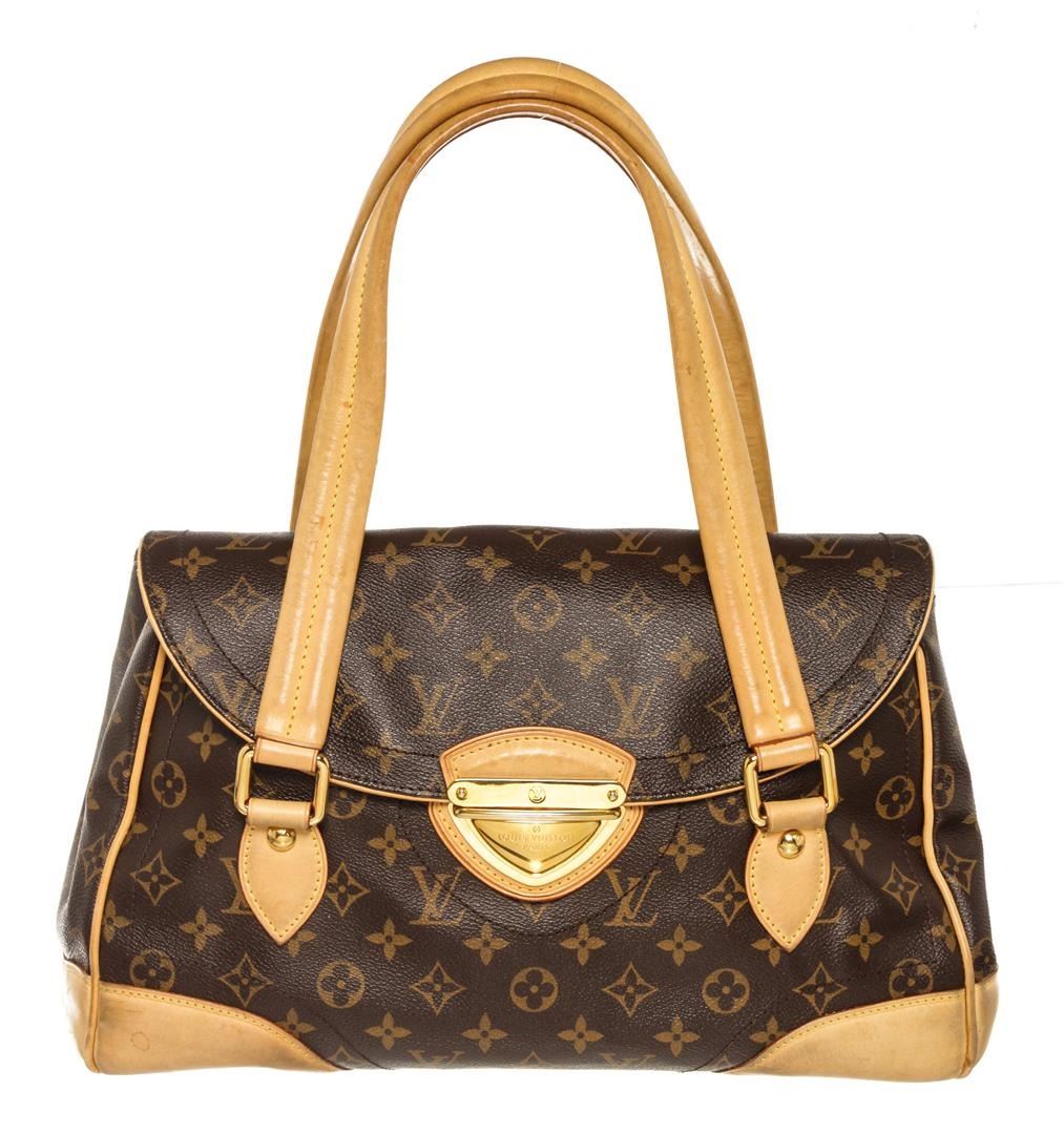 One Louis Vuitton Brown Beverly GM Shoulder Bag. Item is sold AS-IS. All available information is listed in the description and shown in the photo. Louis Vuitton Brown Monogram Beverly GM Shoulder Bag with material monogram canvas, gold-tone hardware, tan vachetta leather trim, top handle, leather shoulder strap, and zipper closure.