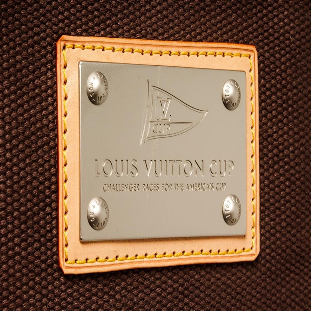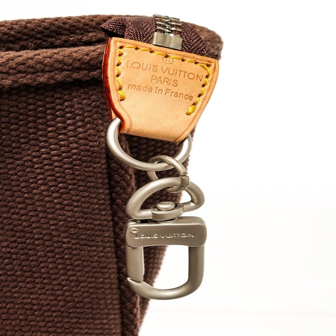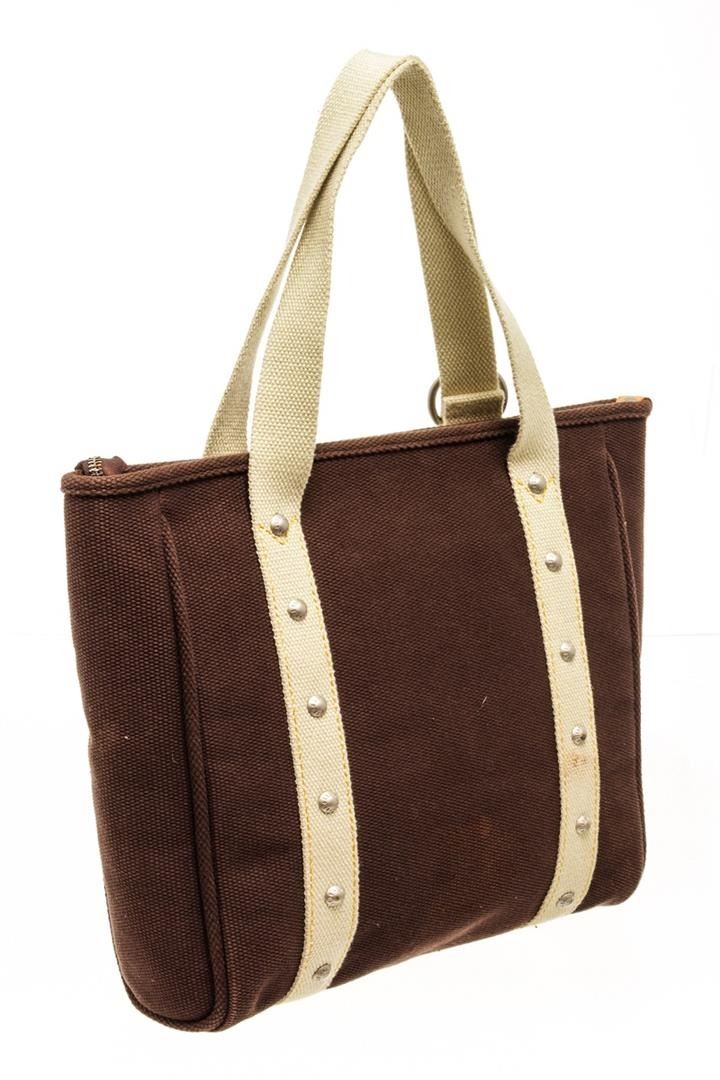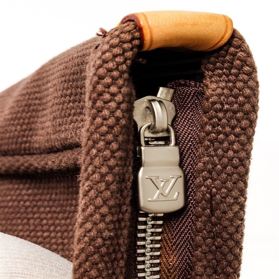 One Louis Vuitton Brown Canvas Antiqua Cabas GM Bag. Item is sold AS-IS. All available information is listed in the description and shown in the photo. Louis Vuitton brown canvas Antiqua Cabas GM bag features a canvas body, black striped fabric interior, flat shoulder straps, silver-tone hardware, a top zip closure, and an interior slip pocket. Height: 14" Width: 15.7" Depth: 2.8" , Shoulder Drop: / 35.56 x 39.87 x 7.11 Cm