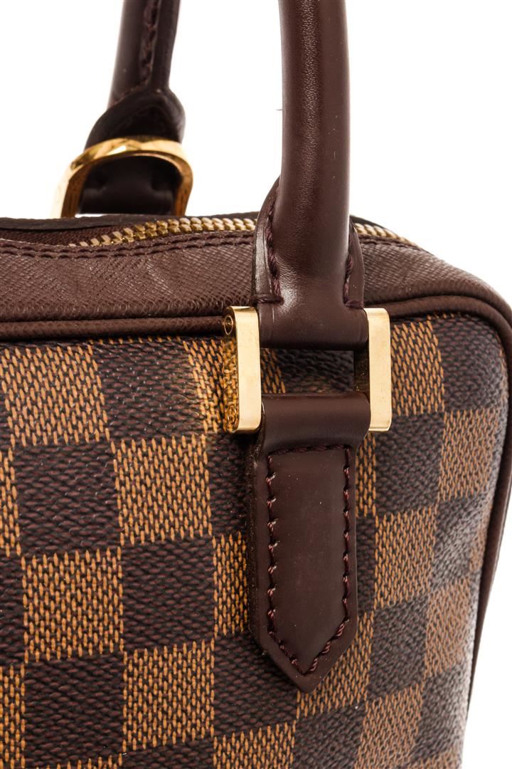 Louis Vuitton Brown Canvas Damier Ebene Brera Tote Bag. All available information is listed in the description and shown in the photos. Louis Vuitton Brown Canvas Damier Ebene Brera Tote Bag with brown coated canvas, damier ebene pattern, brass hardware, dual rolled handles, alcantara lining & single interior pocket, zipper closure at top. Height: 8.5" Width: 9.5" Depth: 4.25", Handle Drop: 5" / 21.59 x 24.13 x 10.79 Cm