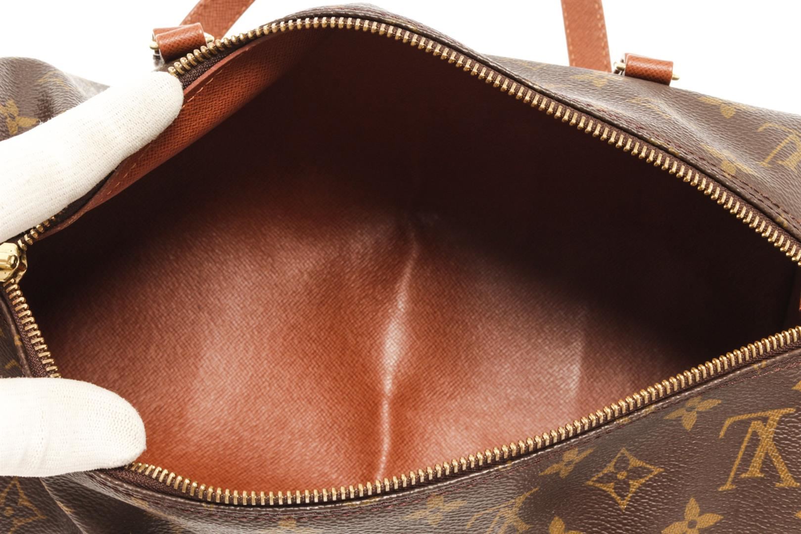 One Louis Vuitton Brown Canvas Papillon 30cm Shoulder Bag. Item is sold AS-IS. All available information is listed in the description and shown in the photo. Louis Vuitton Brown Canvas Papillon 30cm Shoulder Bag with top handle, leather lining, gold tone hardware, zipper closure. Height: 5.3" Width: 11.4" Depth: 2", Handle Drop: 5.9" / 13.46 x 28.95 x 5.08 Cm
