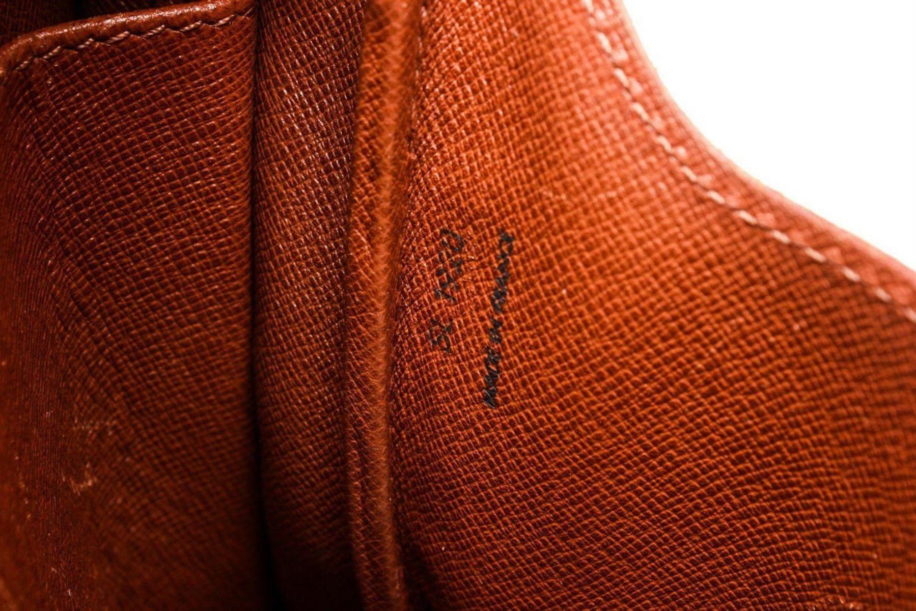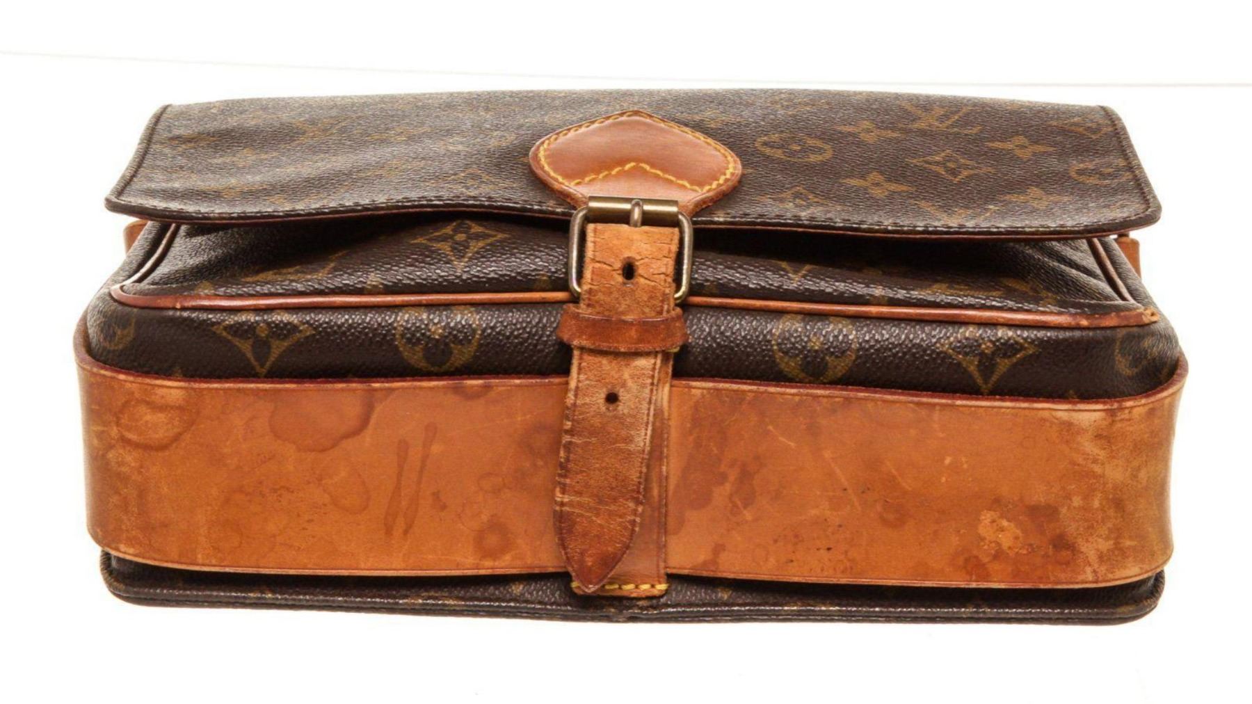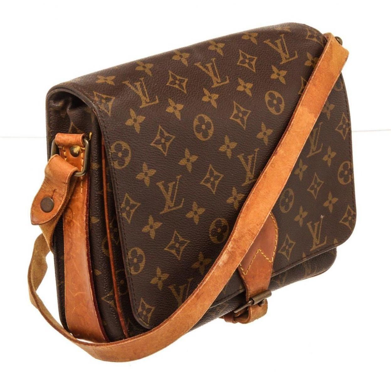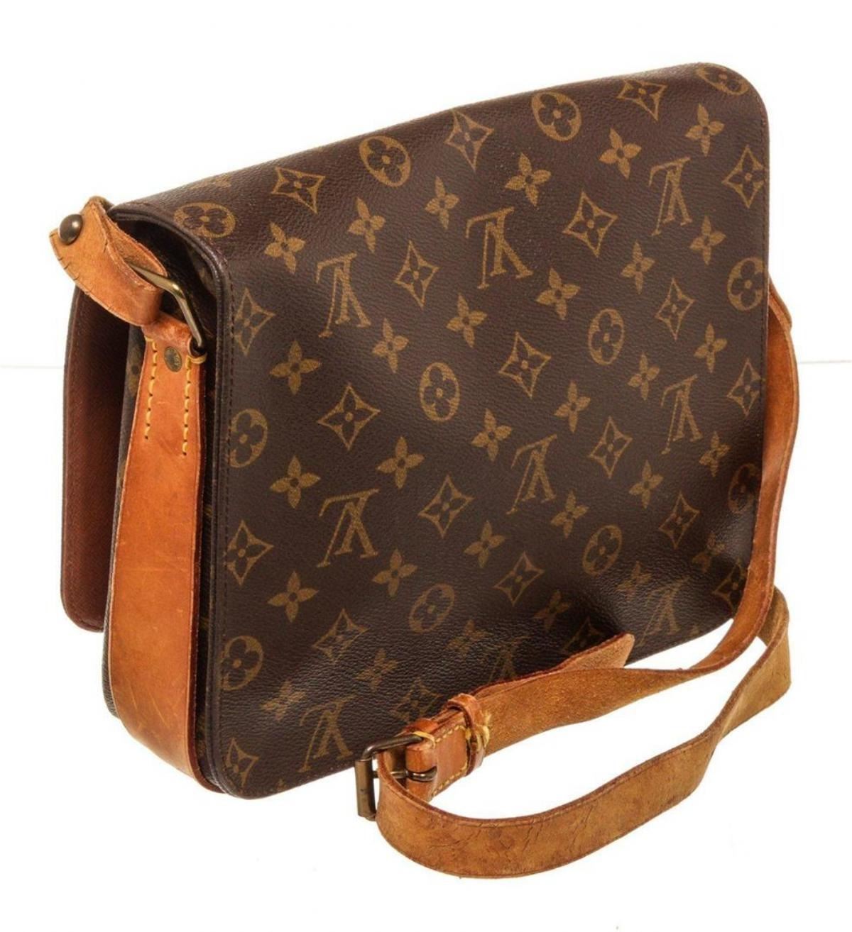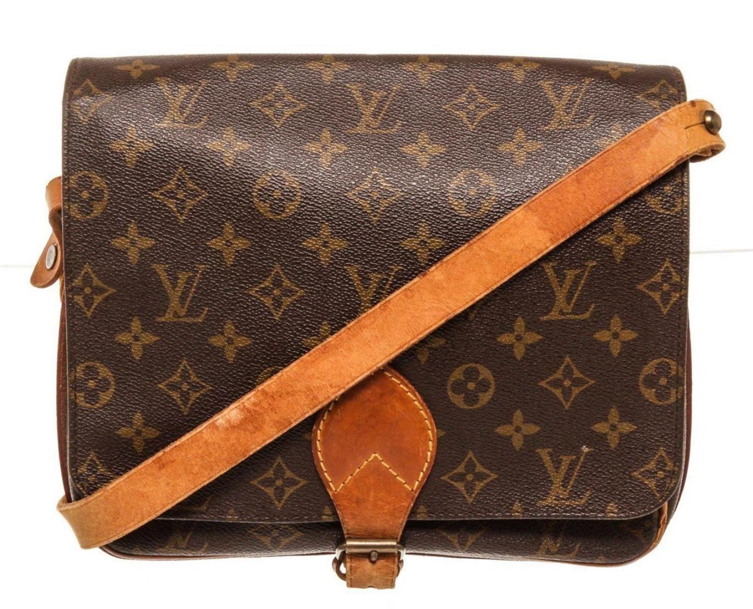 Louis Vuitton Brown Cartouchiere GM Crossbody Bag with material monogram canvas, gold-tone hardware, trim tan vachetta leather, interior compartments pocket, shoulder strap and flap closure.