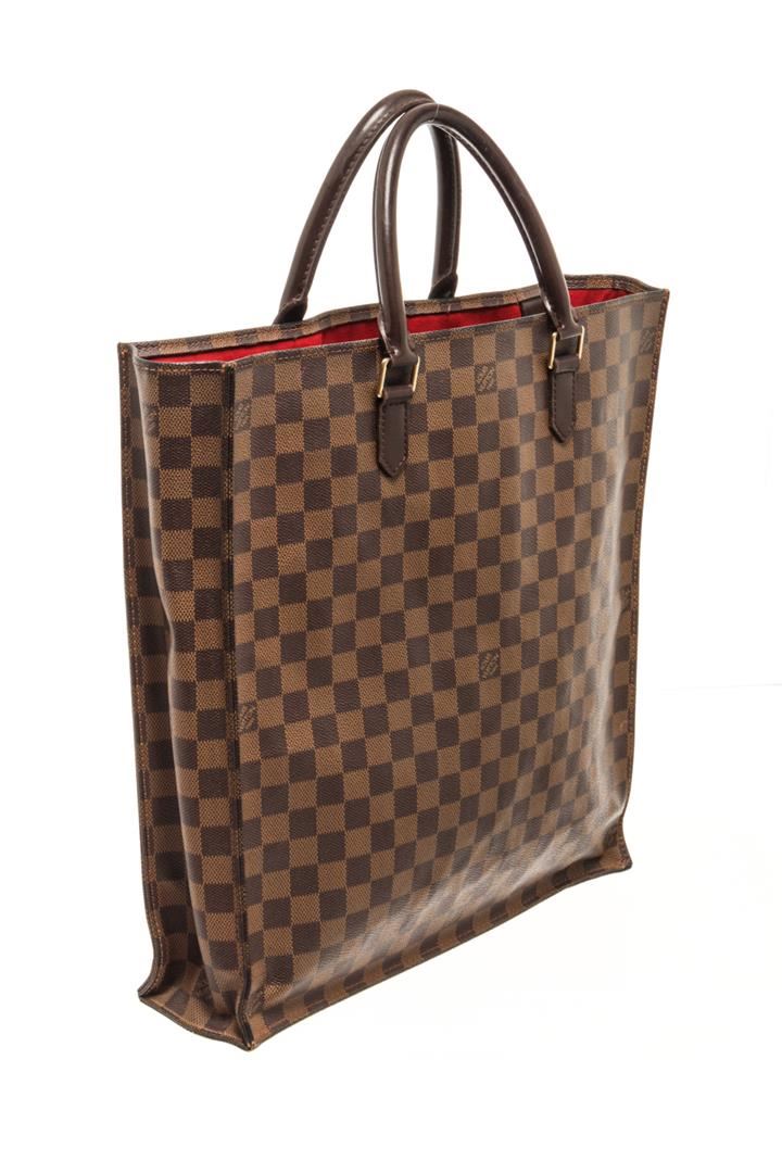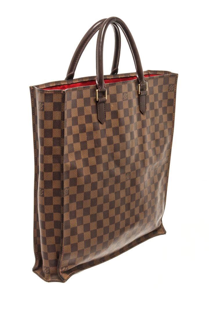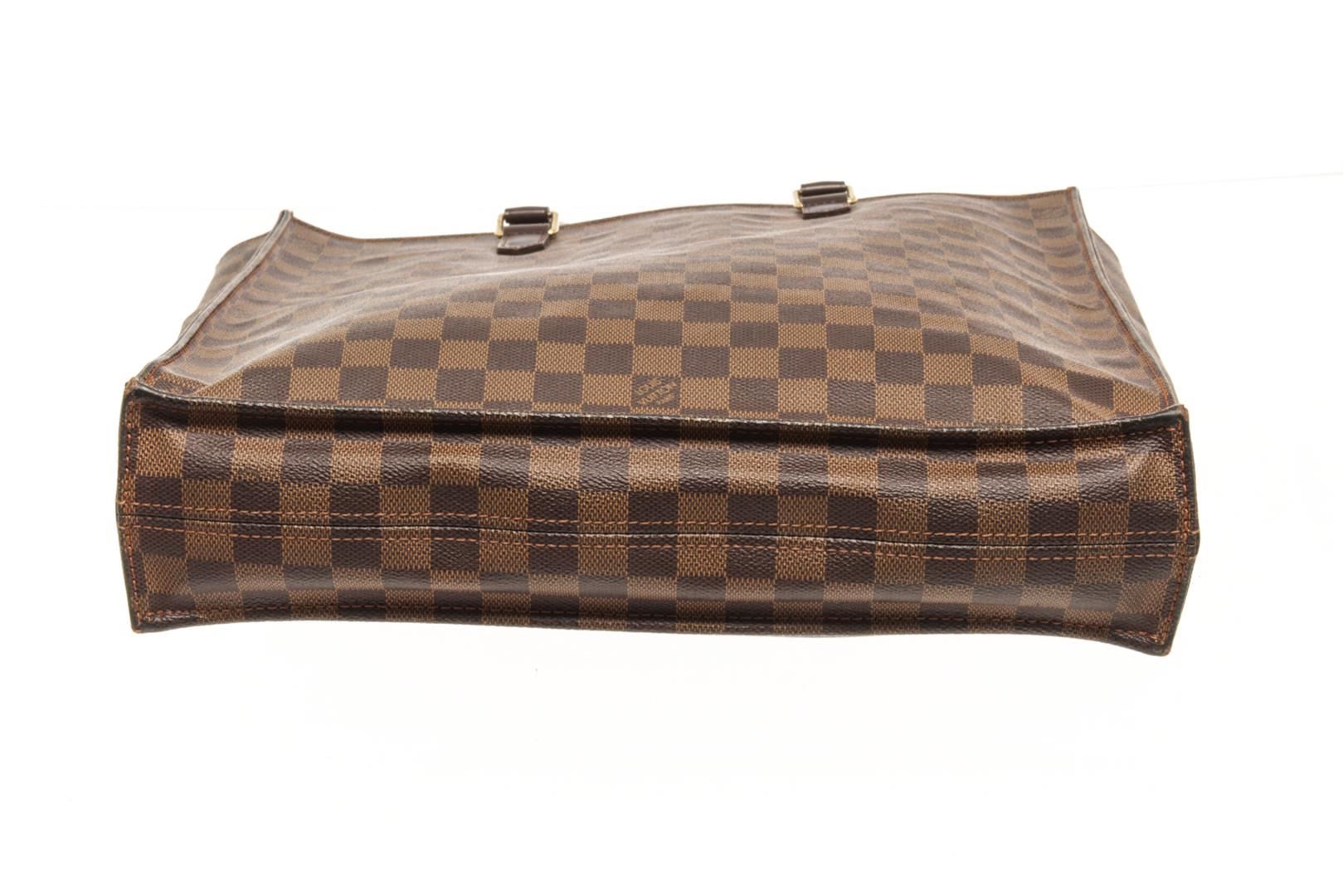 One Louis Vuitton Brown Damier Ebene Canvas Sac Plat Tote Bag. Item is sold AS-IS. All available information is listed in the description and shown in the photo. Louis Vuitton Brown Damier Ebene Canvas Sac Plat Tote Bag with gold-tone hardware, internal logo patch internal patch pockets main compartment, two rounded top handles leather trim, open top, red suede lining. Depth 3.9 in, Handle 4.7 in, Height 15 in, Width 14.2 in/ Depth 10 cm, Handle 12 cm, Height 38 cm, Width 36 cm