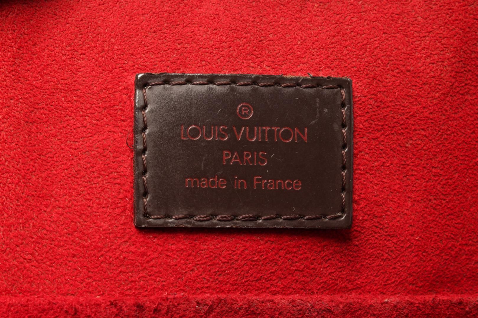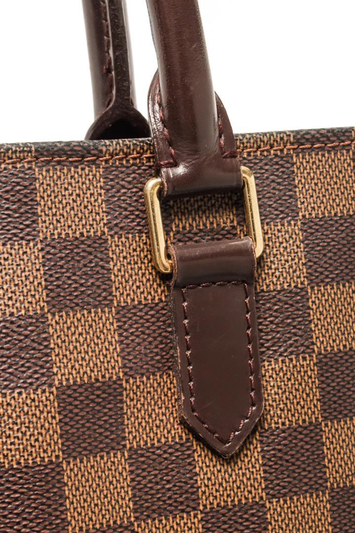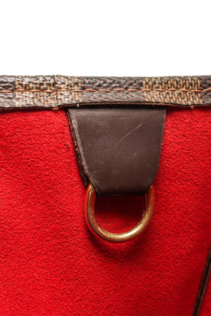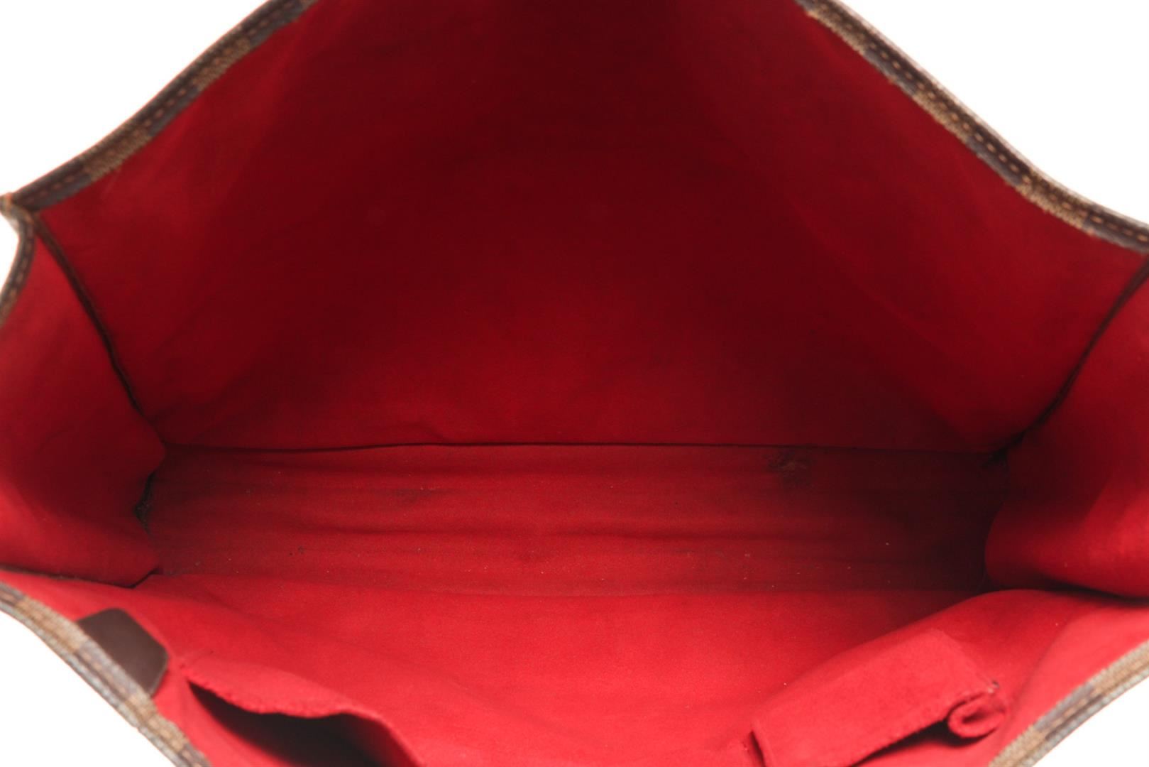 One Louis Vuitton Brown Damier Ebene Canvas Sac Plat Tote Bag. Item is sold AS-IS. All available information is listed in the description and shown in the photo. Louis Vuitton Brown Damier Ebene Canvas Sac Plat Tote Bag with gold-tone hardware, internal logo patch internal patch pockets main compartment, two rounded top handles leather trim, open top, red suede lining. Depth 3.9 in, Handle 4.7 in, Height 15 in, Width 14.2 in/ Depth 10 cm, Handle 12 cm, Height 38 cm, Width 36 cm