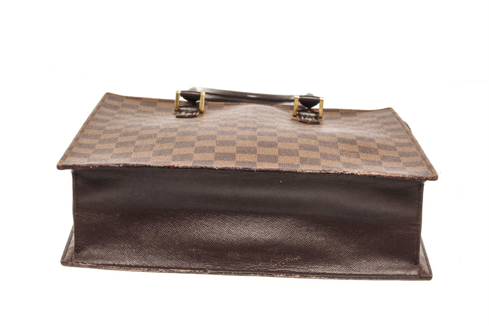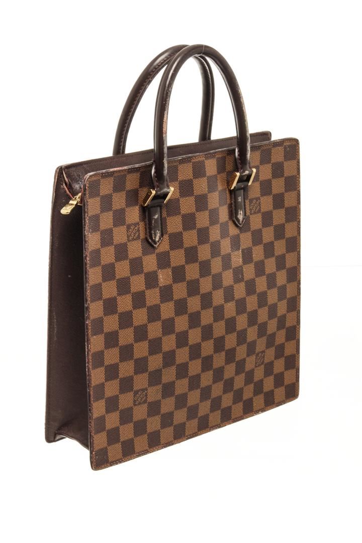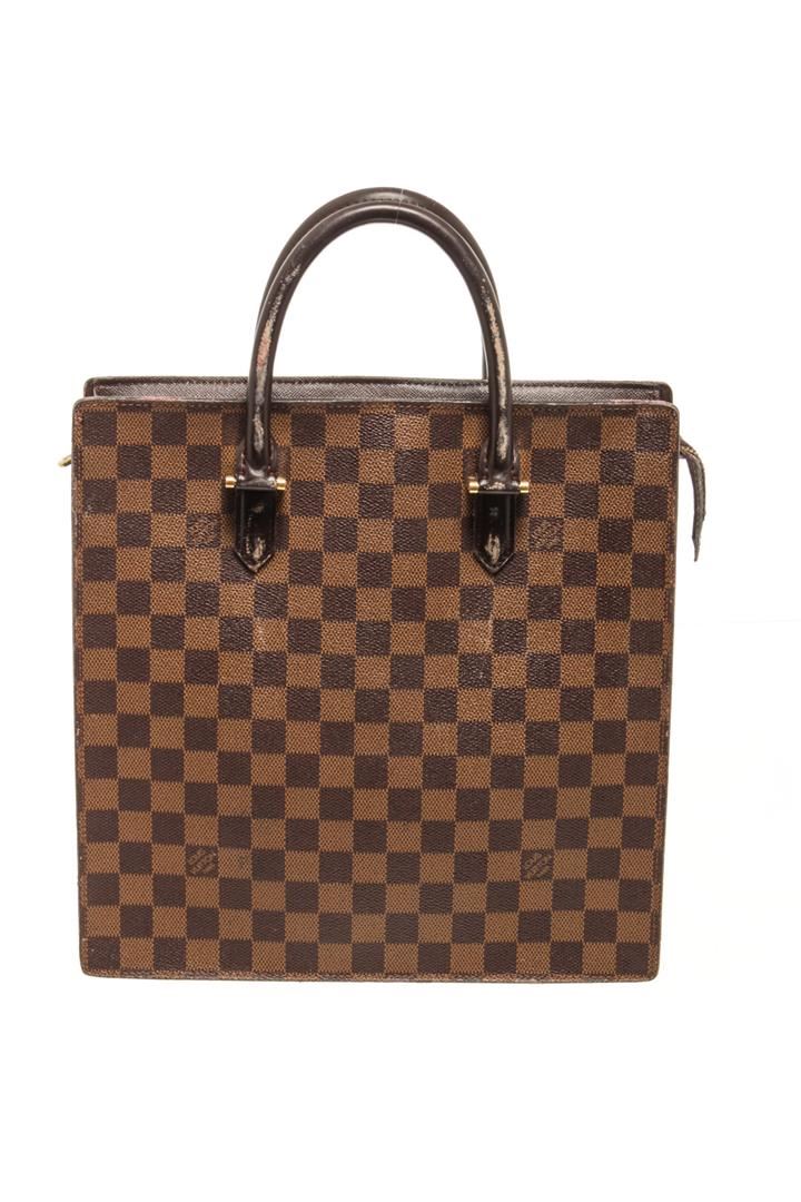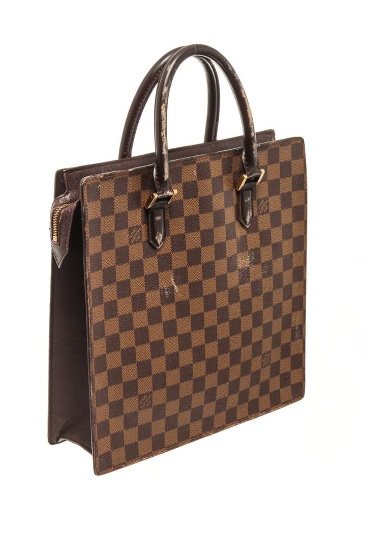 Louis Vuitton Brown Damier Ebene Canvas Sac Plat Venice Tote Bag. All available information is listed in the description and shown in the photos. Louis Vuitton Brown Damier Ebene Canvas Sac Plat Venice Tote Bag top handle, red suede lining, interior pocket, gold tone hardware, zipper closure. There are white markings on the leather, peeling on the handle, black mark on the leather near the zipper as well as damage, marking on the red suede. Please refer to photos. W11.4 x H11.4 x D3.9inch / W29cm x H29cm x D10cm