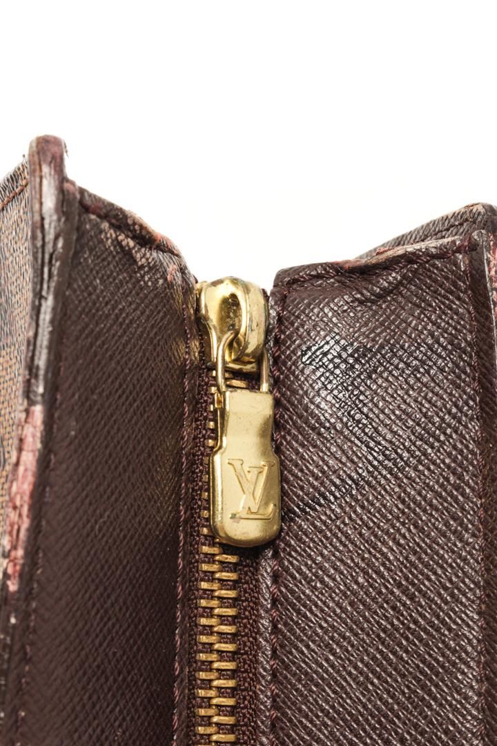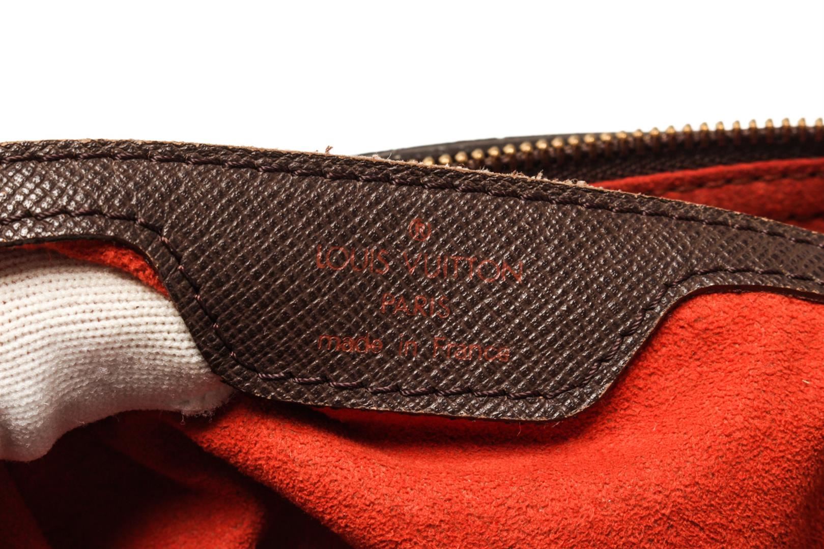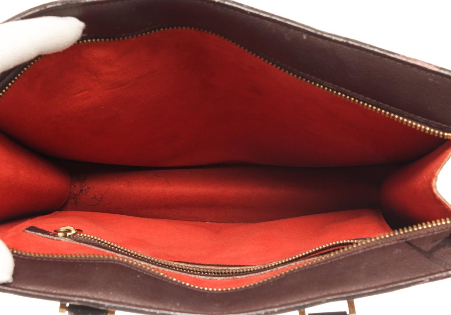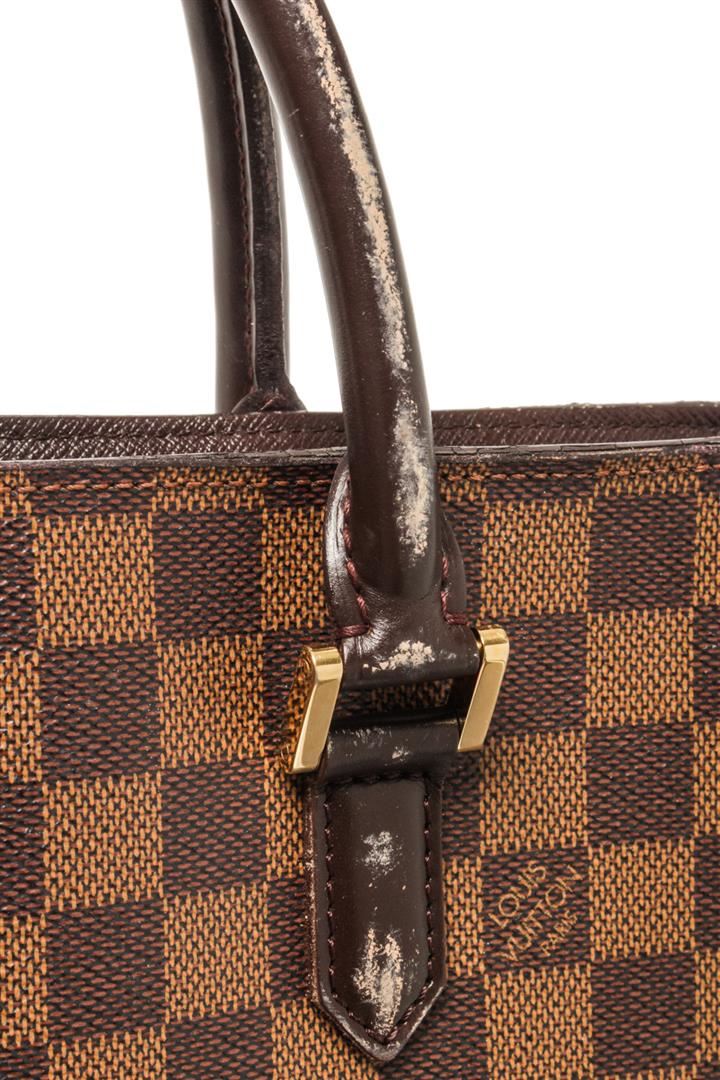 Louis Vuitton Brown Damier Ebene Canvas Sac Plat Venice Tote Bag. All available information is listed in the description and shown in the photos. Louis Vuitton Brown Damier Ebene Canvas Sac Plat Venice Tote Bag top handle, red suede lining, interior pocket, gold tone hardware, zipper closure. There are white markings on the leather, peeling on the handle, black mark on the leather near the zipper as well as damage, marking on the red suede. Please refer to photos. W11.4 x H11.4 x D3.9inch / W29cm x H29cm x D10cm