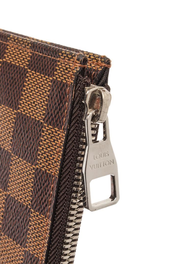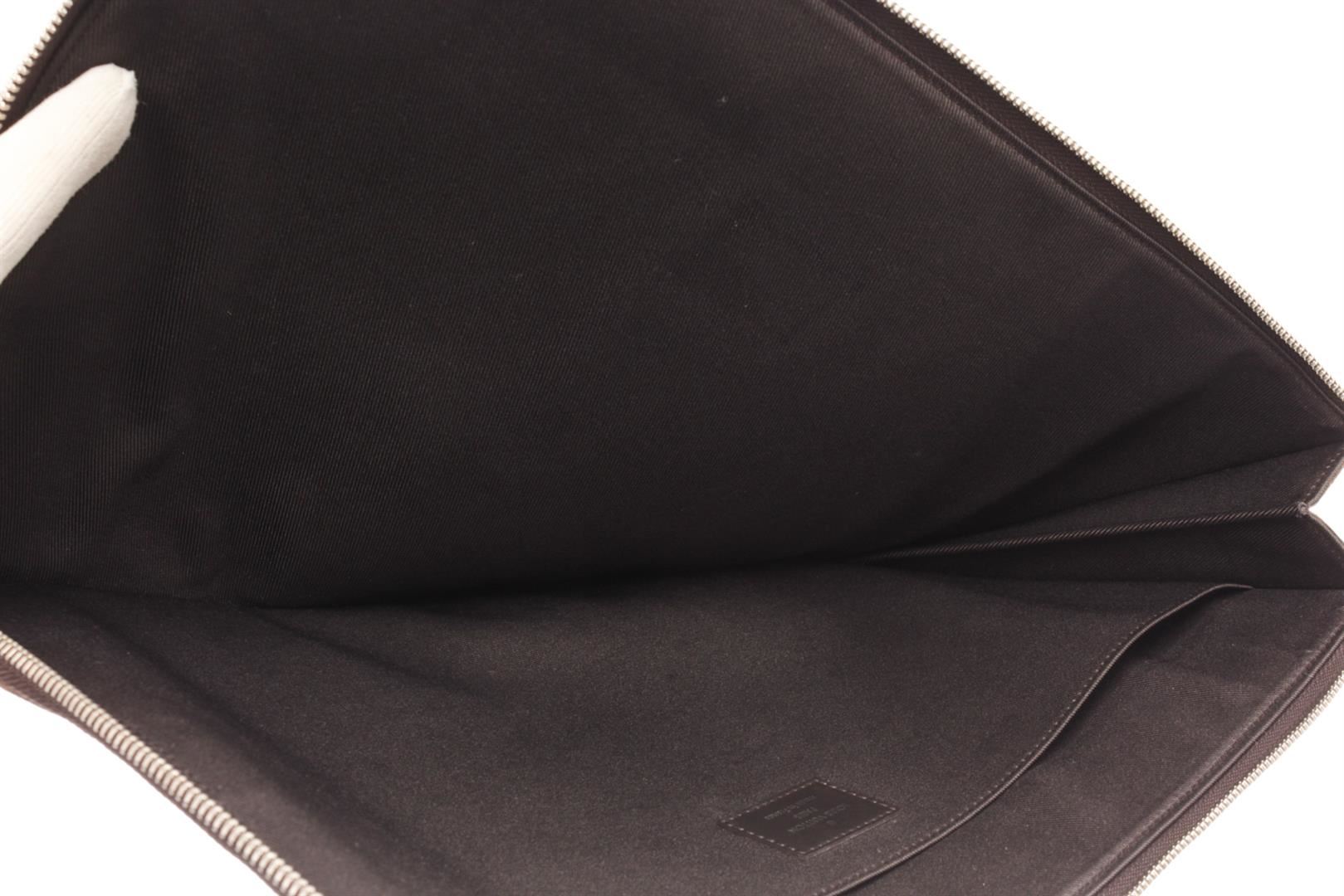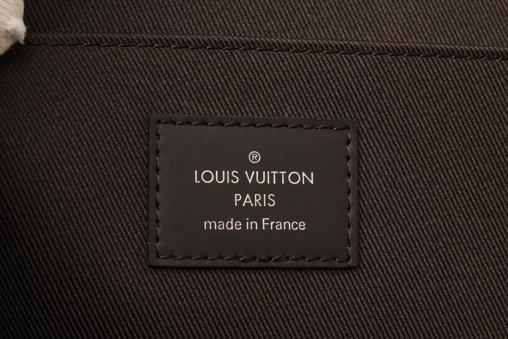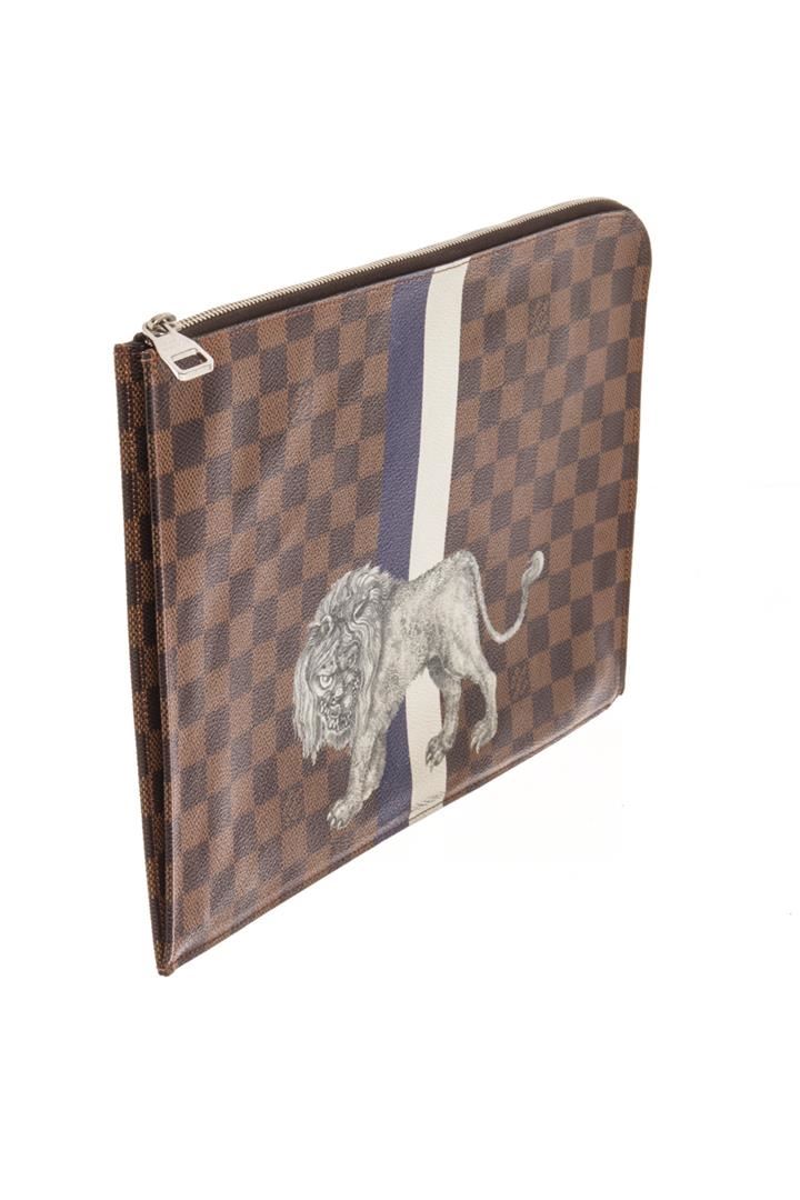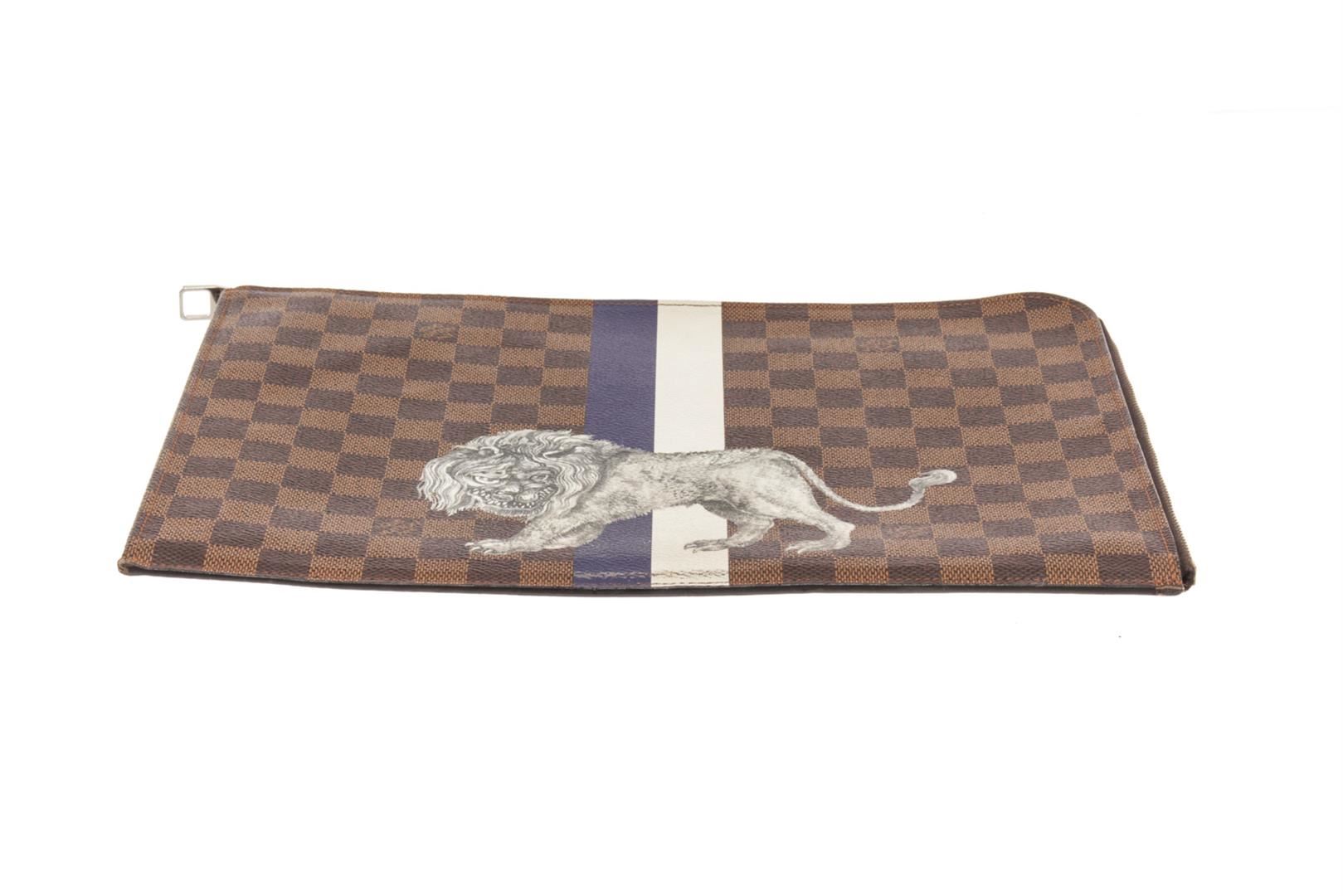 Louis Vuitton Brown Damier Ebene Lion Chapman Pochette Jour GM. All available information is listed in the description and shown in the photos. Louis Vuitton Brown Damier Ebene Lion Chapman Pochette Jour GM with damier ebene coated canvas a blue and white stripe and gray lion print, The polished silver zipper opens to a black fabric interior with a large patch pocket. length: 13.25 in, Width: 0.25 in, Height: 9.75 in / 33.65 x 0.63 x 24.76 CM