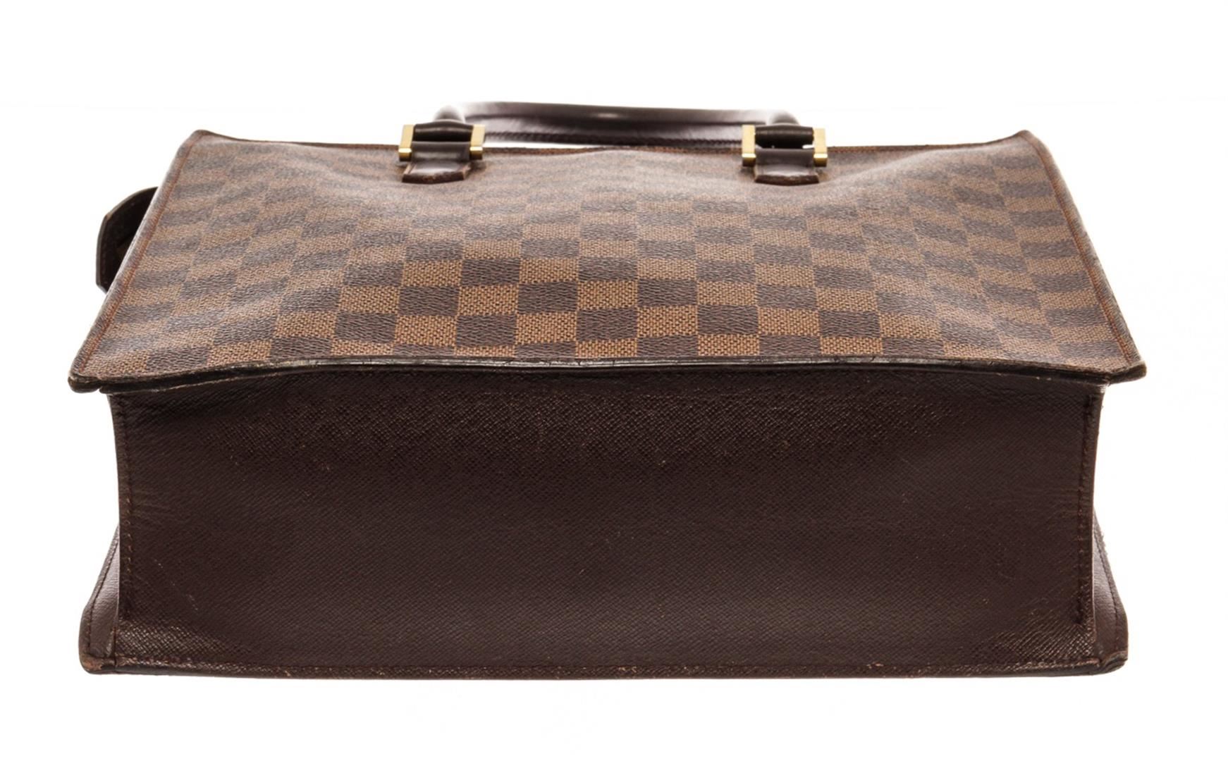 Louis Vuitton Brown Damier Ebene Venice Sac Plat Bag. All available information is listed in the description and shown in the photos. Louis Vuitton Brown Damier Ebene Venice Sac Plat Bag with the venice sac plat features a damier canvas body, damier ebene pattern, leather trim embellishment, rolled leather handles, a top zip closure, and alcantara lining & single interior pocket. 11.2" L x 11" W x 3.1" D, Drop: 3.7", 28.44 x 27.94 x 7.87 Cm