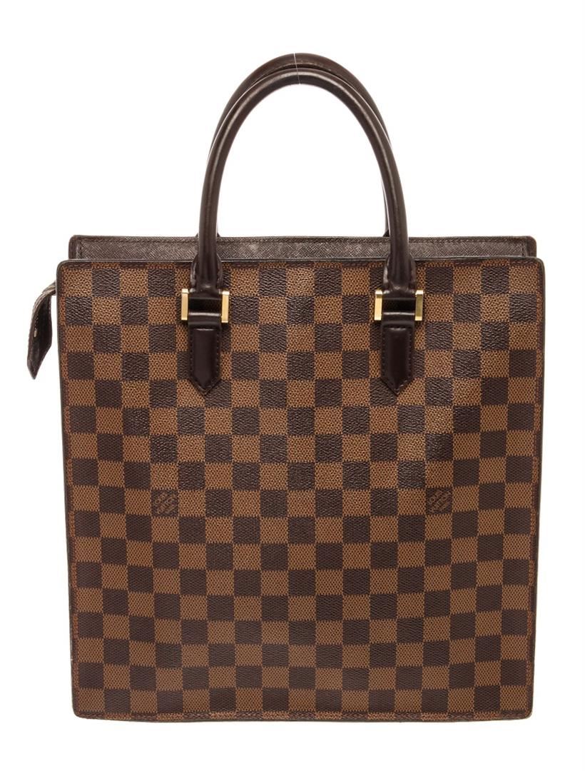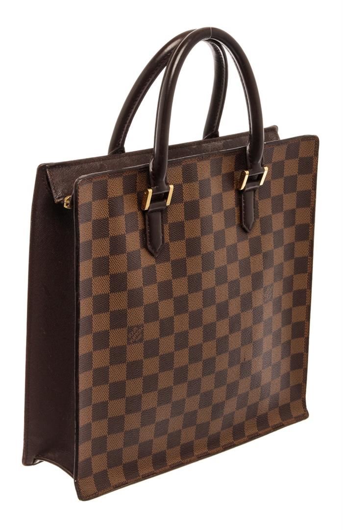 Louis Vuitton Brown Damier Ebene Venice Sac Plat Bag. All available information is listed in the description and shown in the photos. Louis Vuitton Brown Damier Ebene Venice Sac Plat Bag with the venice sac plat features a damier canvas body, damier ebene pattern, leather trim embellishment, rolled leather handles, a top zip closure, and alcantara lining & single interior pocket. 11.2" L x 11" W x 3.1" D, Drop: 3.7", 28.44 x 27.94 x 7.87 Cm