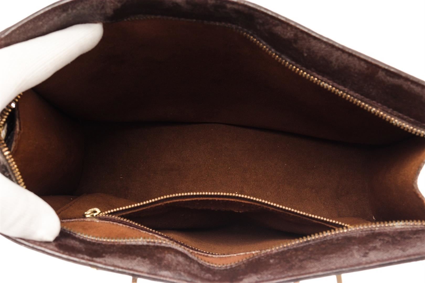 Louis Vuitton Brown Damier Ebene Venice Sac Plat Bag. All available information is listed in the description and shown in the photos. Louis Vuitton Brown Damier Ebene Venice Sac Plat Bag with the venice sac plat features a damier canvas body, damier ebene pattern, leather trim embellishment, rolled leather handles, a top zip closure, and alcantara lining & single interior pocket. 11.2" L x 11" W x 3.1" D, Drop: 3.7", 28.44 x 27.94 x 7.87 Cm