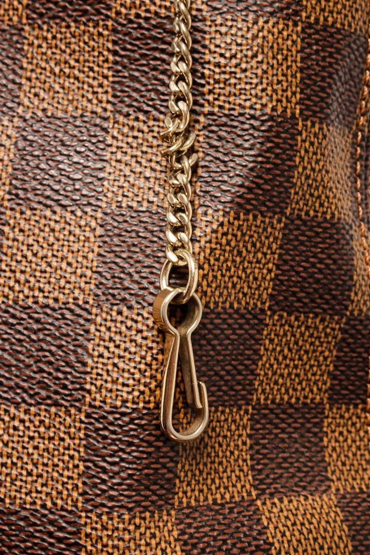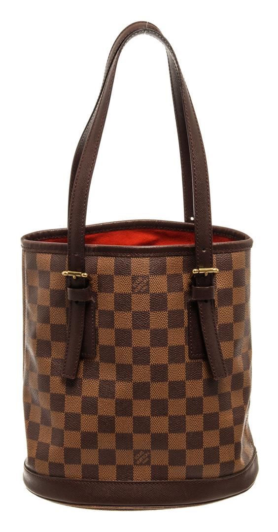 Louis Vuitton Brown Damier Ebene Vintage Marais Bucket Bag. All available information is listed in the description and shown in the photos. Louis Vuitton Brown Damier Ebene Vintage Marais Bucket Bag with damier ebene pattern, brass hardware, leather trim, dual adjustable shoulder straps, leather trim embellishment, alcantara lining & dual interior pockets, open top, protective feet at base Height: 9.5" Width: 10" Depth: 4" Shoulder Strap Drop: 9"