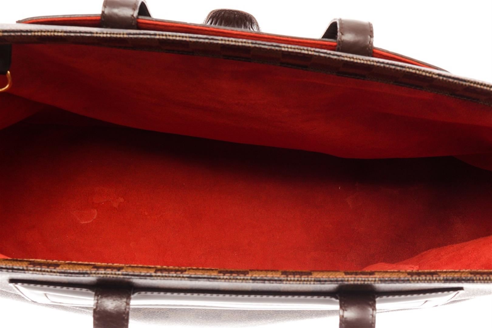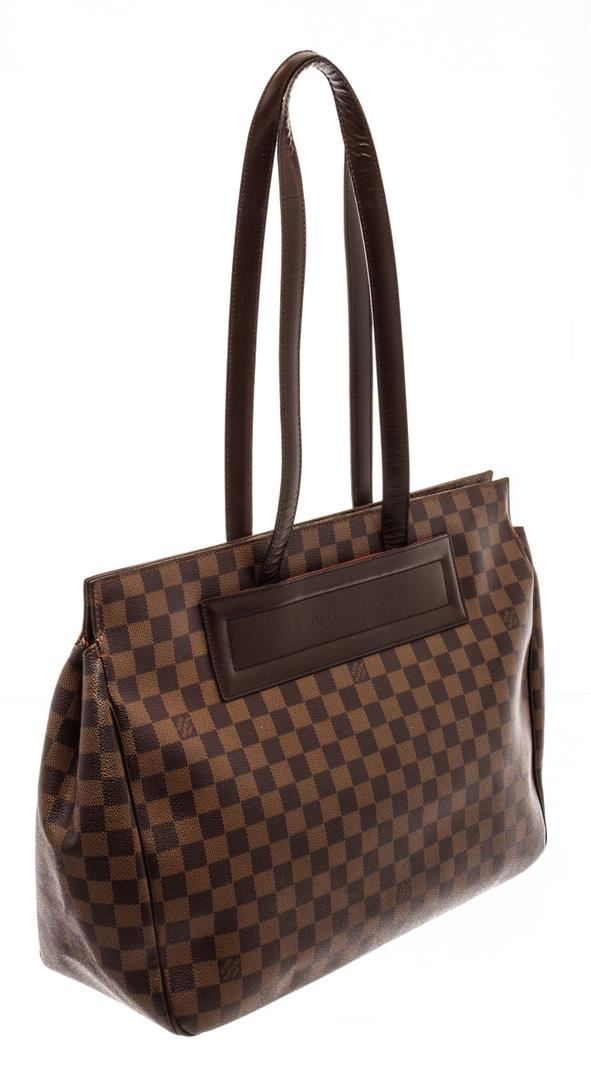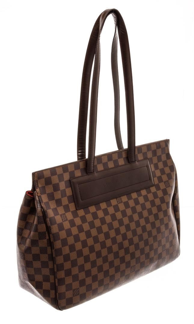 Louis Vuitton Brown Ebene Damier Parioli GM Shoulder Bag. All available information is listed in the description and shown in the photos. Louis Vuitton Brown Ebene Damier Parioli GM Shoulder Bag with with magnetic closure and 1 slip pocket on the front. inside is in the classic orange alkantra lining with 1 open pocket and 1 smaller pocket for your pens, glasses, or other small items. Height: 12.4" Width: 5.5" Depth: 16.5", Shoulder Strap Drop: 12.2" / 31.5 x 13.97 x 41.91 Cm