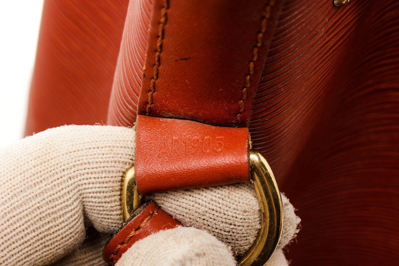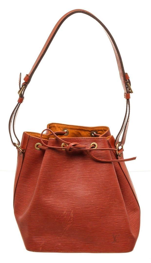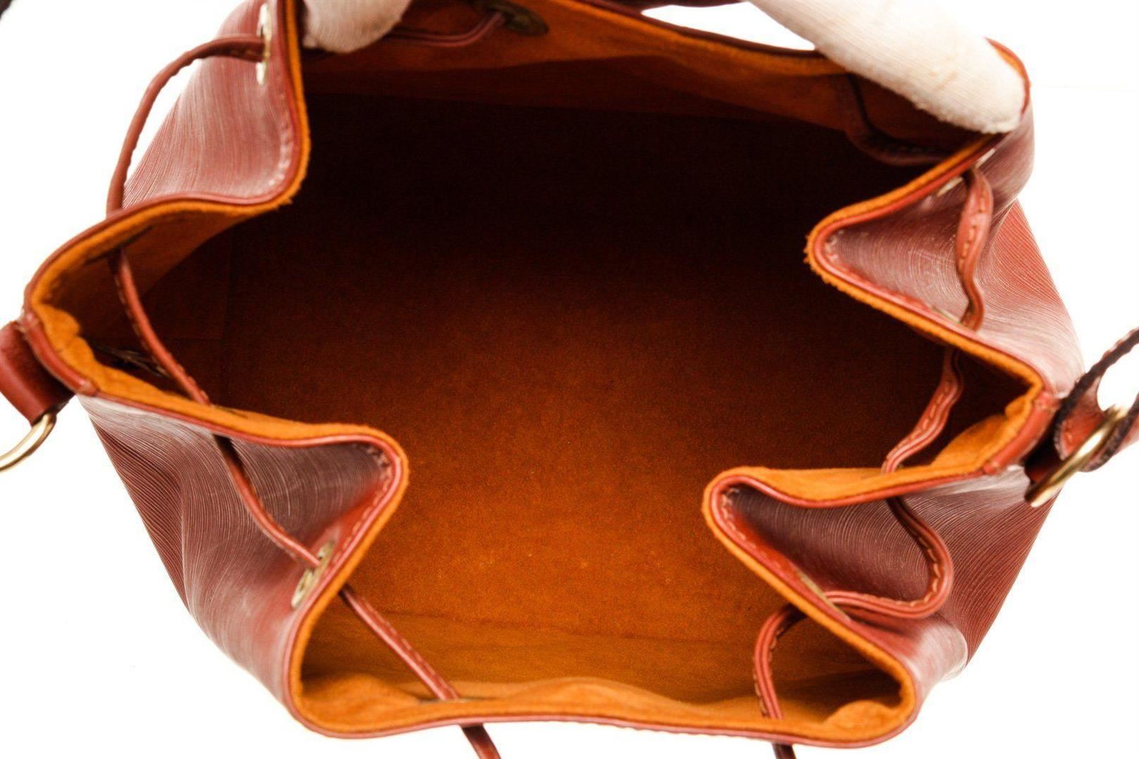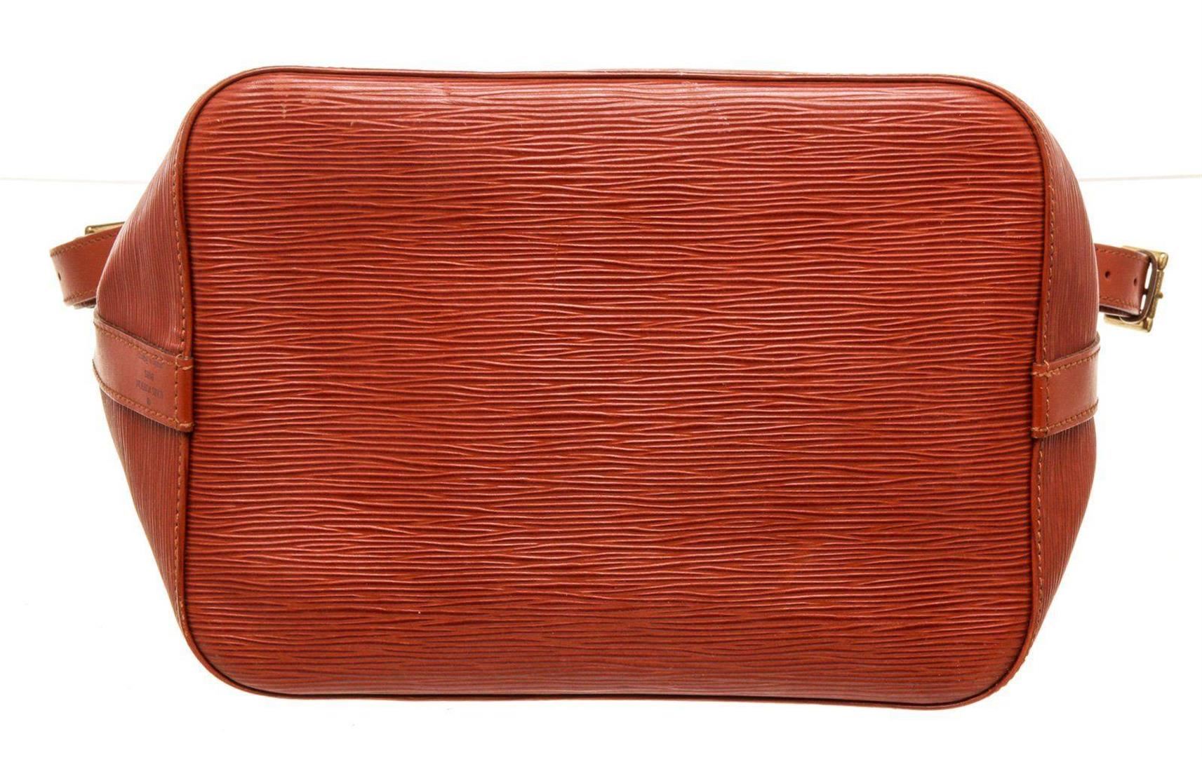 Louis Vuitton Brown Epi Leather Noe PM Bucket Bag with epi leather, gold-tone hardware, trim tan vachetta leather, shoulder adjustable strap and drawstring closure.