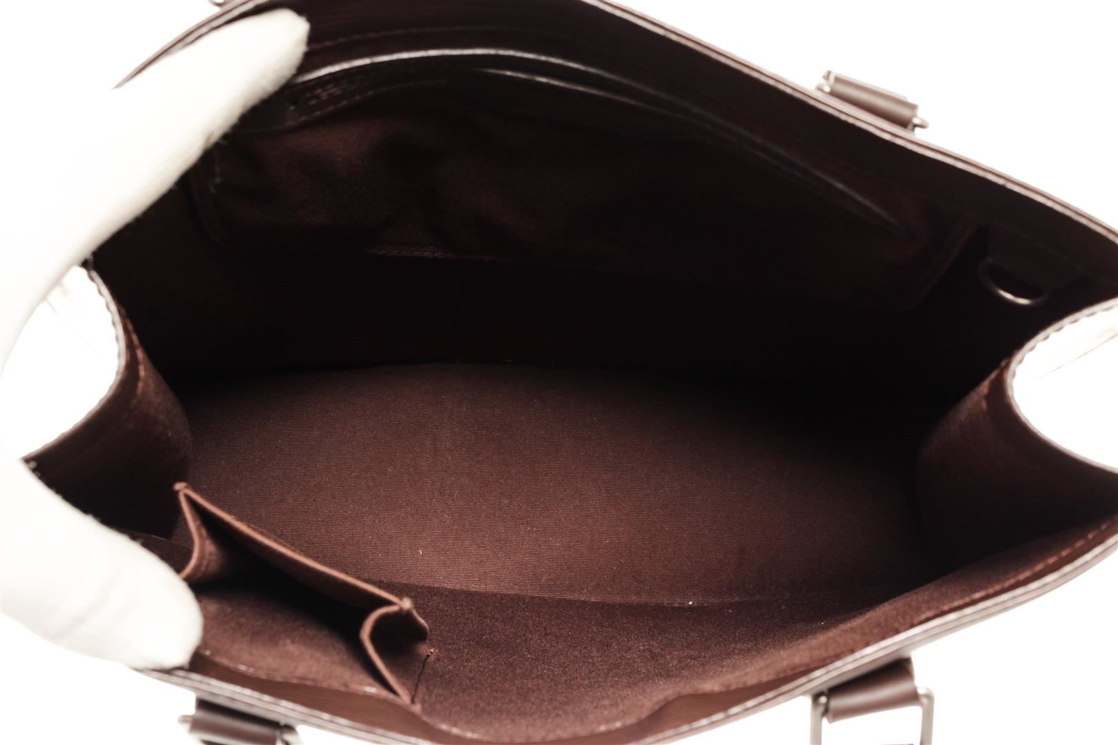 One Louis Vuitton Brown Epi Leather Sac Plat PM Tote Bag. Item is sold AS-IS. All available information is listed in the description and shown in the photo. Dark Brown epi leather Louis Vuitton Sac Plat with silver-tone hardware, dual tan rolled leather handles, dark brown canvas lining, dual interior slip pockets at interior wall and open top. .
