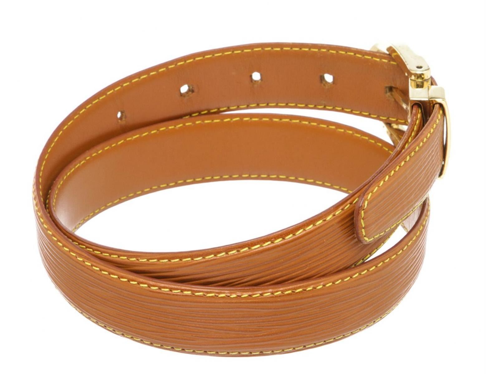 One Louis Vuitton Brown Epi Leather Skinny Classique Belt 85. Brown Epi leather Louis Vuitton Epi Skinny Classique belt with gold-tone buckle closure. Designer MKR
