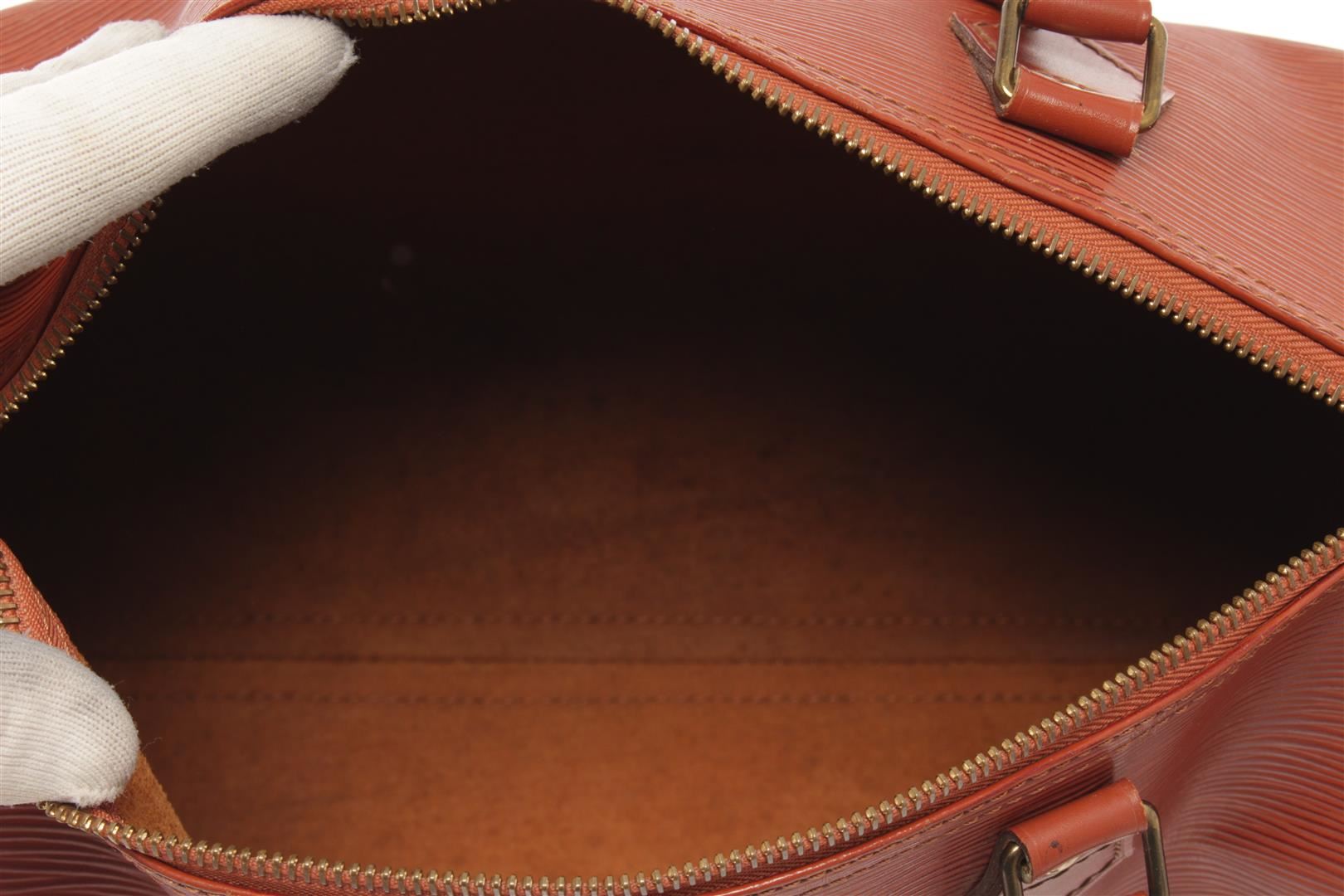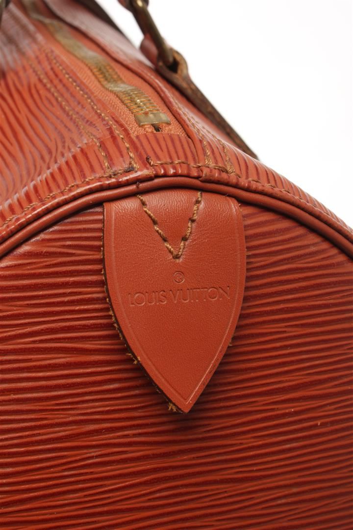 One Louis Vuitton Brown Epi Leather Speedy 30 Satchel Bag. Item is sold AS-IS. All available information is listed in the description and shown in the photo. louis vuitton brown epi leather speedy 30 satchel bag with gold-tone hardware, epi leather body, an exterior side slip pocket, rolled handles, a top zip closure, and an interior pocket. Depth 7.1 in, Handle 3.1 in, Height 8.7 in, Width 12.8 in/ Depth 18 cm, Handle 8 cm, Height 22 cm,, Width 32.5 cm