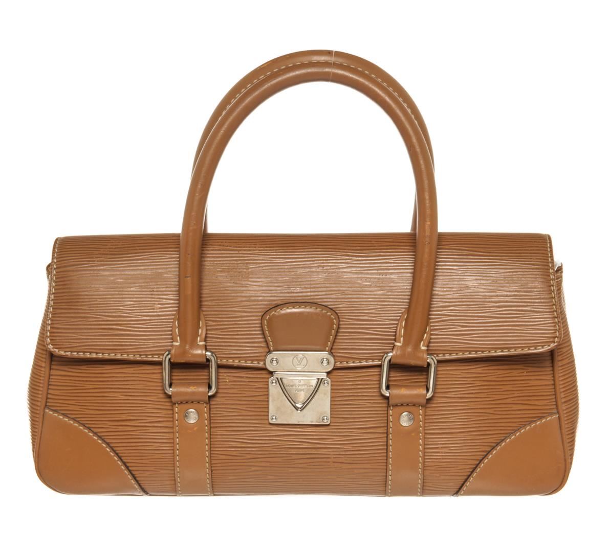 One Louis Vuitton Brown Epi Segur PM Handbag. Item is sold AS-IS. All available information is listed in the description and shown in the photo. Louis Vuitton Brown Epi Segur PM Handbag with silver-tone hardware, brown leather trim, 1 large exterior pockets, brown fabric lining, interior pockets, dual top handless, and press lock closure.