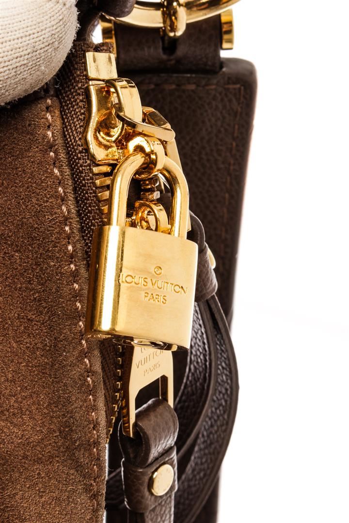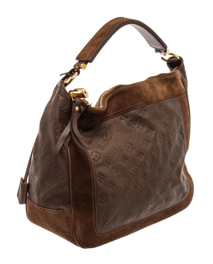 Louis Vuitton Brown Leather Empreinte Odesius Hobo Bag. All available information is listed in the description and shown in the photos. Louis Vuitton Brown Leather Empreinte Odesius Hobo Bag with brown empreinte leather, brass hardware, leather trim, flat handle, canvas lining & dual interior pockets, protective feet at base, zip closure at top. Height: 13.5" Width: 15.75" Depth: 6", Handle Drop: 4" / 34.29 x 40.00 x 15.24 Cm
