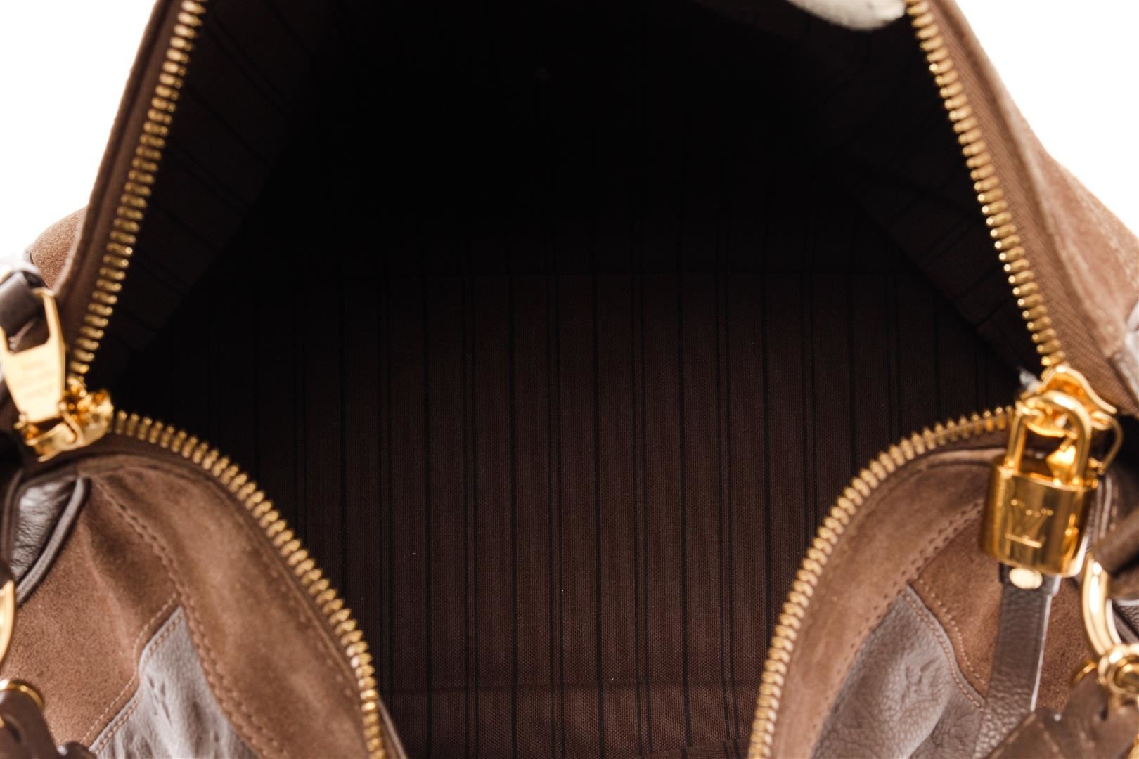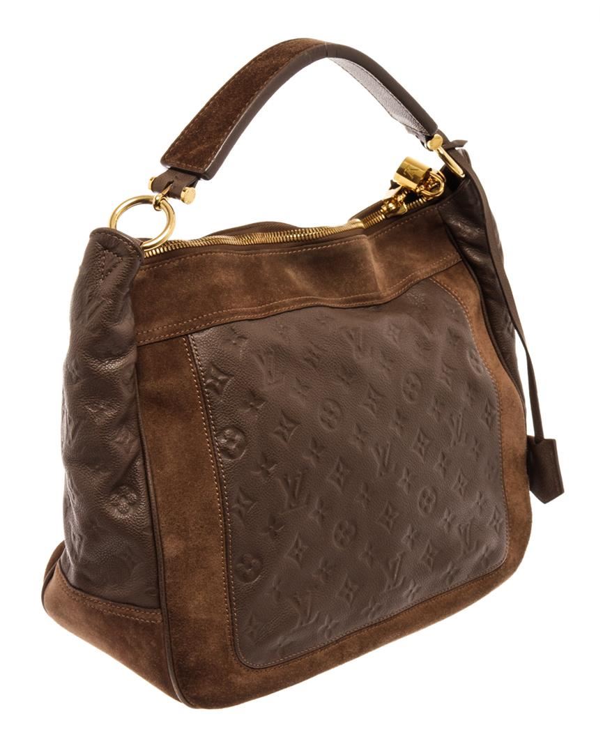 Louis Vuitton Brown Leather Empreinte Odesius Hobo Bag. All available information is listed in the description and shown in the photos. Louis Vuitton Brown Leather Empreinte Odesius Hobo Bag with brown empreinte leather, brass hardware, leather trim, flat handle, canvas lining & dual interior pockets, protective feet at base, zip closure at top. Height: 13.5" Width: 15.75" Depth: 6", Handle Drop: 4" / 34.29 x 40.00 x 15.24 Cm