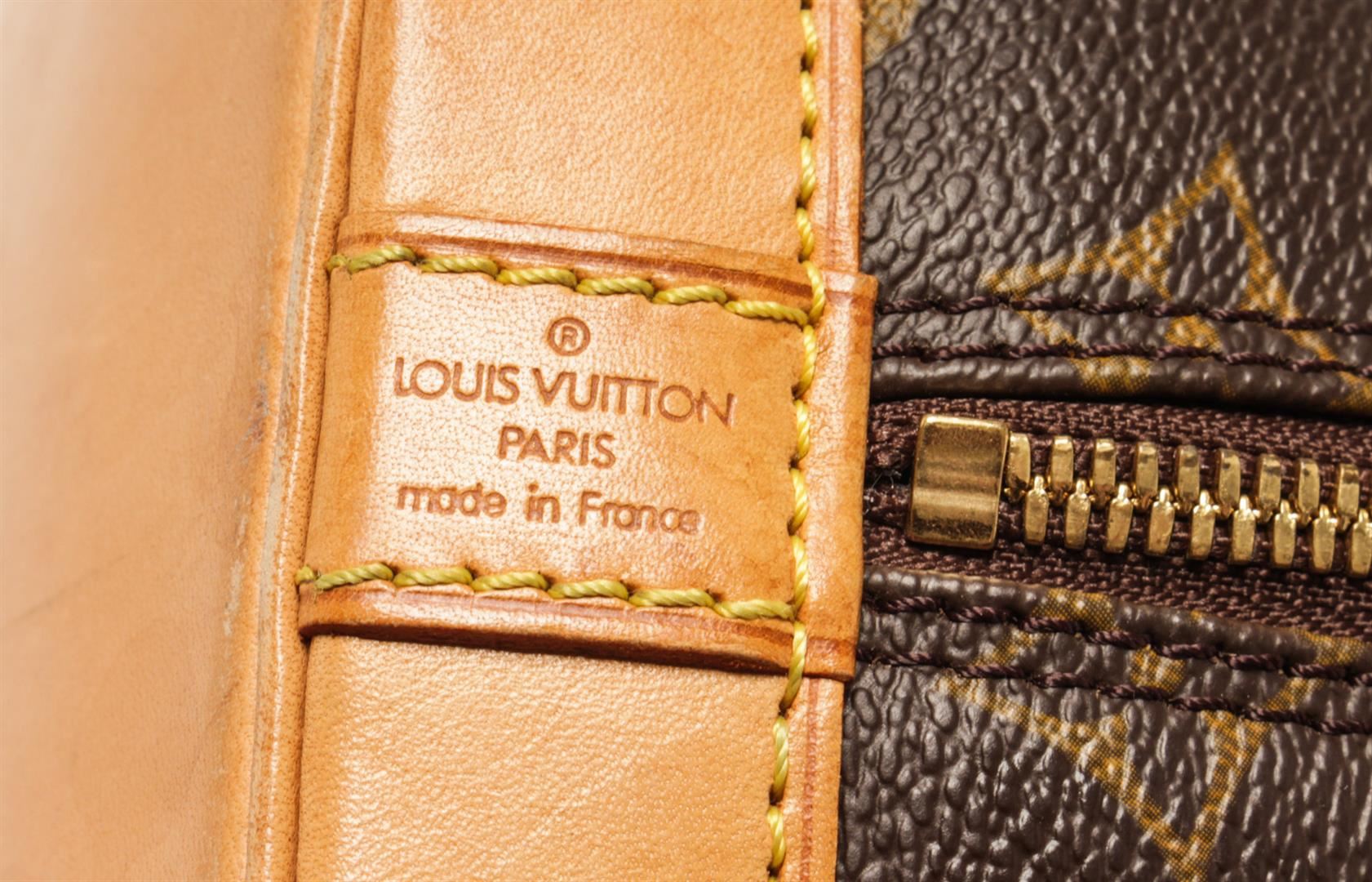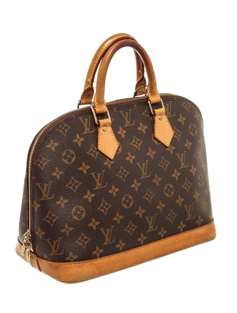 One Louis Vuitton Brown Monogram Canvas Alma Handbag. Item is sold AS-IS. All available information is listed in the description and shown in the photo. Louis Vuitton Brown Monogram Canvas Alma PM Handbag with the alma pm features a monogram canvas body, rolled leather handles, a leather bottom, a top zip closure, and an interior slip pocket. W: 12.20" x H: 9.44" x D: 6.69" / W31cm x H24cm x D17cm
