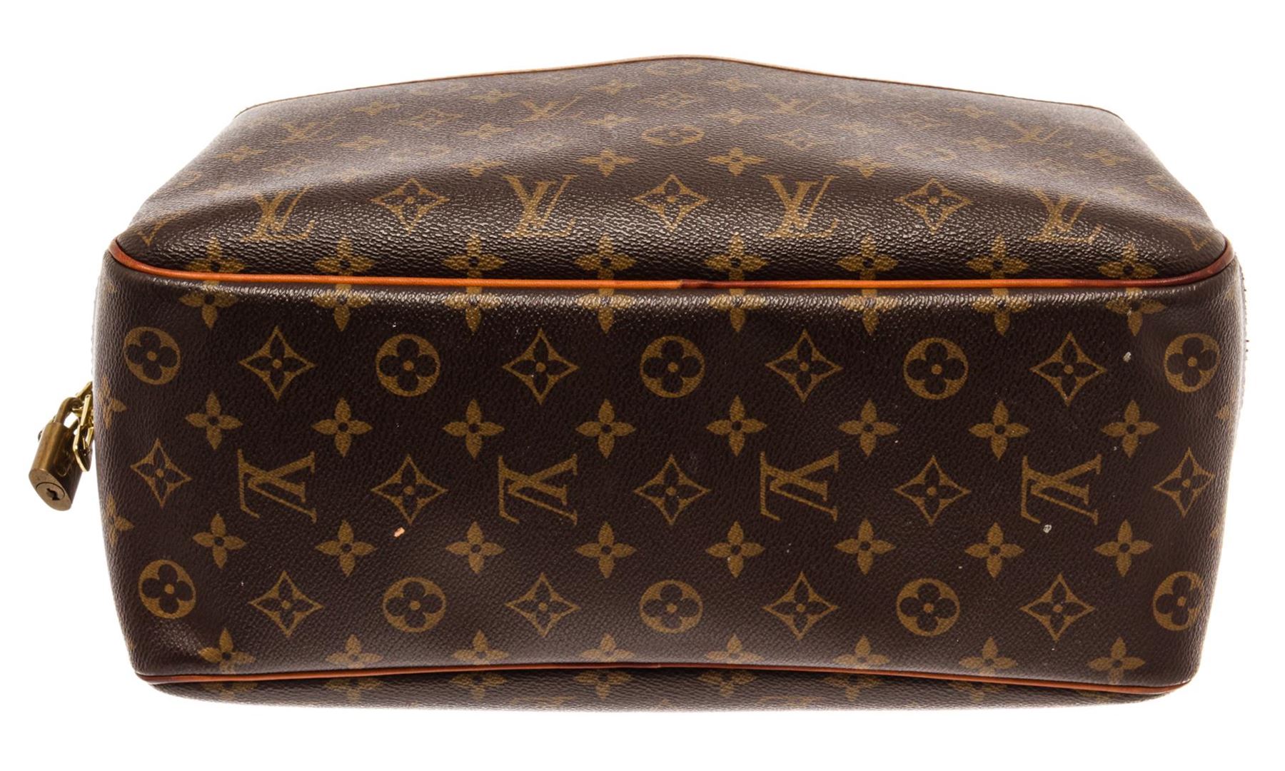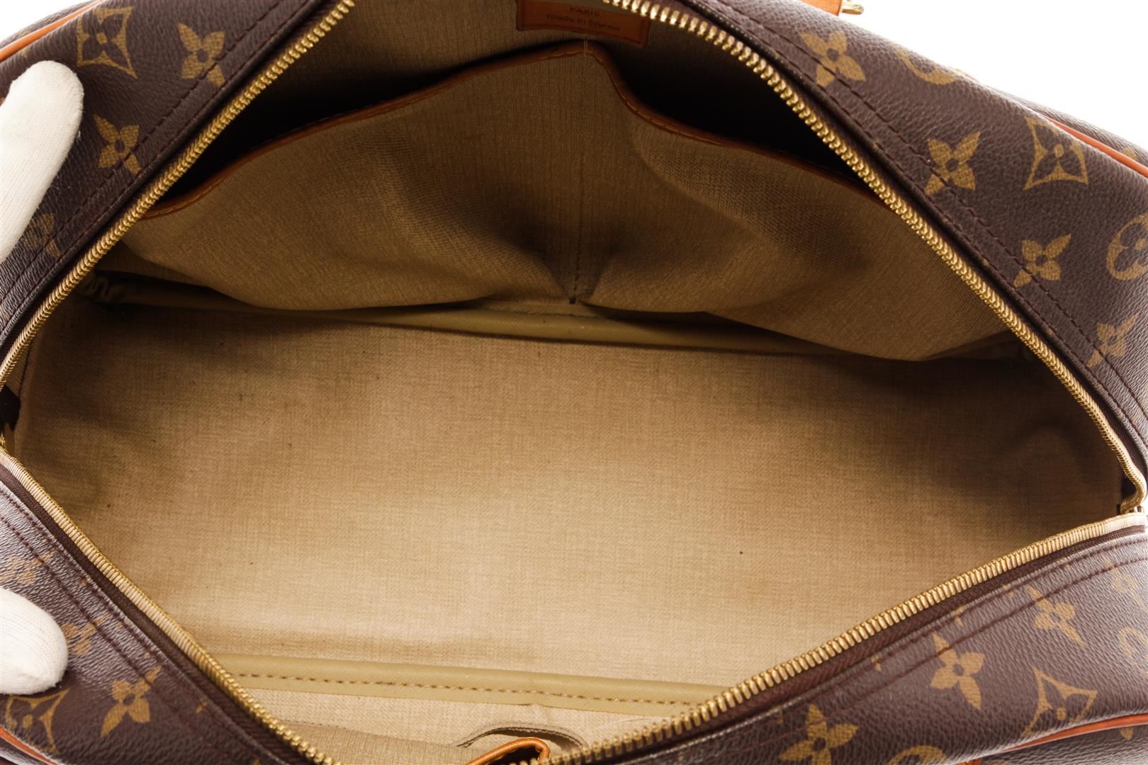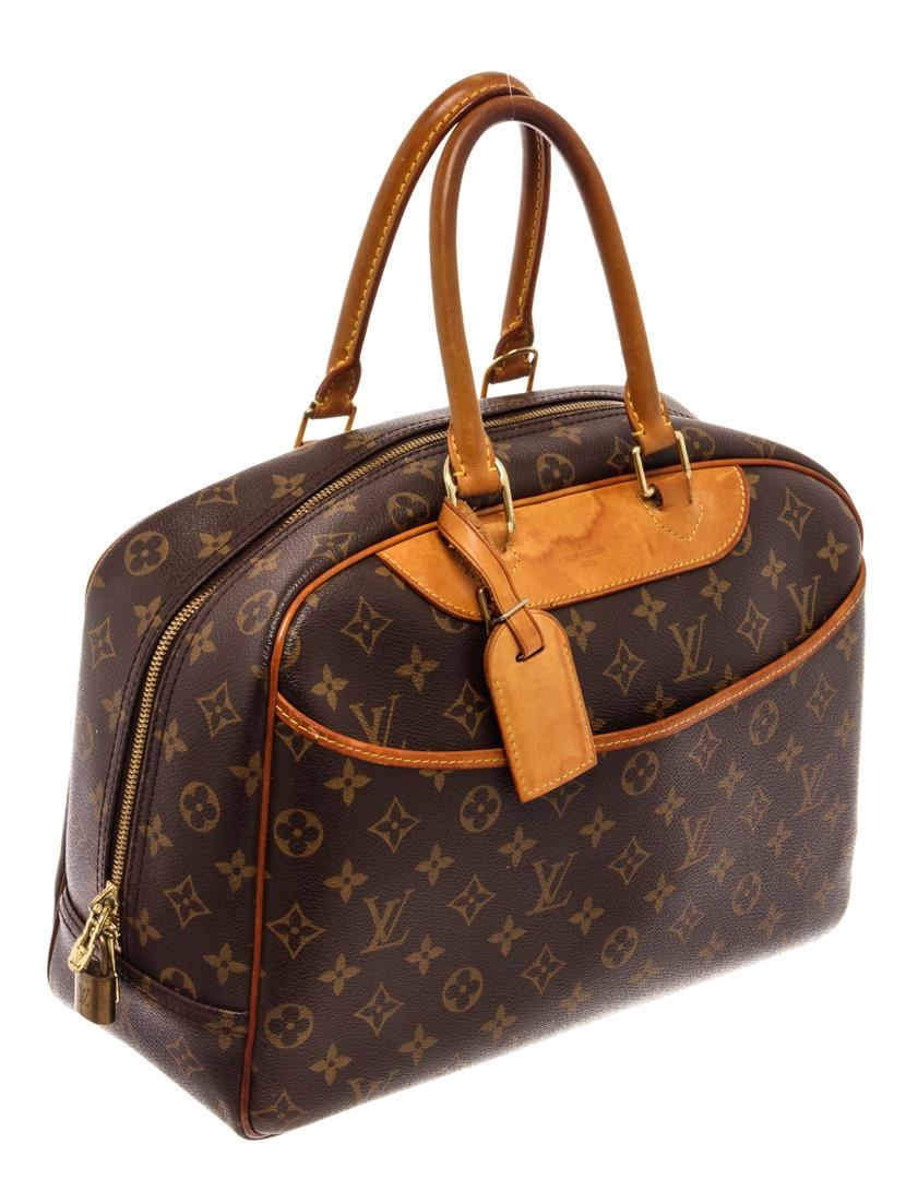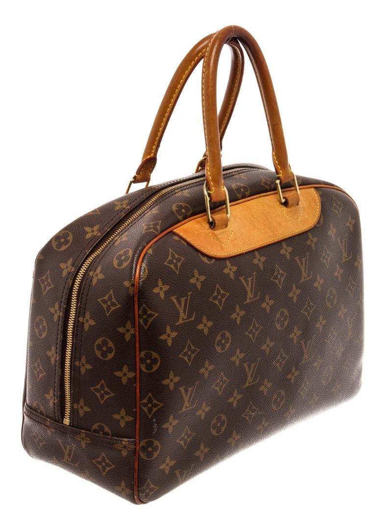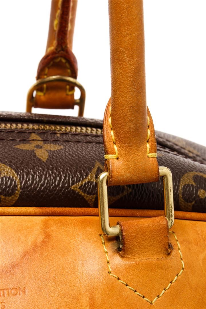 Louis Vuitton Brown Monogram Canvas Deauville Satchel Bag. All available information is listed in the description and shown in the photos. Louis Vuitton Brown Monogram Canvas Deauville Satchel Bag with gold-tone hardware, monogram canvas, leather tag, debossed logo, two-way zip fastening, two rounded top handles, front patch pocket, internal patch pockets, internal logo patch. Depth 5.9 in, Handle 4.3 in, Height 11.4 in, Width 13.8 in / Depth 15 cm, Handle 11 cm, Height 29 cm, Width 35 cm