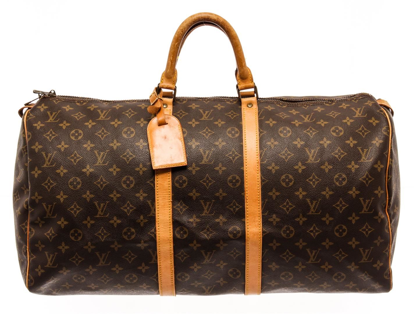 Louis Vuitton Brown Monogram Canvas Keepall 55 Travel Bag. All available information is listed in the description and shown in the photos. Louis Vuitton Brown Monogram Canvas Keepall 55 Travel Bag with gold-tone hardware, trim tan vachetta leather, brown canvas lining, leather trim inside, golden brass pieces, rounded leather handles. W55cm x H27cm x D25cm / 21.65" x 10.62" x 9.84"