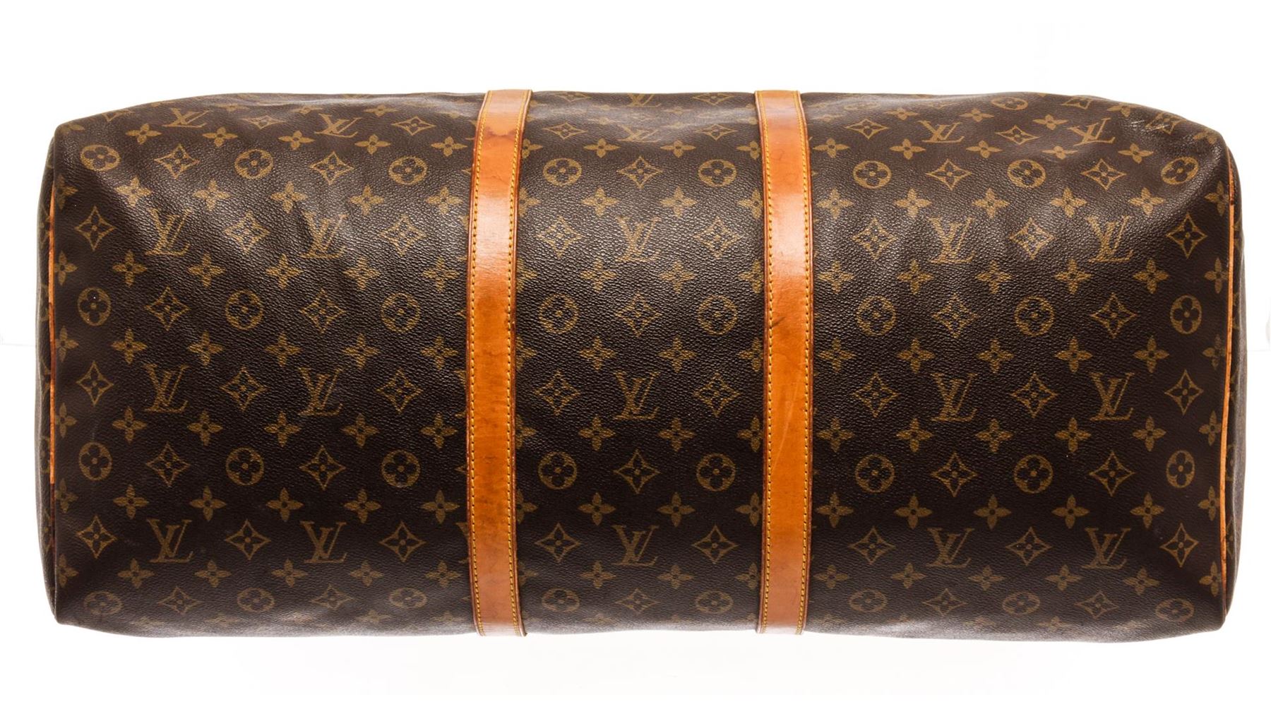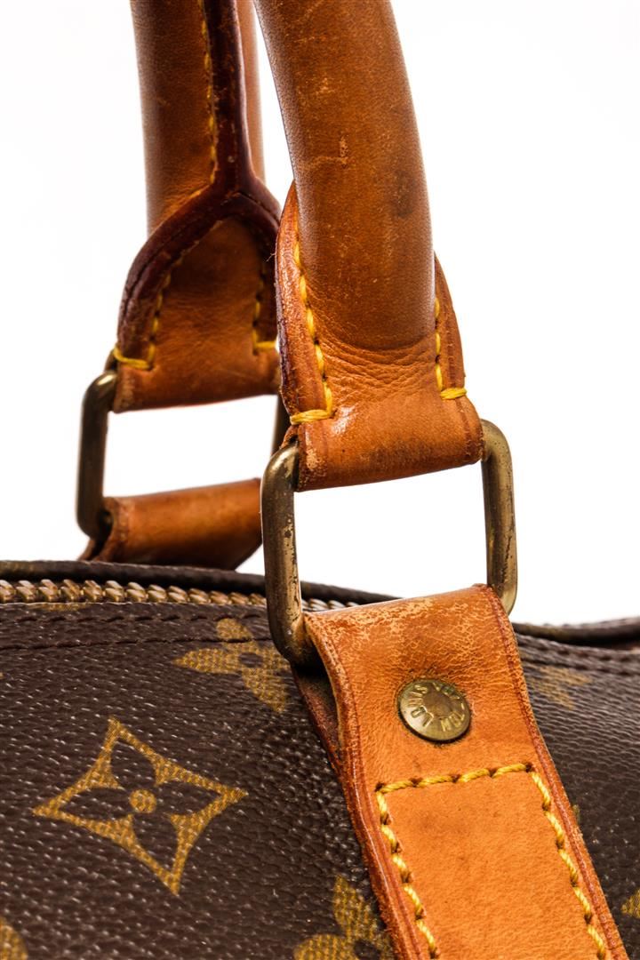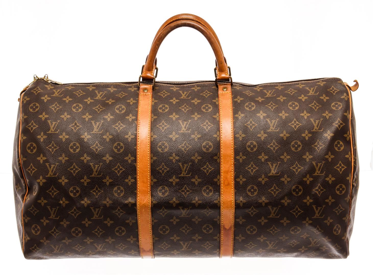 Louis Vuitton Brown Monogram Canvas Keepall 60 Travel Bag. All available information is listed in the description and shown in the photos. Louis Vuitton Brown Monogram Canvas Keepall 60 Travel Bag with monogram canvas body, rolled vachetta handles, and a top zip closure. 13" L x 24" W x 9.1" D /33.02 x 60.96 x 23.11 cm