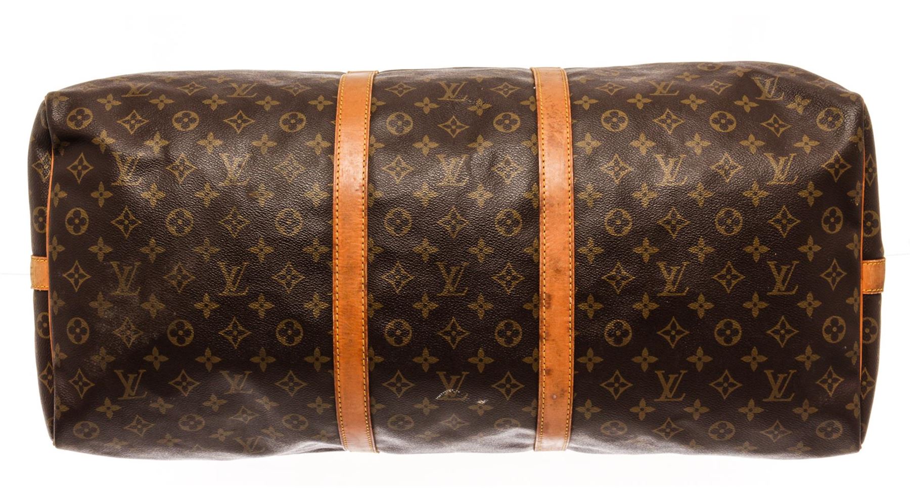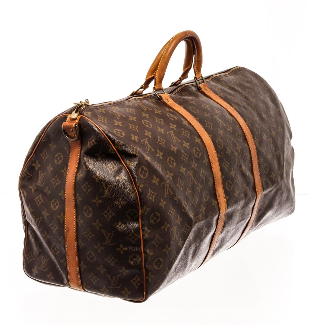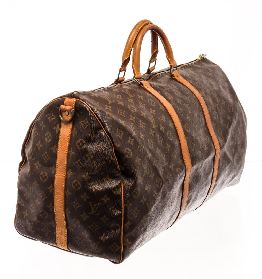 Louis Vuitton Brown Monogram Canvas Keepall Bandouliere 60 Travel Bag. All available information is listed in the description and shown in the photos. Louis Vuitton Brown Monogram Canvas Keepall Bandouliere 60 Travel Bag with Brown Printed, Brass Hardware, Rolled Handles & Single Adjustable Shoulder Strap, Canvas Lining, Zip Closure at Top. Height: 12.5", Width: 23.75", Depth: 10.25" / 31.75 x 60.32 x 26.03 cm