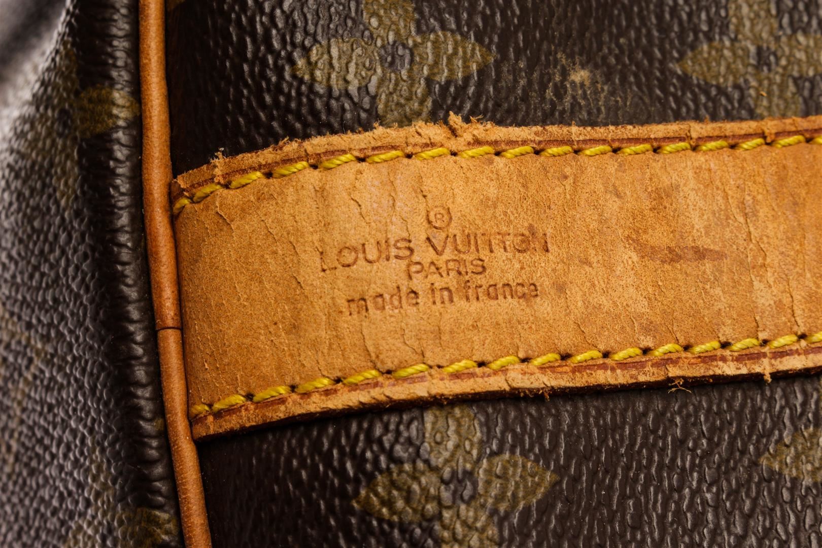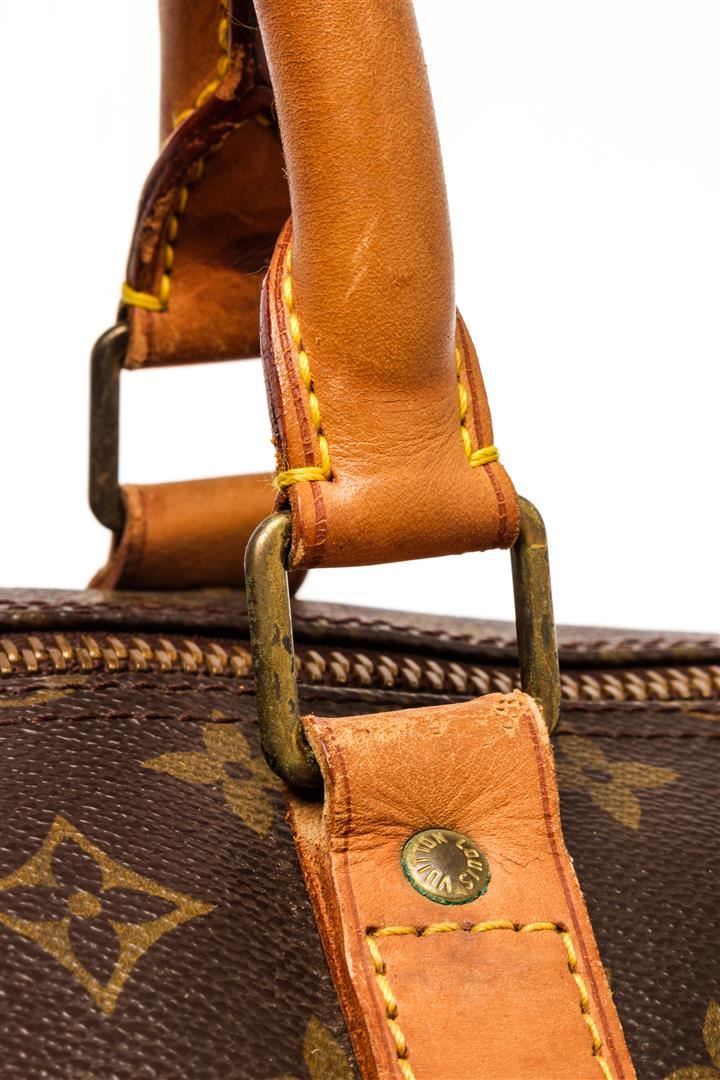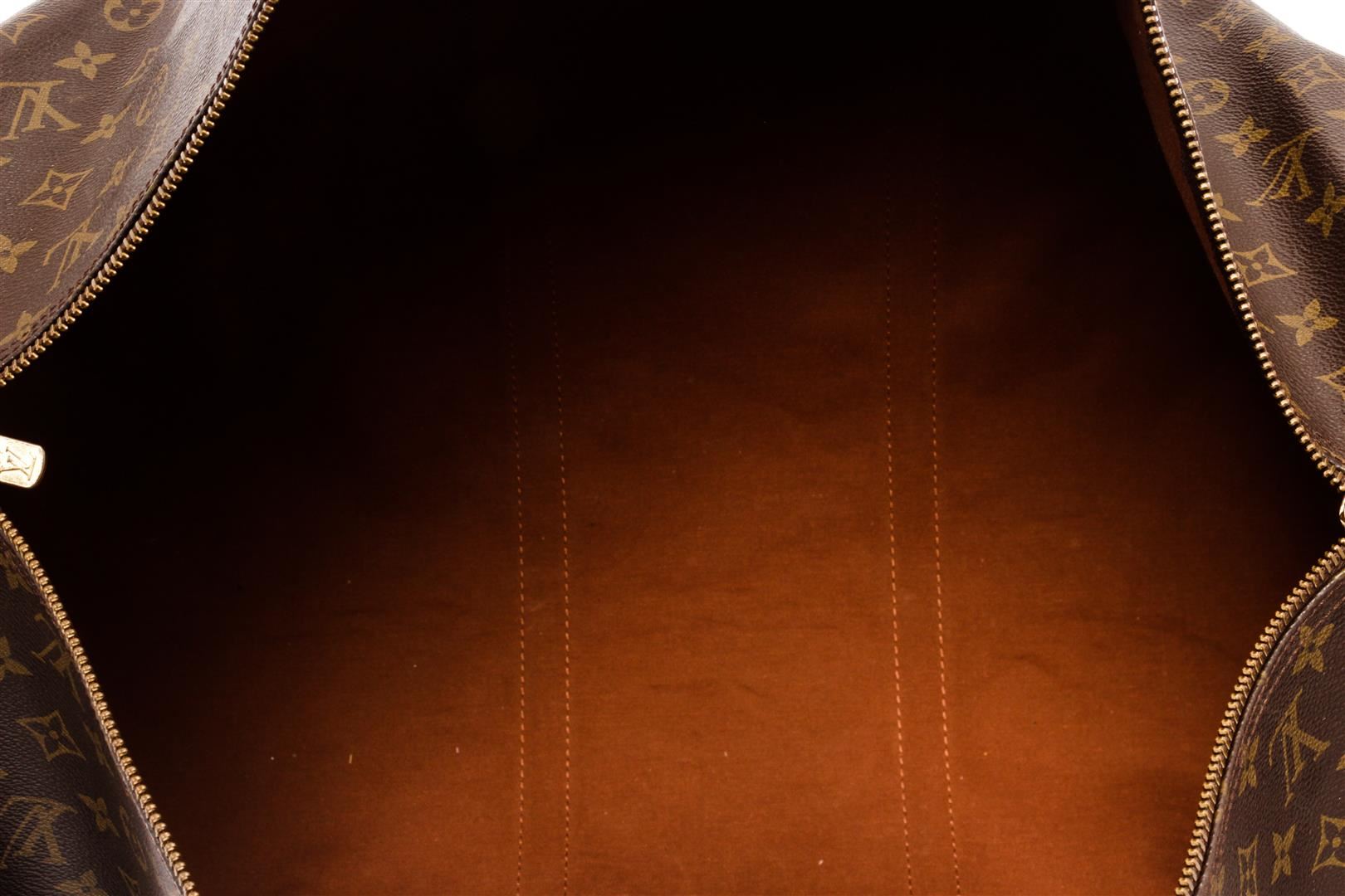 Louis Vuitton Brown Monogram Canvas Keepall Bandouliere 60 Travel Bag. All available information is listed in the description and shown in the photos. Louis Vuitton Brown Monogram Canvas Keepall Bandouliere 60 Travel Bag with Brown Printed, Brass Hardware, Rolled Handles & Single Adjustable Shoulder Strap, Canvas Lining, Zip Closure at Top. Height: 12.5", Width: 23.75", Depth: 10.25" / 31.75 x 60.32 x 26.03 cm