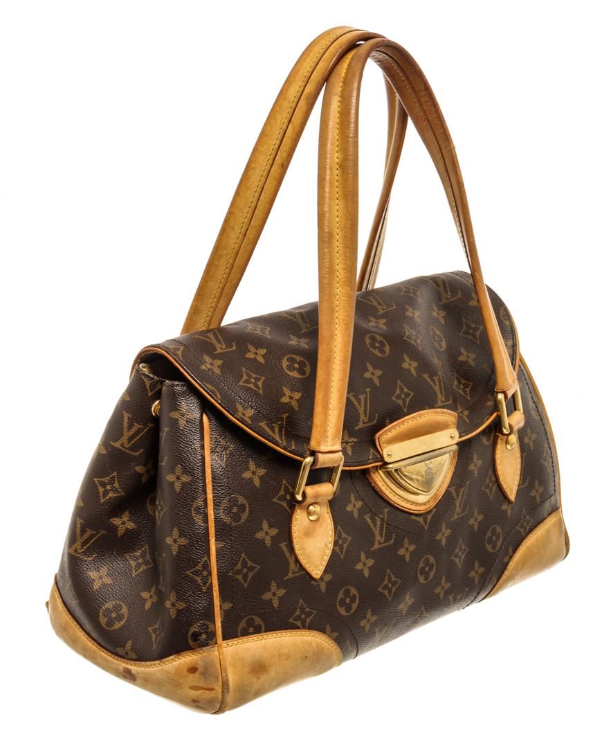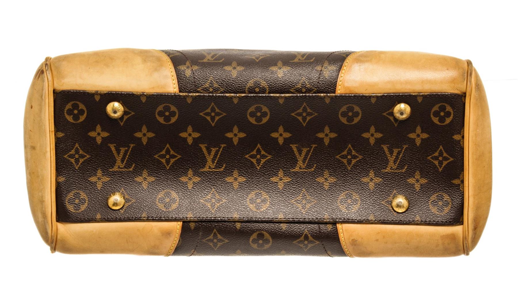 One Louis Vuitton Brown Monogram Canvas Leather Beverly GM Shoulder Bag. Item is sold AS-IS. All available information is listed in the description and shown in the photo. Brown and tan monogram coated canvas Louis Vuitton Beverly GM with gold-tone hardware, tan vachetta leather accents, dual flat shoulder straps, exterior pocket at back, beige Alcantara lining, dual pockets at interior walls; one with snap closure and push-lock closure at front flap.
