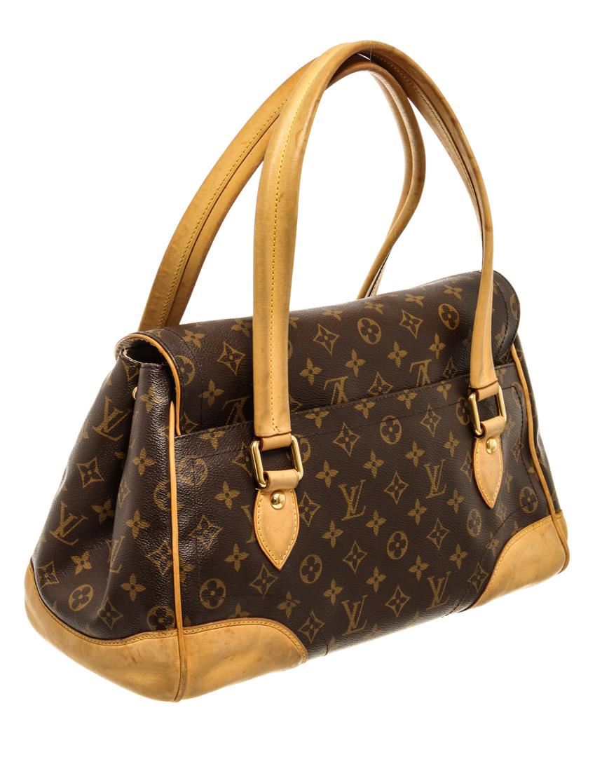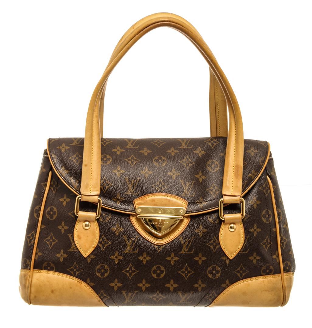 One Louis Vuitton Brown Monogram Canvas Leather Beverly GM Shoulder Bag. Item is sold AS-IS. All available information is listed in the description and shown in the photo. Brown and tan monogram coated canvas Louis Vuitton Beverly GM with gold-tone hardware, tan vachetta leather accents, dual flat shoulder straps, exterior pocket at back, beige Alcantara lining, dual pockets at interior walls; one with snap closure and push-lock closure at front flap.