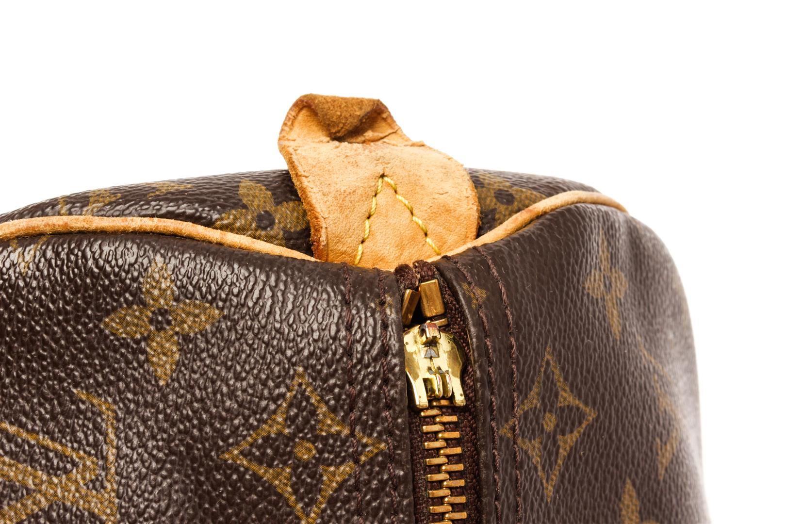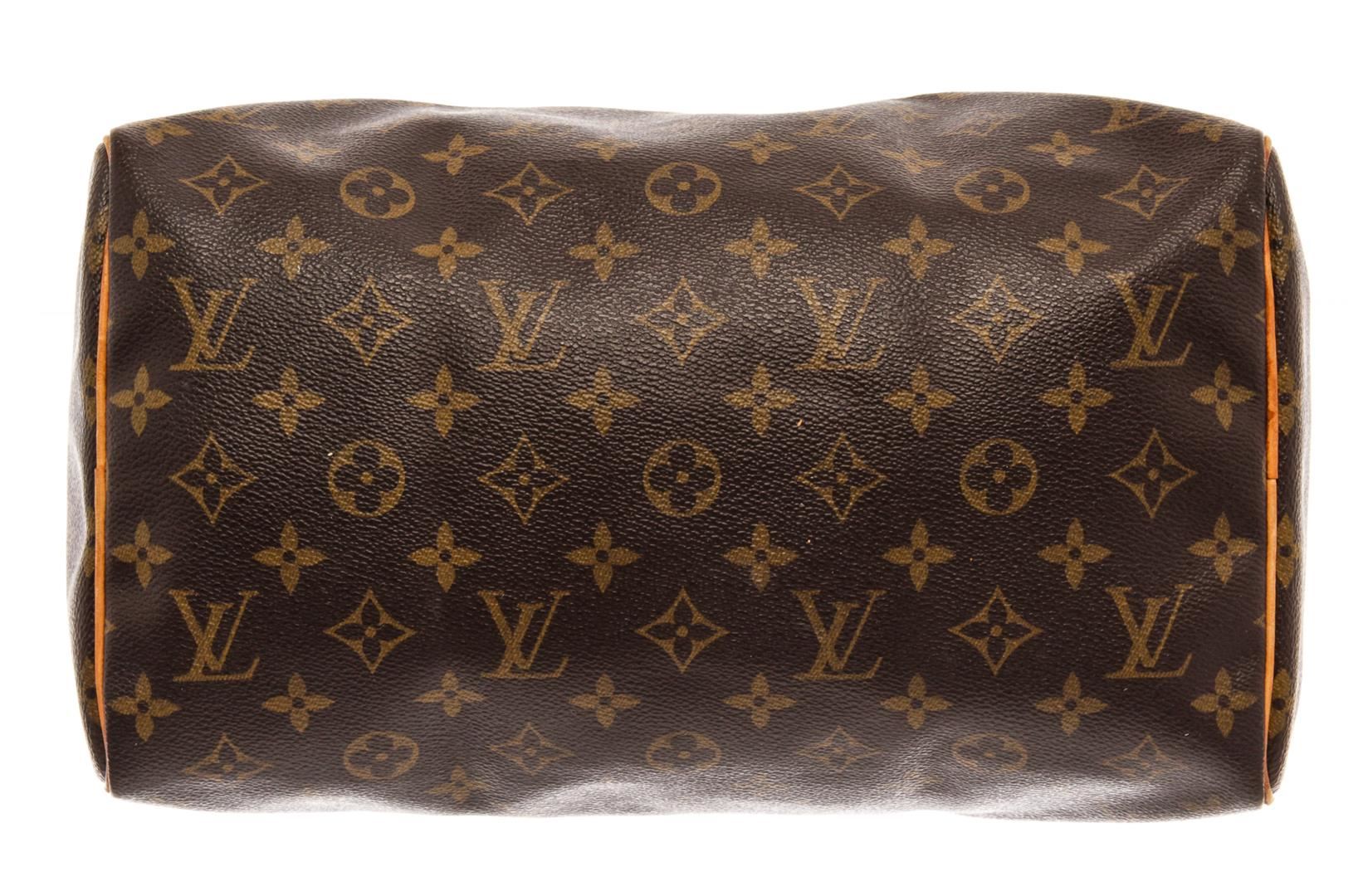 Louis Vuitton Brown Monogram Canvas Leather Speedy 30 Satchel Bag. All available information is listed in the description and shown in the photos. Louis Vuitton Brown Monogram Canvas Leather Speedy 30 Satchel Bag with brass hardware, leather trim, rolled handles, canvas lining & single interior pocket, zip closure at top. Height: 9.5" Width: 11.5" Depth: 7", Handle Drop: 3.5" / 24.13 x 29.21 x 17.78 Cm