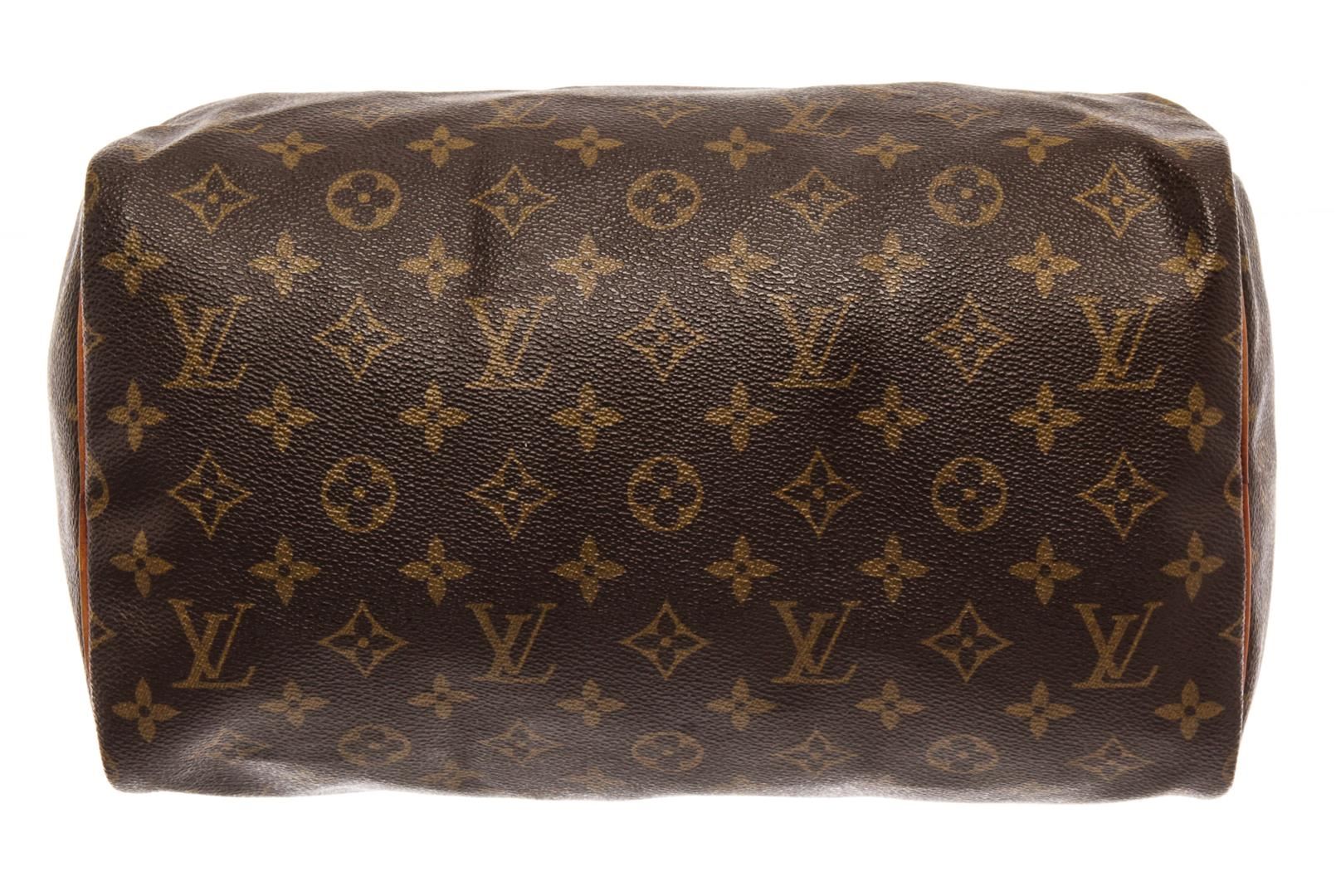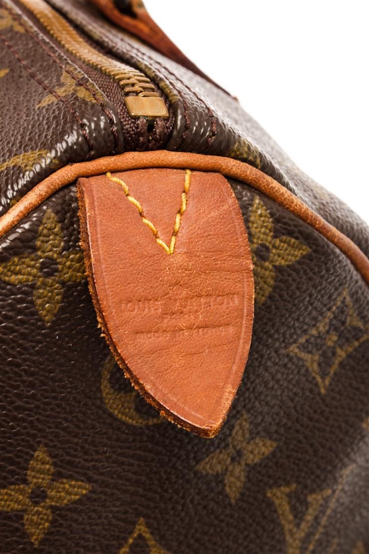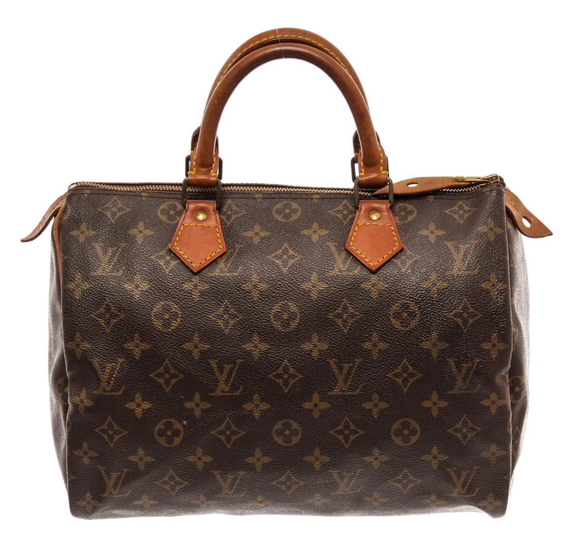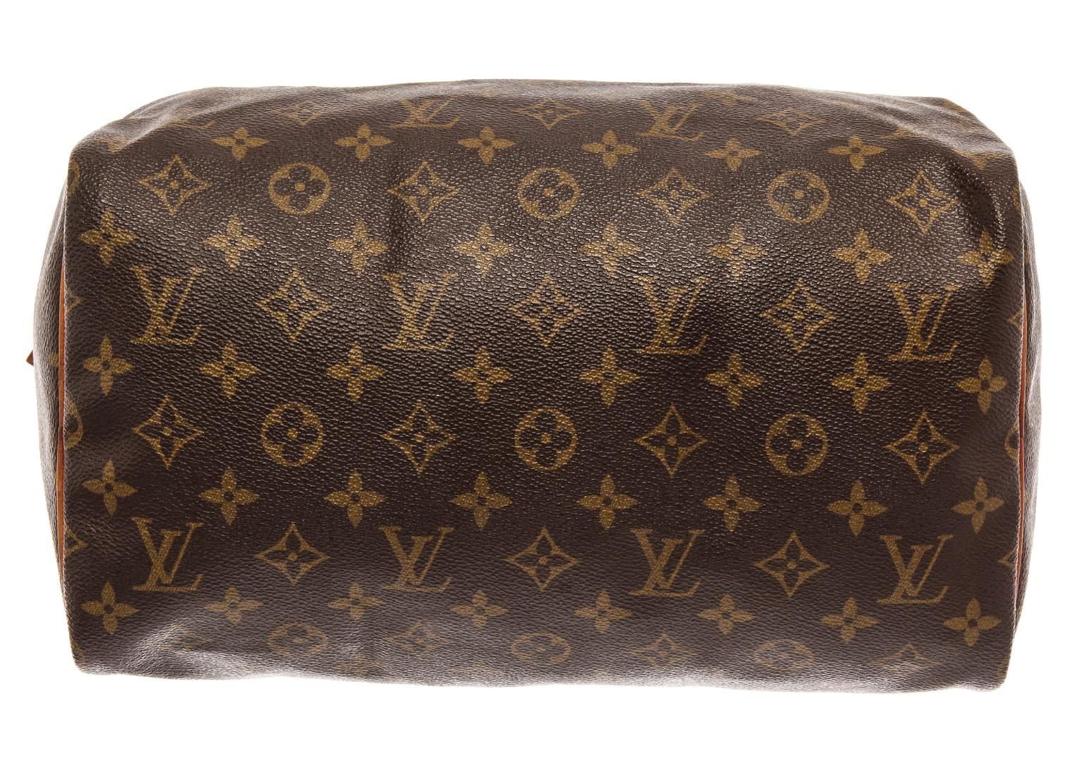 Louis Vuitton Brown Monogram Canvas Leather Speedy 30 Satchel Bag. All available information is listed in the description and shown in the photos. Louis Vuitton Brown Monogram Canvas Leather Speedy 30 Satchel Bag with brown canvas, brass hardware, leather trim, dual rolled handles, canvas lining & single interior pocket, zip closure at top. Height: 9.5" Width: 12" Depth: 7", Handle Drop: 3.5" / 24.13 x 30.48 x 17.78 Cm