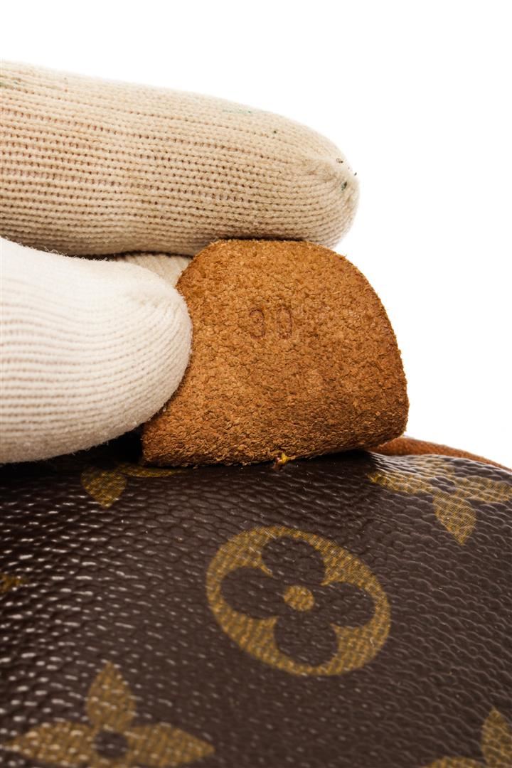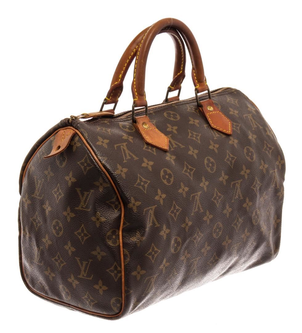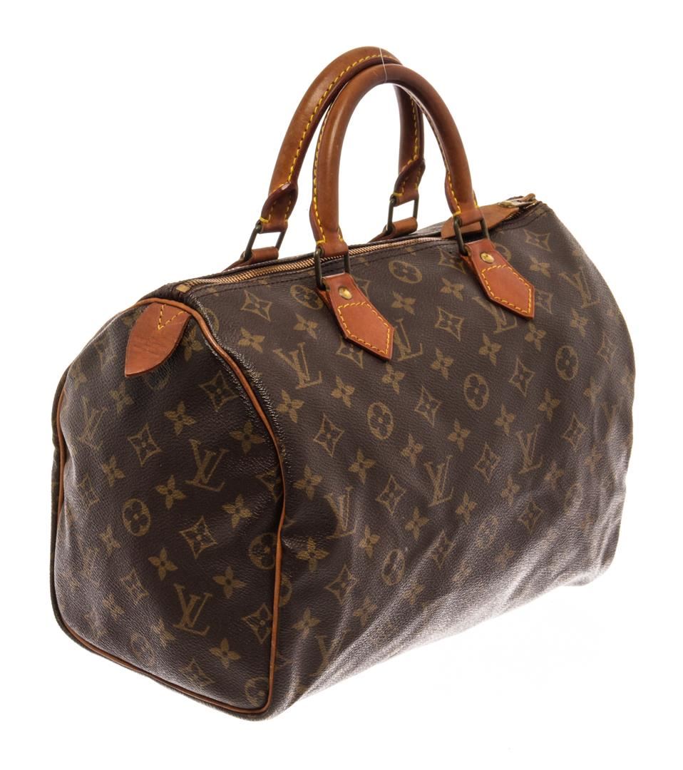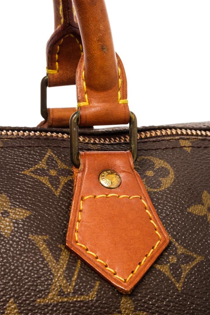 Louis Vuitton Brown Monogram Canvas Leather Speedy 30 Satchel Bag. All available information is listed in the description and shown in the photos. Louis Vuitton Brown Monogram Canvas Leather Speedy 30 Satchel Bag with brown canvas, brass hardware, leather trim, dual rolled handles, canvas lining & single interior pocket, zip closure at top. Height: 9.5" Width: 12" Depth: 7", Handle Drop: 3.5" / 24.13 x 30.48 x 17.78 Cm