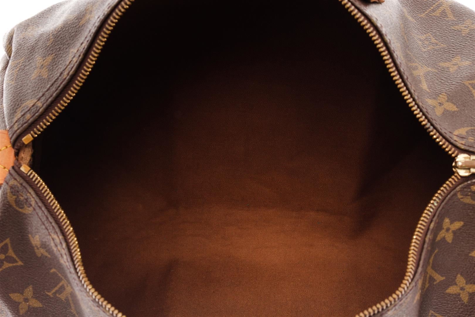 Louis Vuitton Brown Monogram Canvas Leather Speedy 35 Satchel Bag. All available information is listed in the description and shown in the photos. Louis Vuitton Brown Monogram Canvas Leather Speedy 35 Satchel Bag with brass hardware, dual rolled handles, leather trim embellishment, canvas lining & single interior pocket, zip closure at top. Height: 10.25" Width: 13.75" Depth: 7", Handle Drop: 3.75" / 26.03 x 34.92 x 17.78 Cm