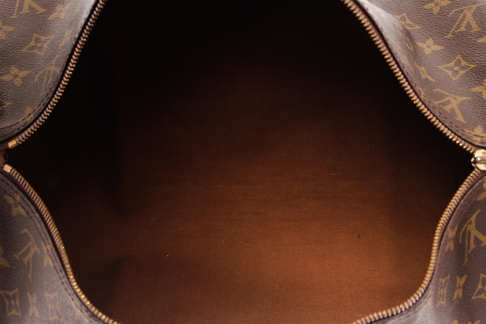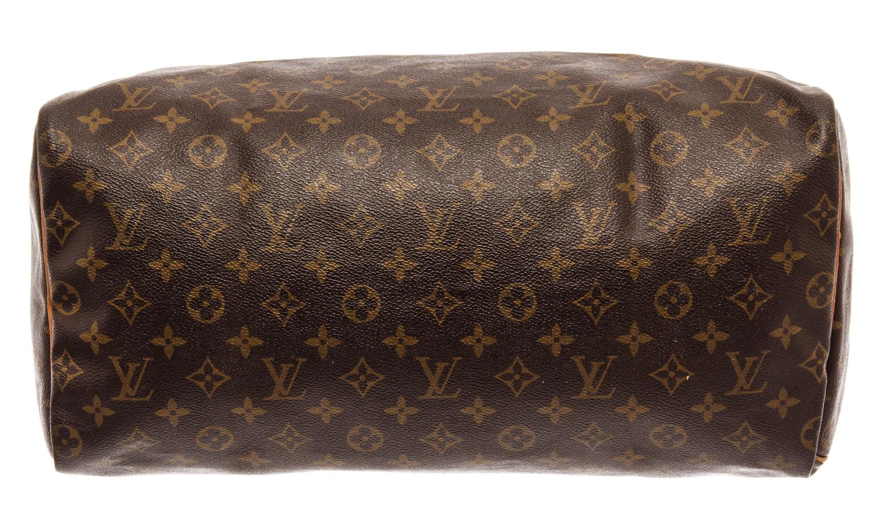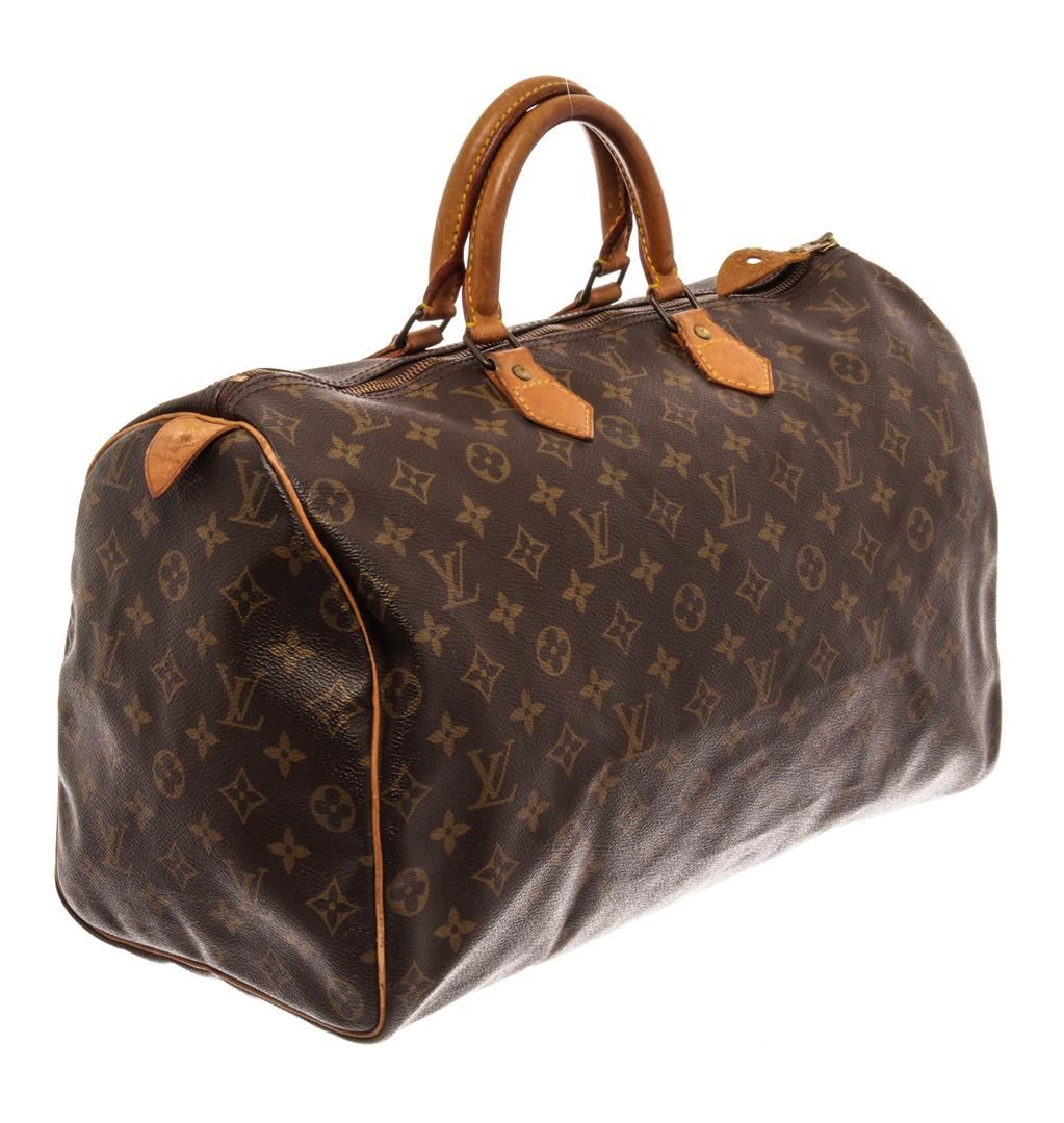 Louis Vuitton Brown Monogram Canvas Leather Speedy 40 Bag. All available information is listed in the description and shown in the photos. Louis Vuitton Brown Monogram Canvas Leather Speedy 40 Bag with gold-tone hardware, leather trim, rolled handles & dual shoulder straps, leather trim embellishment, canvas lining & single interior pocket, zip closure at top. Height: 10" Width: 15.75" Depth: 7.5", Handle Drop: 3.75", / 25.4 x 40.00 x 19.05 Cm