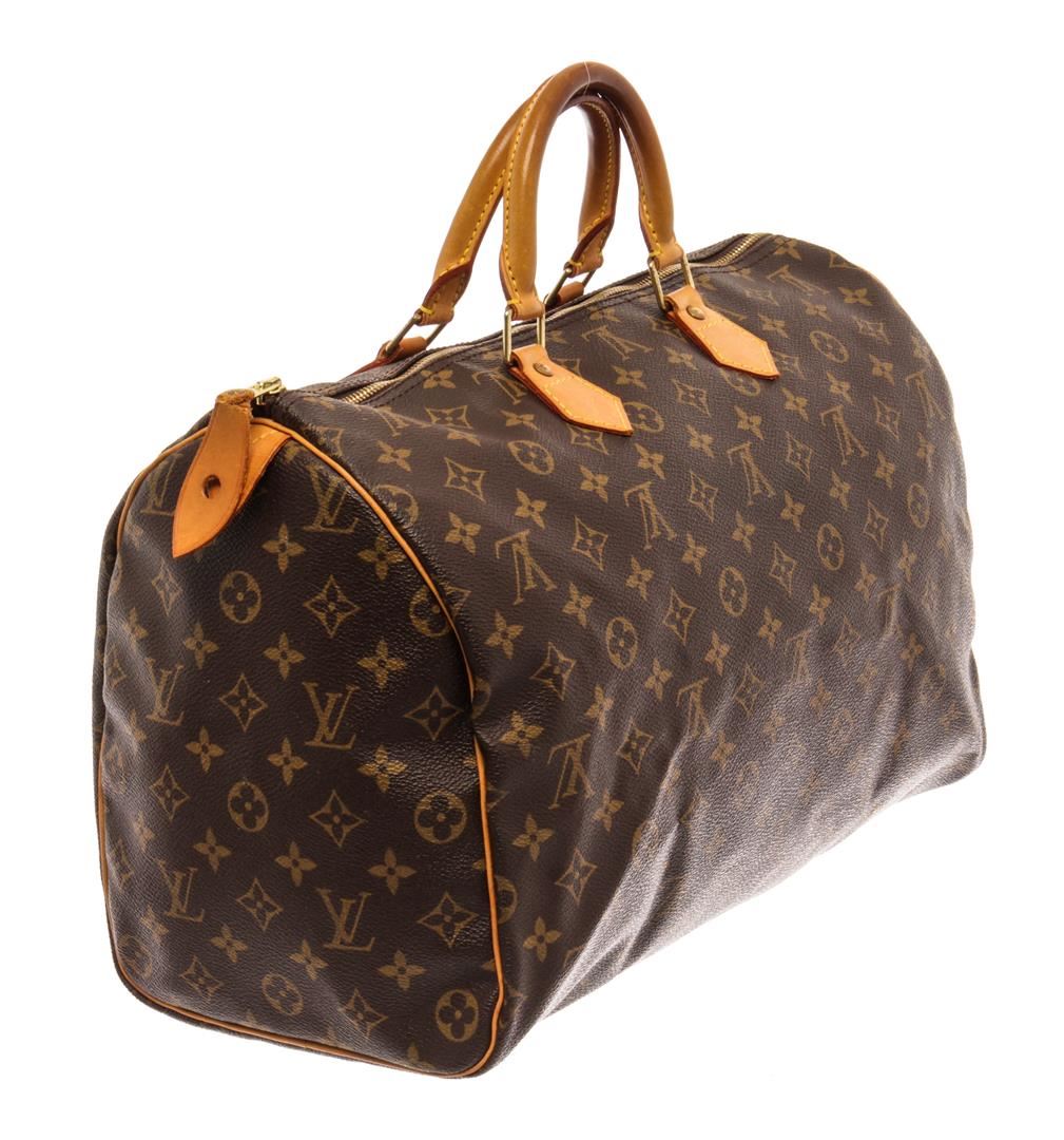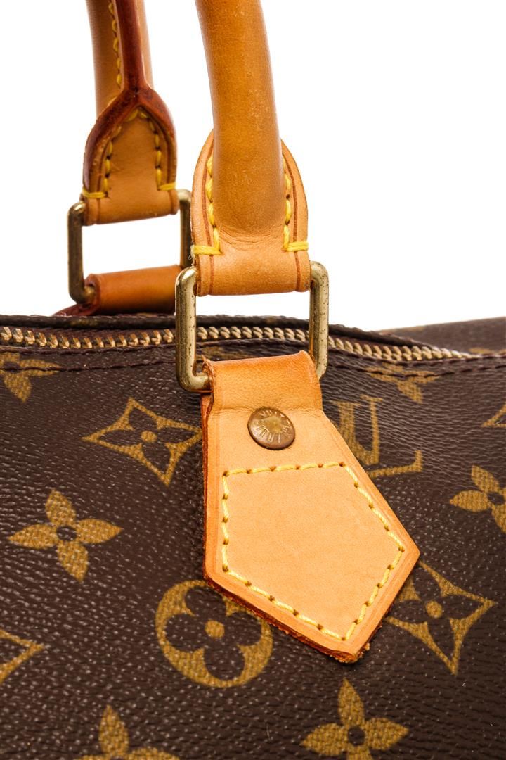 Louis Vuitton Brown Monogram Canvas Leather Speedy 40 Satchel Bag. All available information is listed in the description and shown in the photos. Louis Vuitton Brown Monogram Canvas Leather Speedy 40 Satchel Bag with brass hardware, leather trim, rolled handles & dual shoulder straps, leather trim embellishment, canvas lining & single interior pocket, zip closure at top. Height: 14" Width: 15" Depth: 8", Handle Drop: 4" / 35.56 x 38.1 x 20.32 Cm