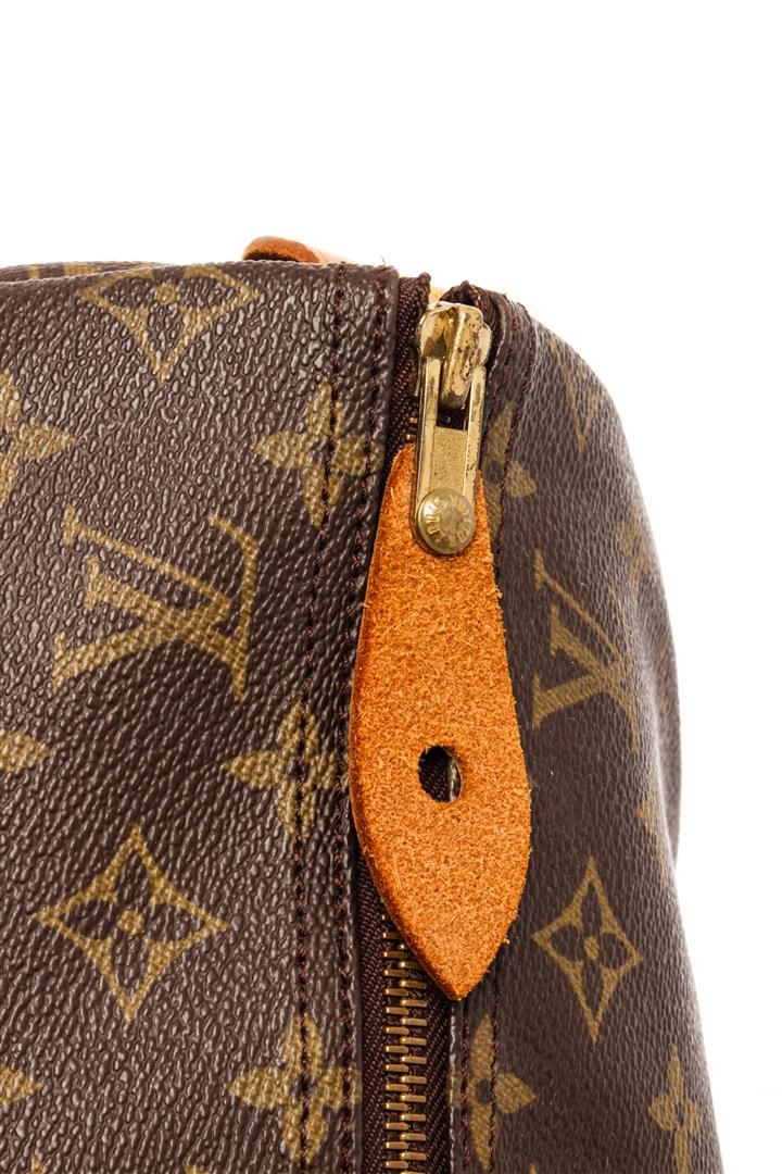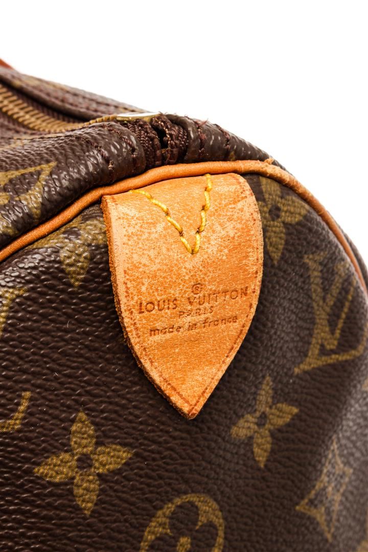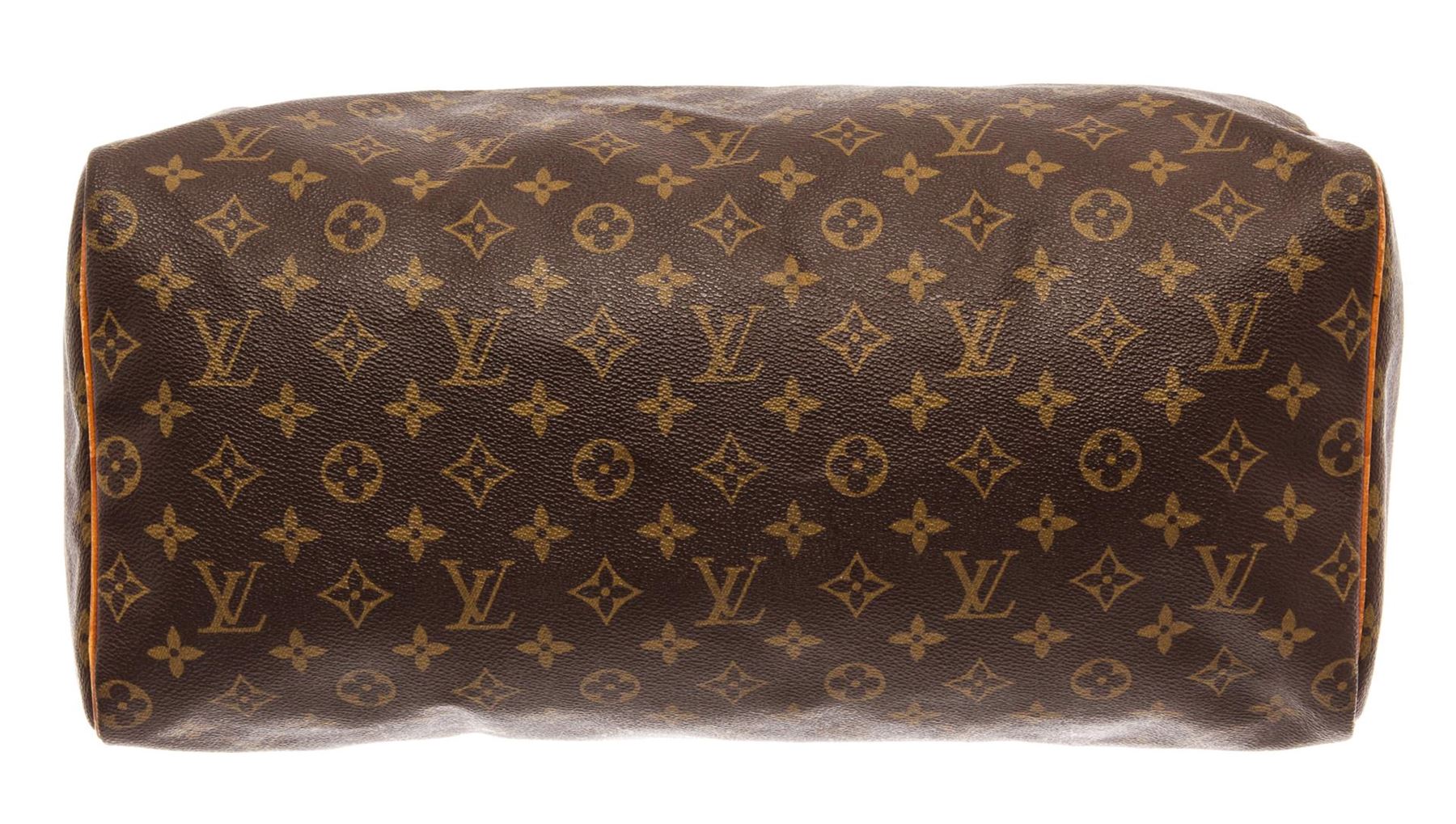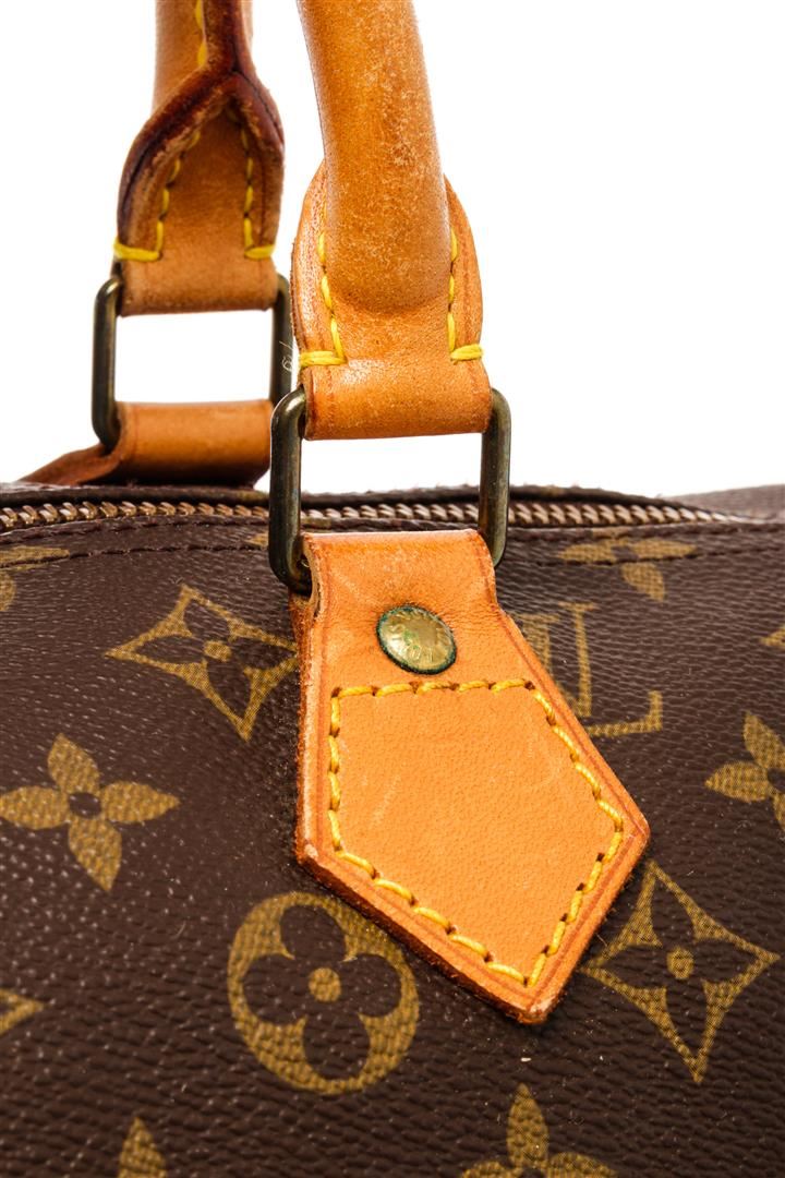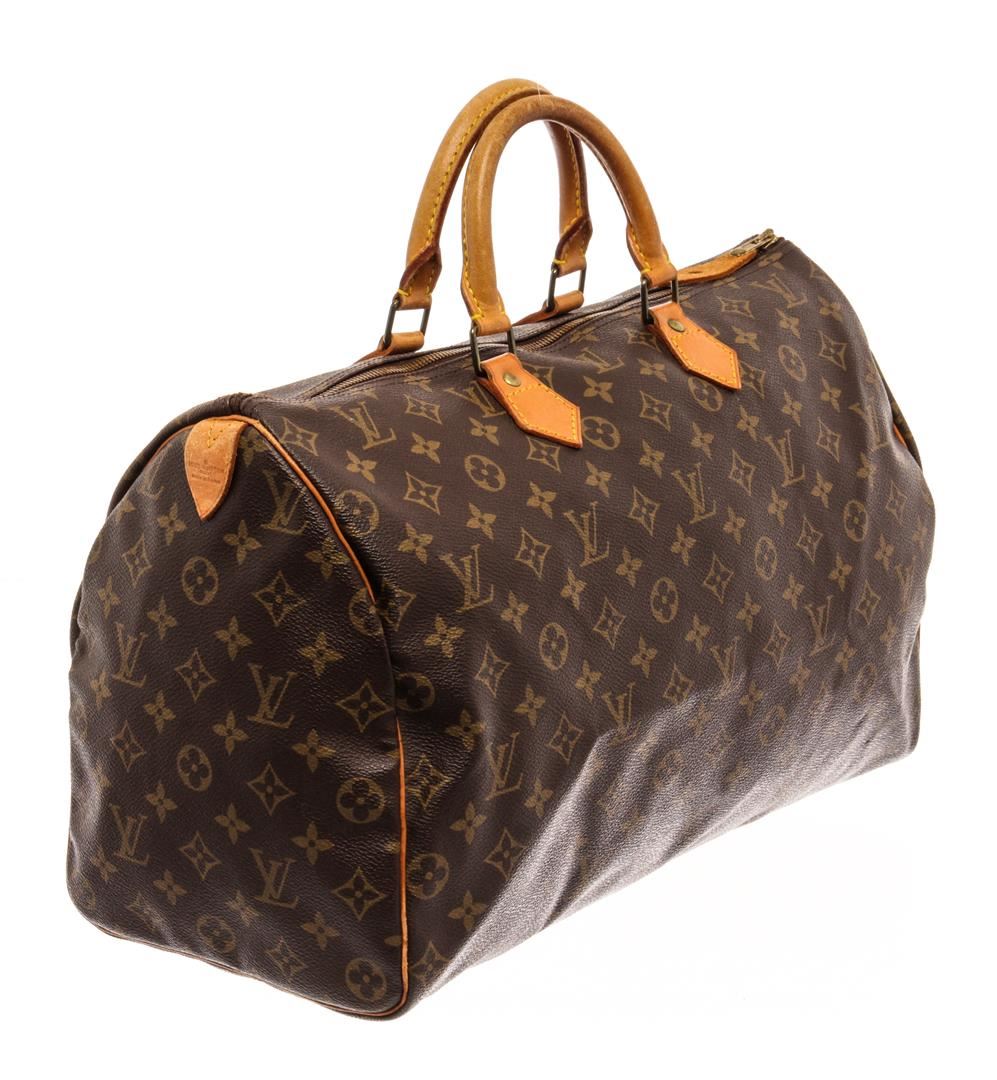 Louis Vuitton Brown Monogram Canvas Leather Speedy 40 Satchel Bag. All available information is listed in the description and shown in the photos. Louis Vuitton Brown Monogram Canvas Leather Speedy 40 Satchel Bag with brass hardware, leather trim, rolled handles & dual shoulder straps, leather trim embellishment, canvas lining & single interior pocket, zip closure at top. Height: 14" Width: 15" Depth: 8", Handle Drop: 4" / 35.56 x 38.1 x 20.32 Cm