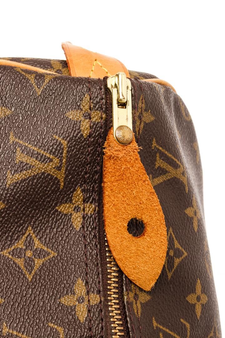 Louis Vuitton Brown Monogram Canvas Leather Speedy 40 Satchel Bag. All available information is listed in the description and shown in the photos. Louis Vuitton Brown Monogram Canvas Leather Speedy 40 Satchel Bag with brass hardware, leather trim, rolled handles & dual shoulder straps, leather trim embellishment, canvas lining & single interior pocket, zip closure at top. Height: 14" Width: 15" Depth: 8", Handle Drop: 4" / 35.56 x 38.1 x 20.32 Cm