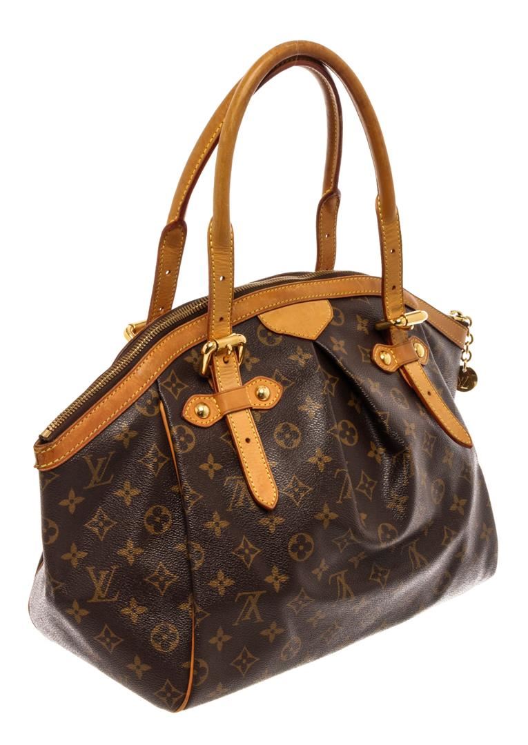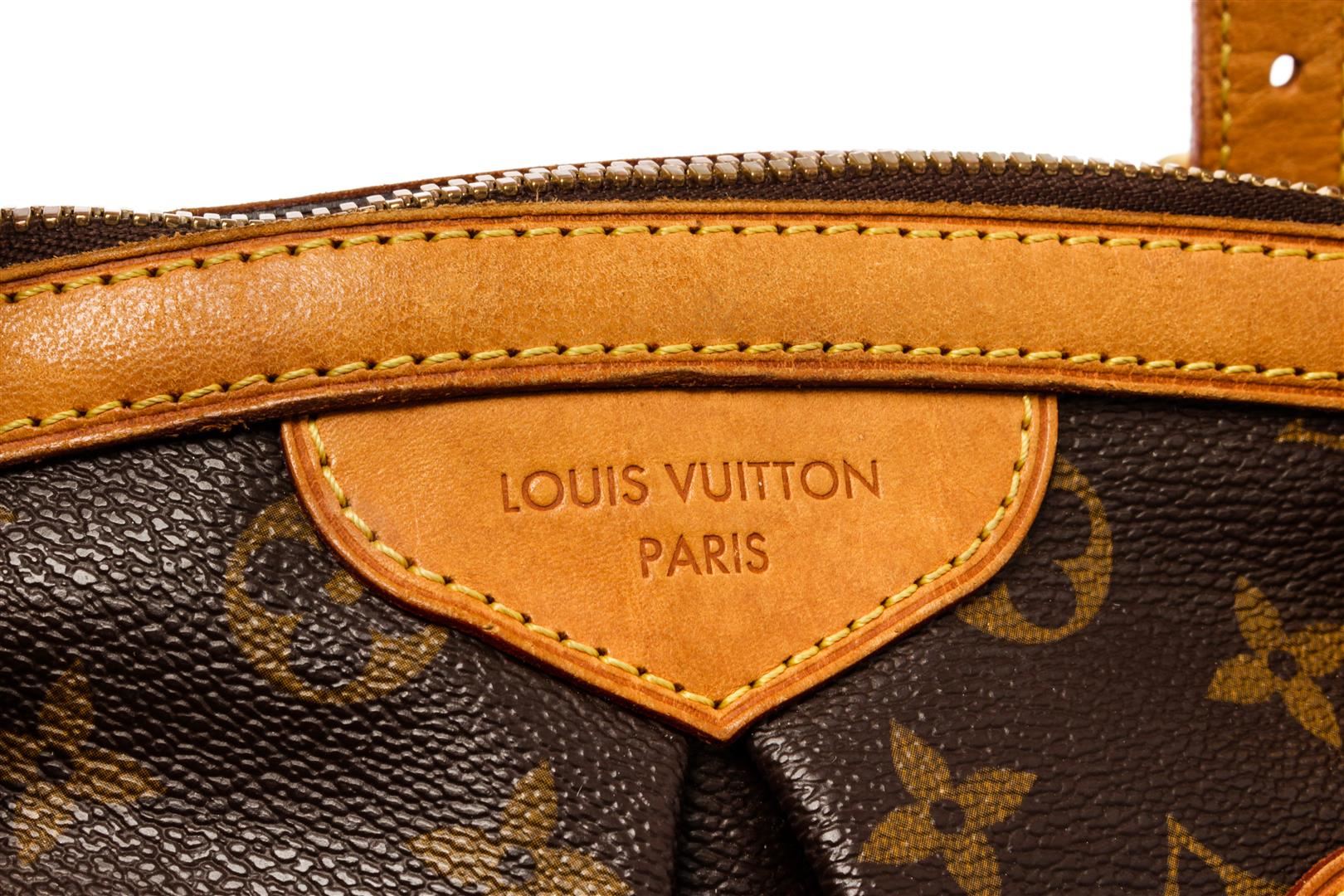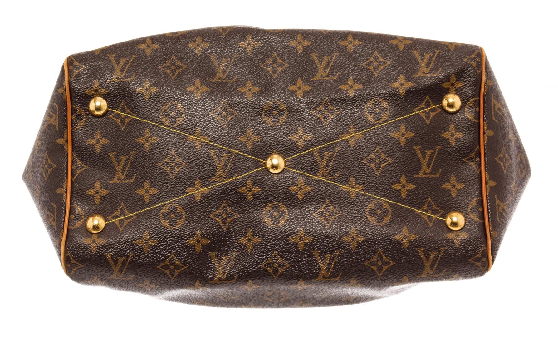 Louis Vuitton Brown Monogram Canvas Leather Tivoli GM Shoulder Bag. All available information is listed in the description and shown in the photos. Louis Vuitton Brown Monogram Canvas Leather Tivoli GM Shoulder Bag with brass hardware, dual adjustable shoulder straps, leather trim embellishment, canvas lining & three interior pockets, protective feet at base, zip closure at top. Height: 11" Width: 17" Depth: 8", Shoulder Strap Drop: 7" / 27.94 x 43.18 x 20.32 Cm