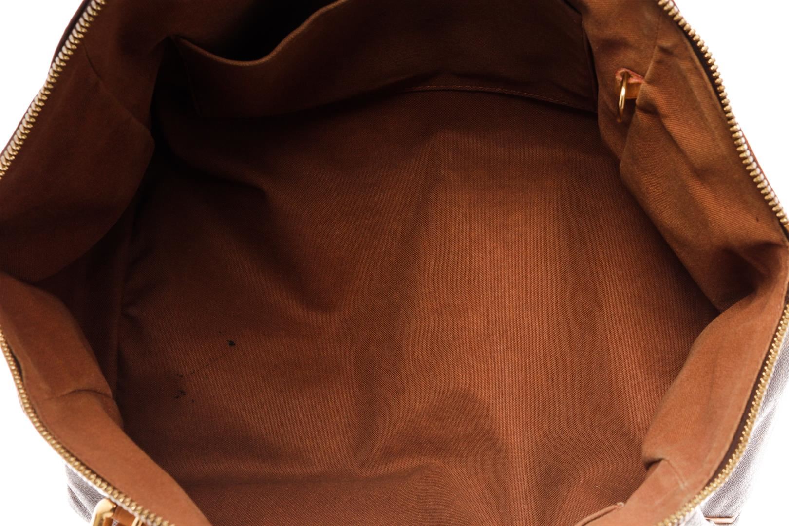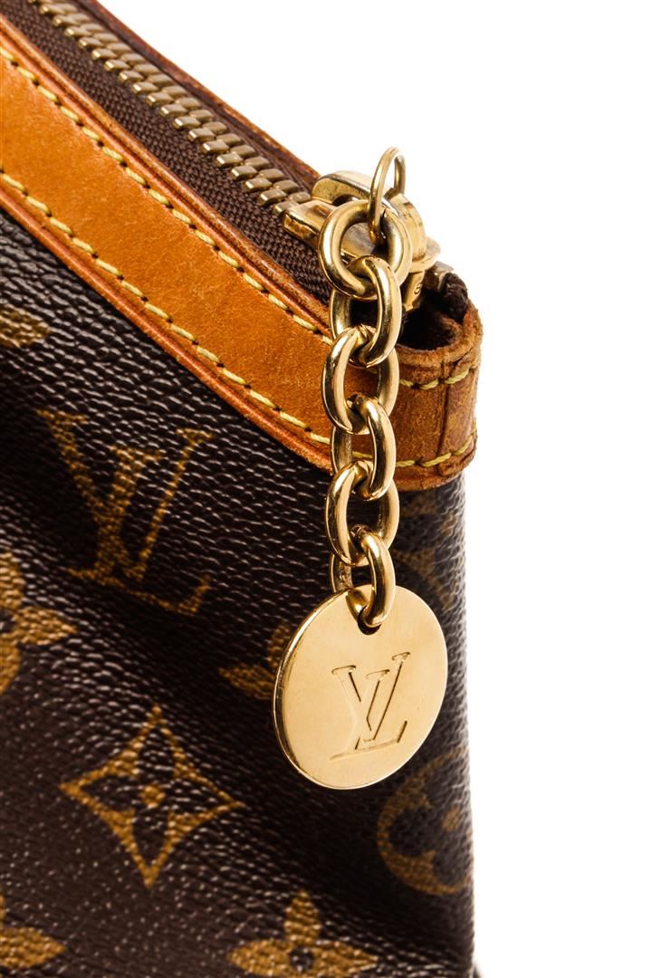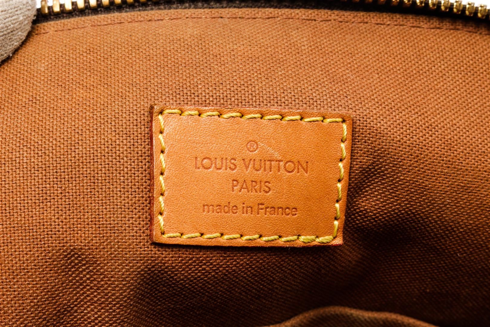 Louis Vuitton Brown Monogram Canvas Leather Tivoli GM Shoulder Bag. All available information is listed in the description and shown in the photos. Louis Vuitton Brown Monogram Canvas Leather Tivoli GM Shoulder Bag with brass hardware, dual adjustable shoulder straps, leather trim embellishment, canvas lining & three interior pockets, protective feet at base, zip closure at top. Height: 11" Width: 17" Depth: 8", Shoulder Strap Drop: 7" / 27.94 x 43.18 x 20.32 Cm