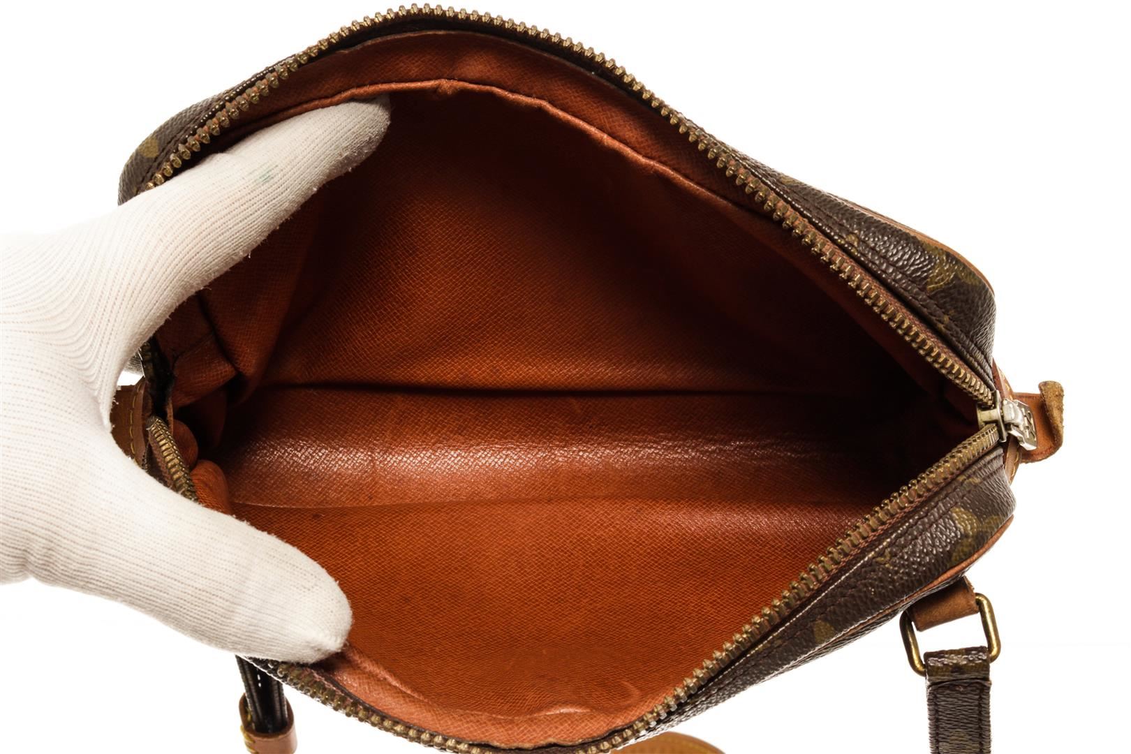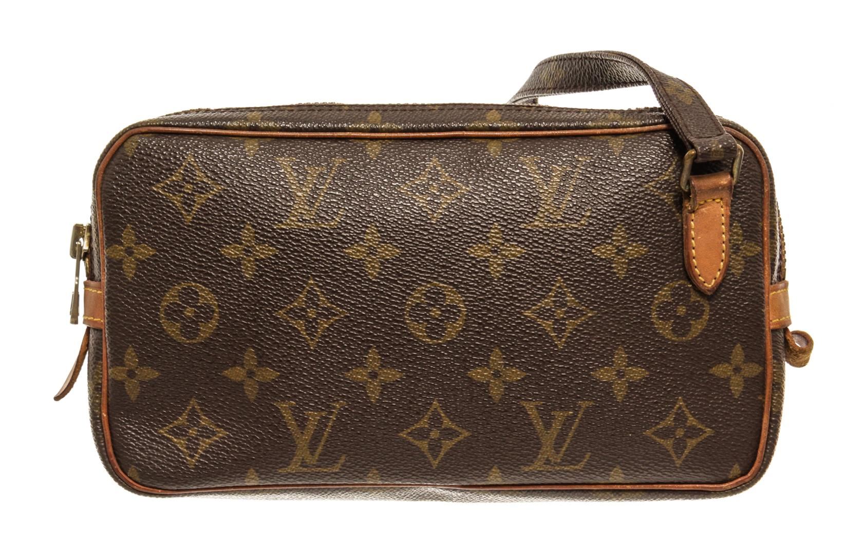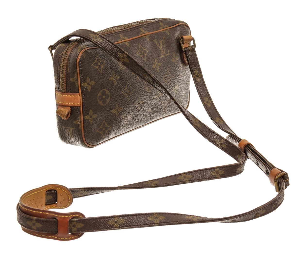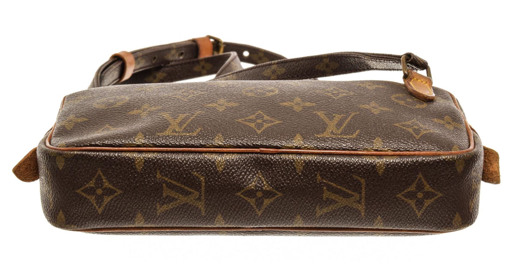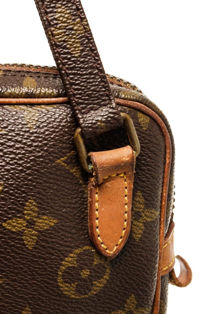 One Louis Vuitton Brown Monogram Canvas Marly Bandouliere Bag. Item is sold AS-IS. All available information is listed in the description and shown in the photo. Louis Vuitton Brown Monogram Canvas Marly Bandouliere Bag with Gold-tone hardware, Tan Vachetta leather trim, canvas lining, adjustable shoulder strap, and zip closure.