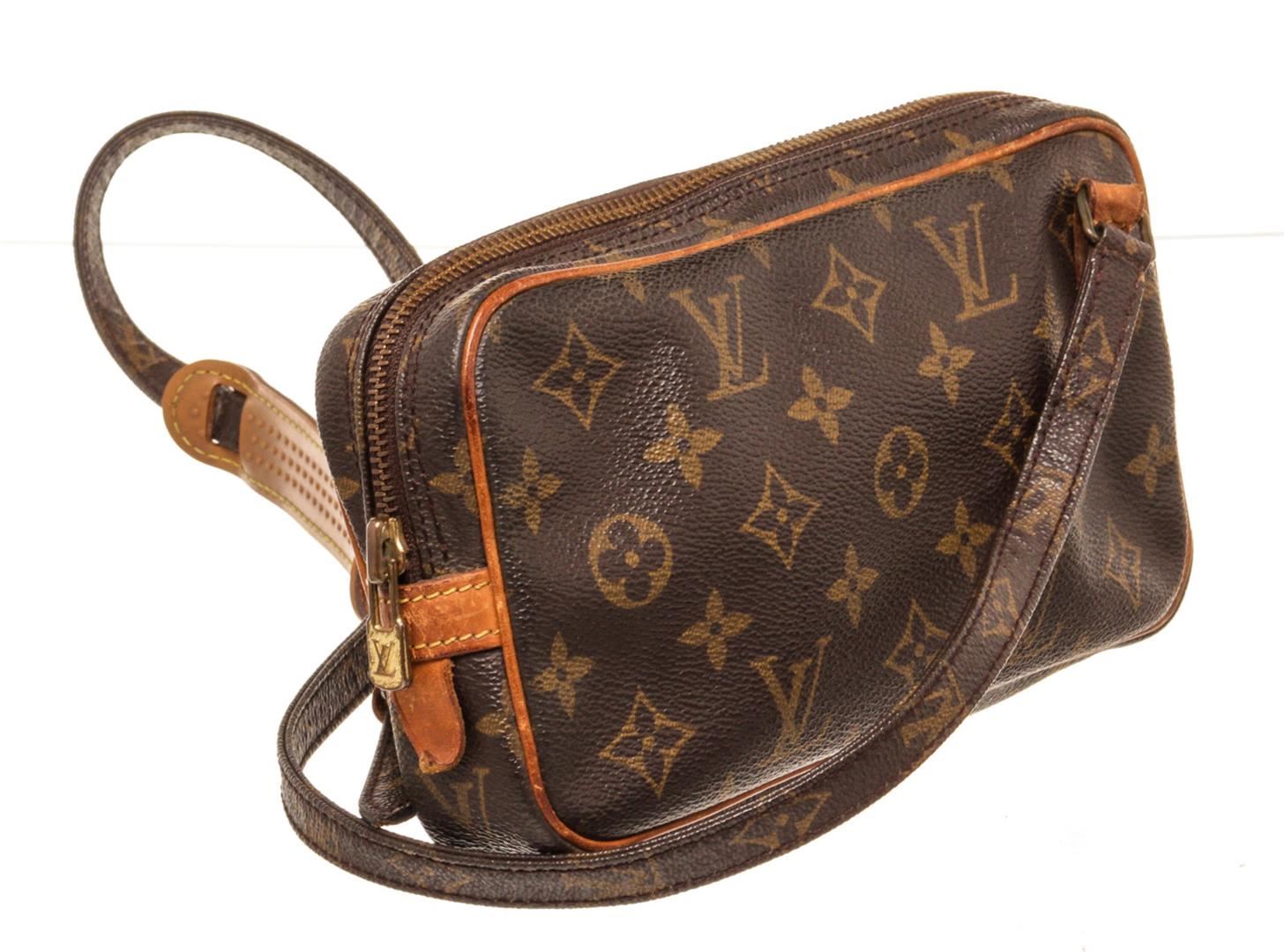 Louis Vuitton Brown Monogram Canvas Marly Bandouliere Crossbody Bag. All available information is listed in the description and shown in the photos. Louis Vuitton Brown Monogram Canvas Marly Bandouliere Crossbody Bag with material monogram canvas, Gold-tone hardware, Tan Vachetta leather trim, canvas lining, adjustable shoulder strap, and zip closure.