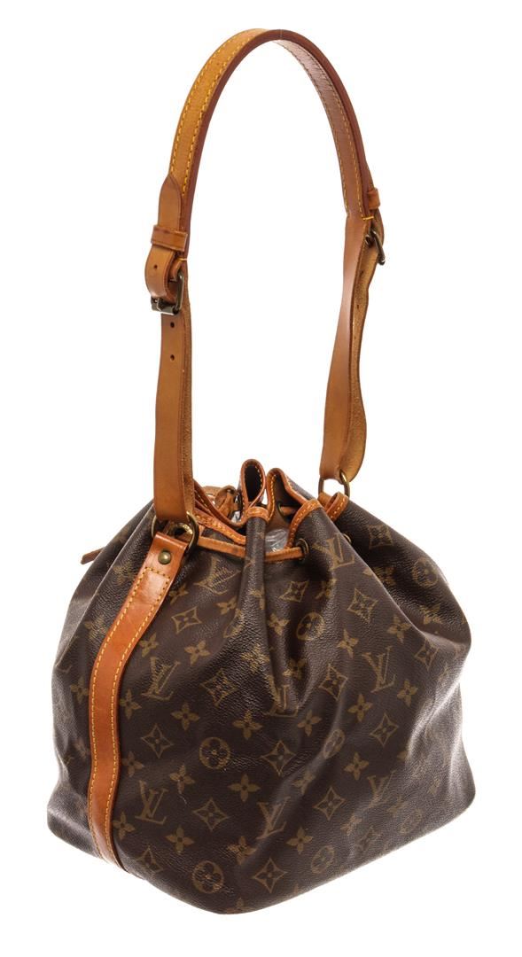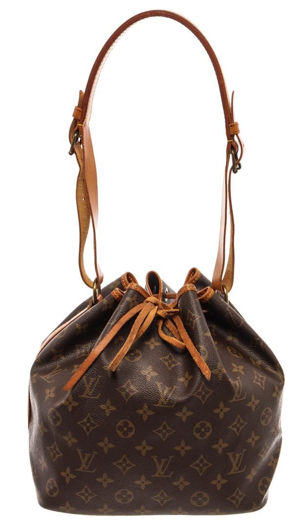 Louis Vuitton Brown Monogram Canvas Petit Noe Shoulder Bag. All available information is listed in the description and shown in the photos. Louis Vuitton Brown Monogram Canvas Petit Noe Shoulder Bag with brown coated canvas, brass hardware, single shoulder strap, canvas lining, pull-through closure at front. Height: 10.5" Width: 9.5" Depth: 7", Shoulder Strap Drop: 10-12.75" / 26.67 x 24.13 x 17.78 Cm