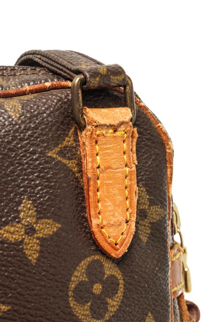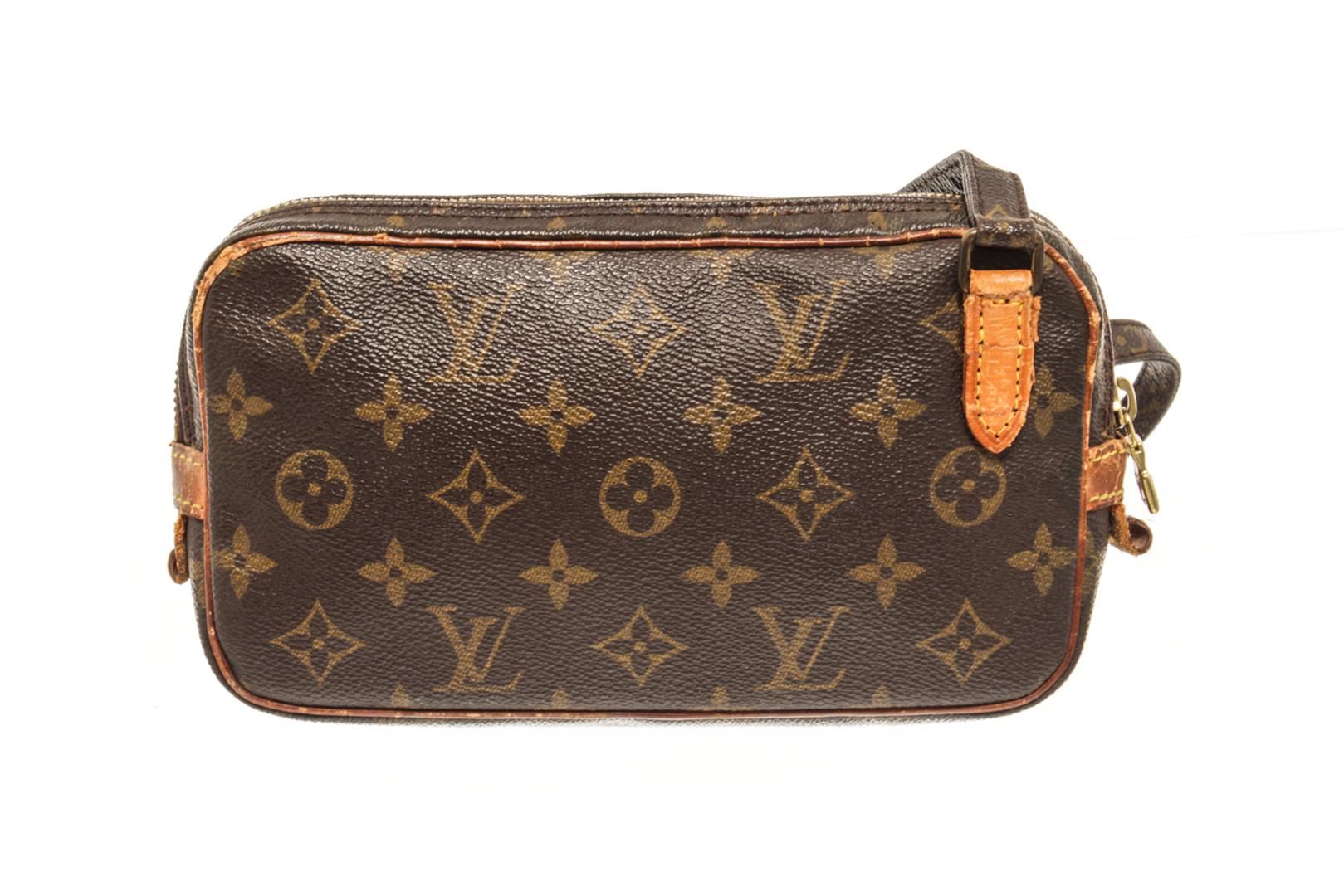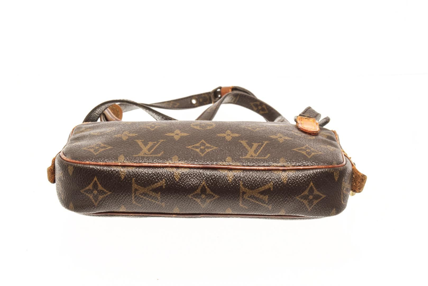 One Louis Vuitton Brown Monogram Canvas Pochette Marli Bandolier Shoulder Bag. Item is sold AS-IS. All available information is listed in the description and shown in the photo. louis vuitton brown monogram canvas pochette marli bandolier shoulder bag (HxWxD): 14cm x 22cm x 4.6cm / 5.51'' x 8.66'' x 1.81''