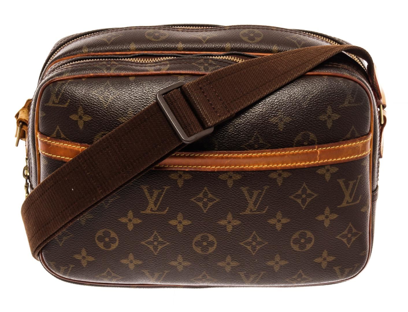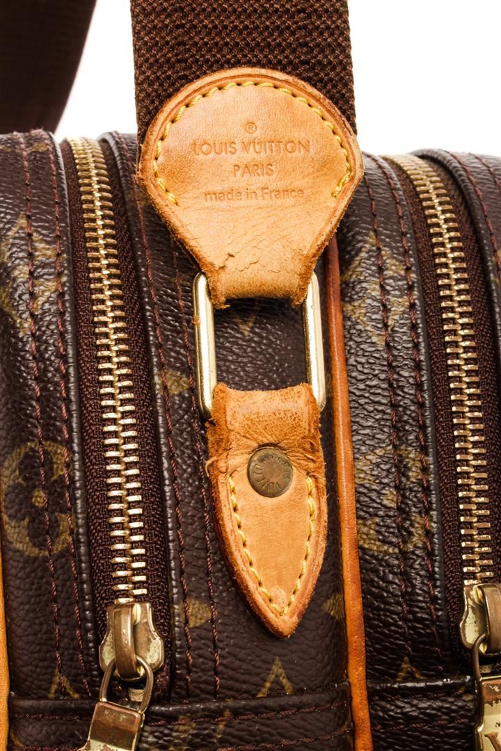 Louis Vuitton Brown Monogram Canvas Reporter PM Crossbody Bag. All available information is listed in the description and shown in the photos. Louis Vuitton Brown Monogram Canvas Reporter PM Crossbody Bag with gold-tone hardware, single adjustable shoulder strap, single exterior pocket, canvas lining & single interior pocket, zip closure at top. Condition Details: Leather cracking along front pocket, minor interior wear, tarnishing on zipper pull, piping wear on top and bottom, corners, wear on leather side tab. Height: 9" Width: 11" Depth: 4.5", Shoulder Strap Drop: 22.5" / 22.86 x 27.94 x 11.43 Cm