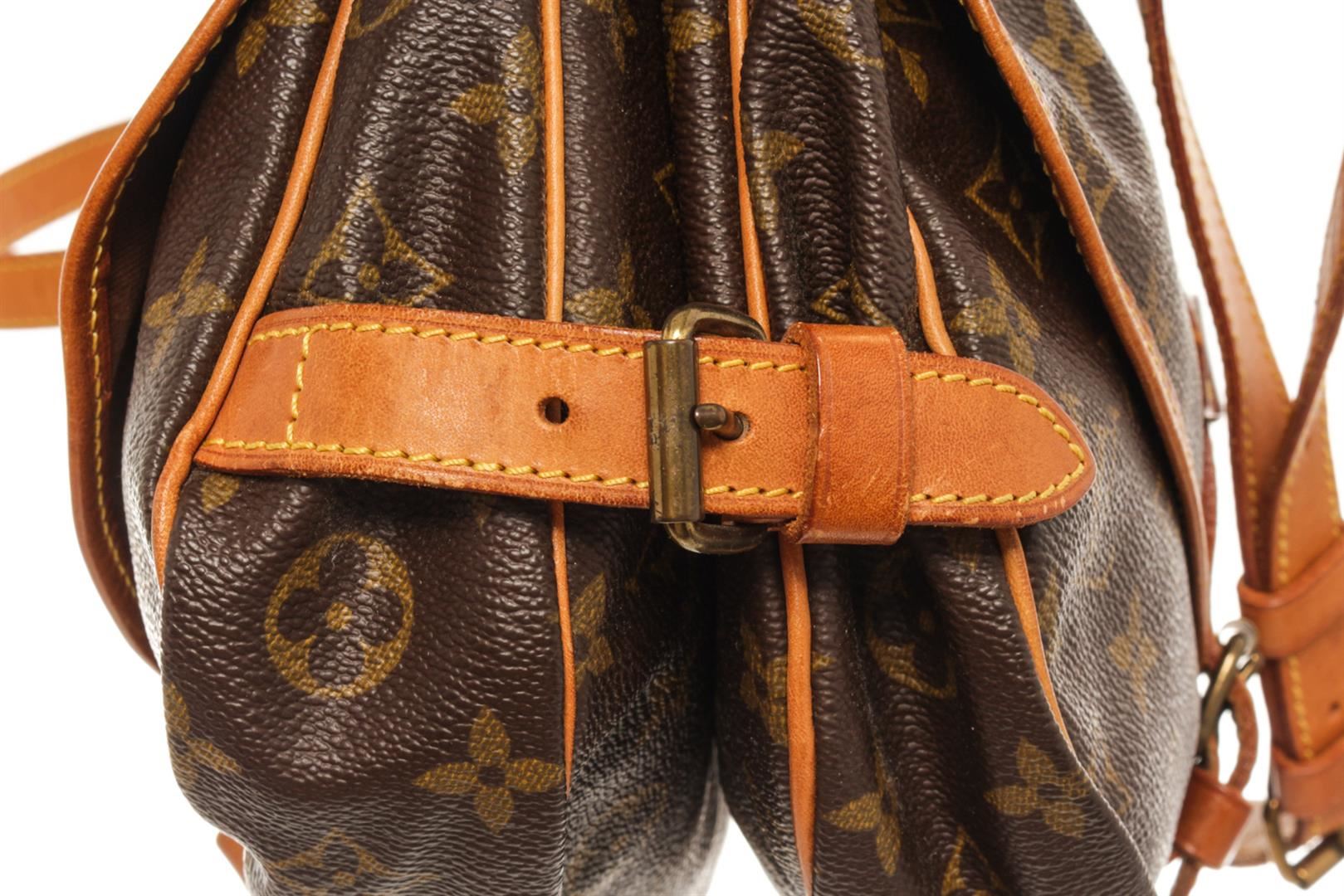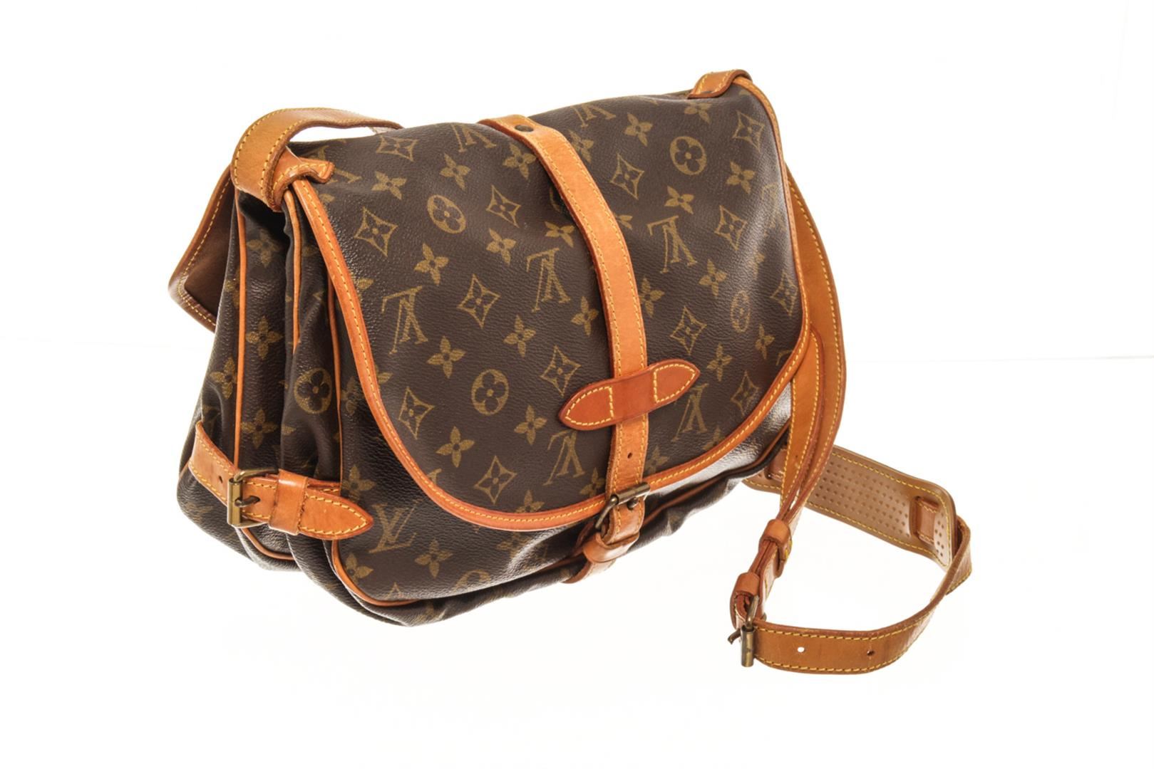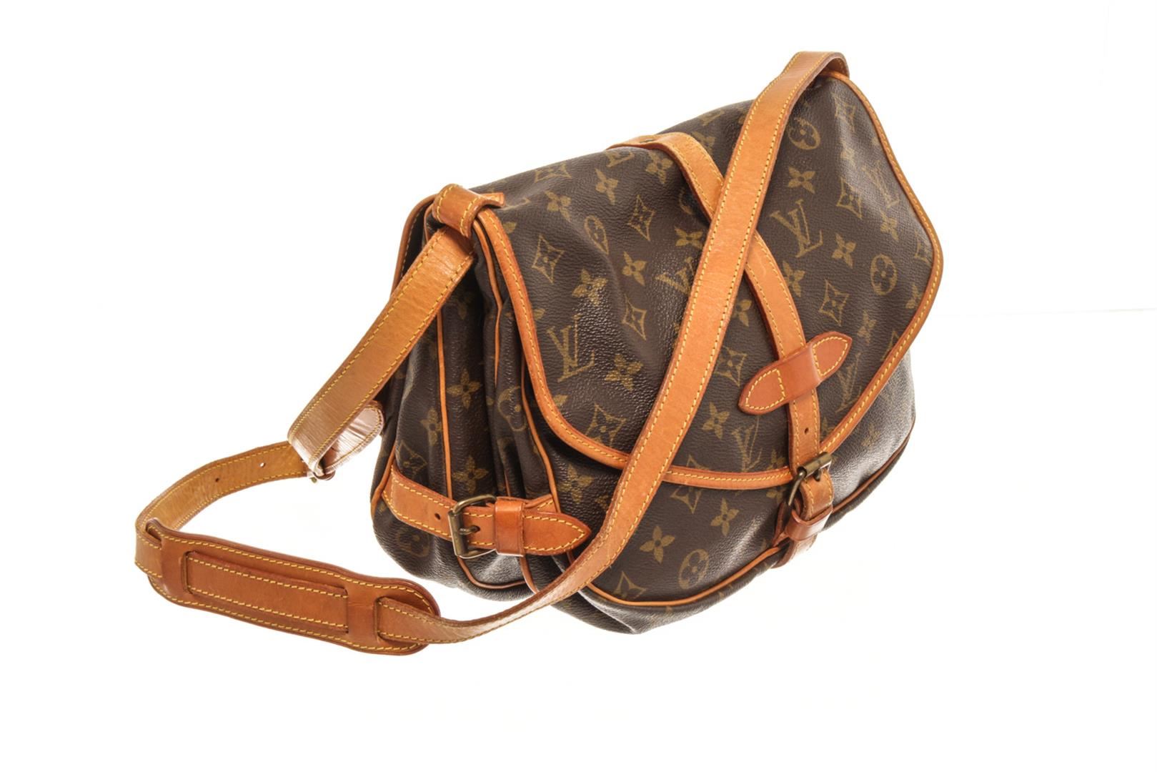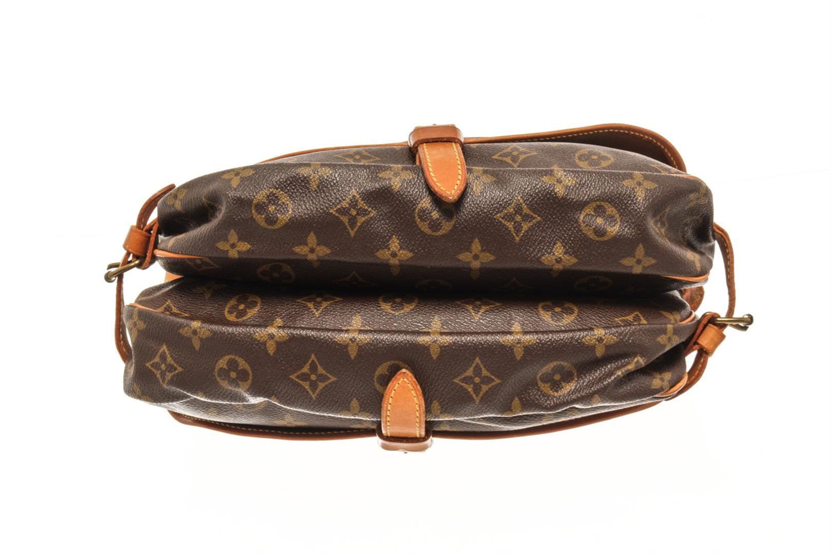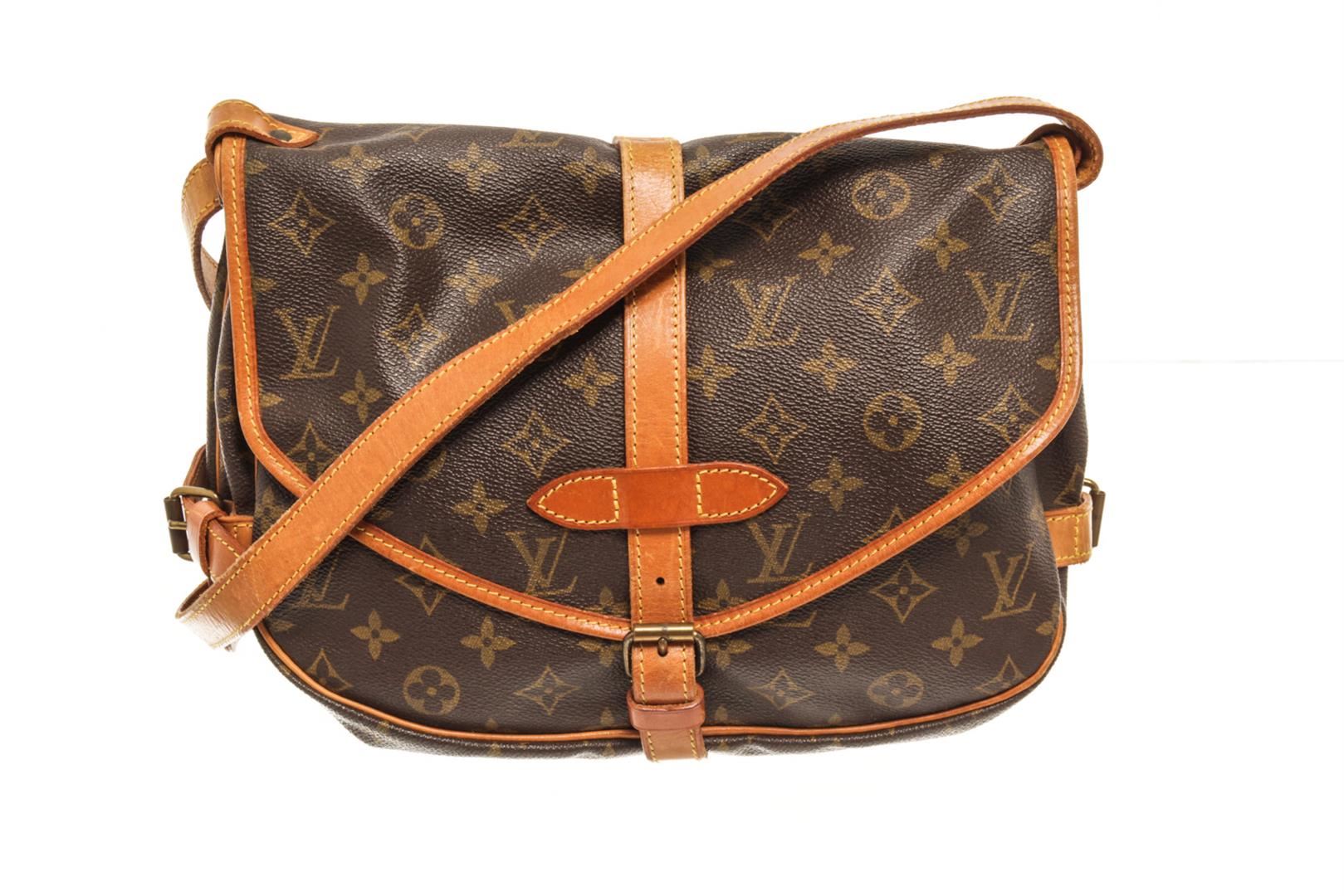 One Louis Vuitton Brown Monogram Canvas Saumur 30 Crossbody Bag. Item is sold AS-IS. All available information is listed in the description and shown in the photo. louis vuitton brown monogram canvas saumur 30 crossbody bag with the saumur 30 features a monogram canvas body, a flat adjustable leather shoulder strap, double open compartments with front flaps and belt buckle closures. Height: 9.1" Width: 10.8" Depth: 4.7", Handle Drop: / 23.11 x 27.43 x 11.93 Cm