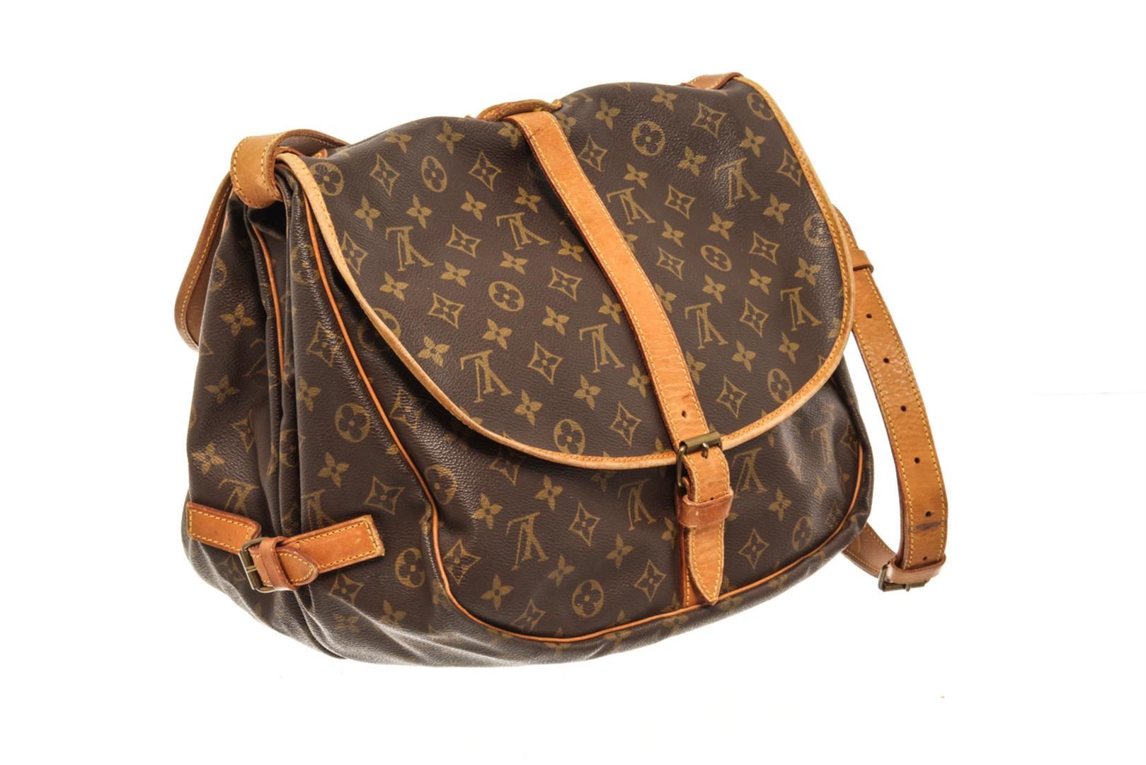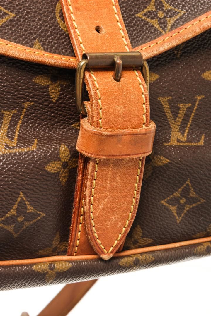 One Louis Vuitton Brown Monogram Canvas Saumur 30 Shoulder Bag. Item is sold AS-IS. All available information is listed in the description and shown in the photo. louis vuitton brown monogram canvas saumur 30 shoulder bag with gold hardware, leather trims Height: 8 in (20.32 cm), Width: 11 in (27.94 cm), Depth: 5 in (12.7 cm)