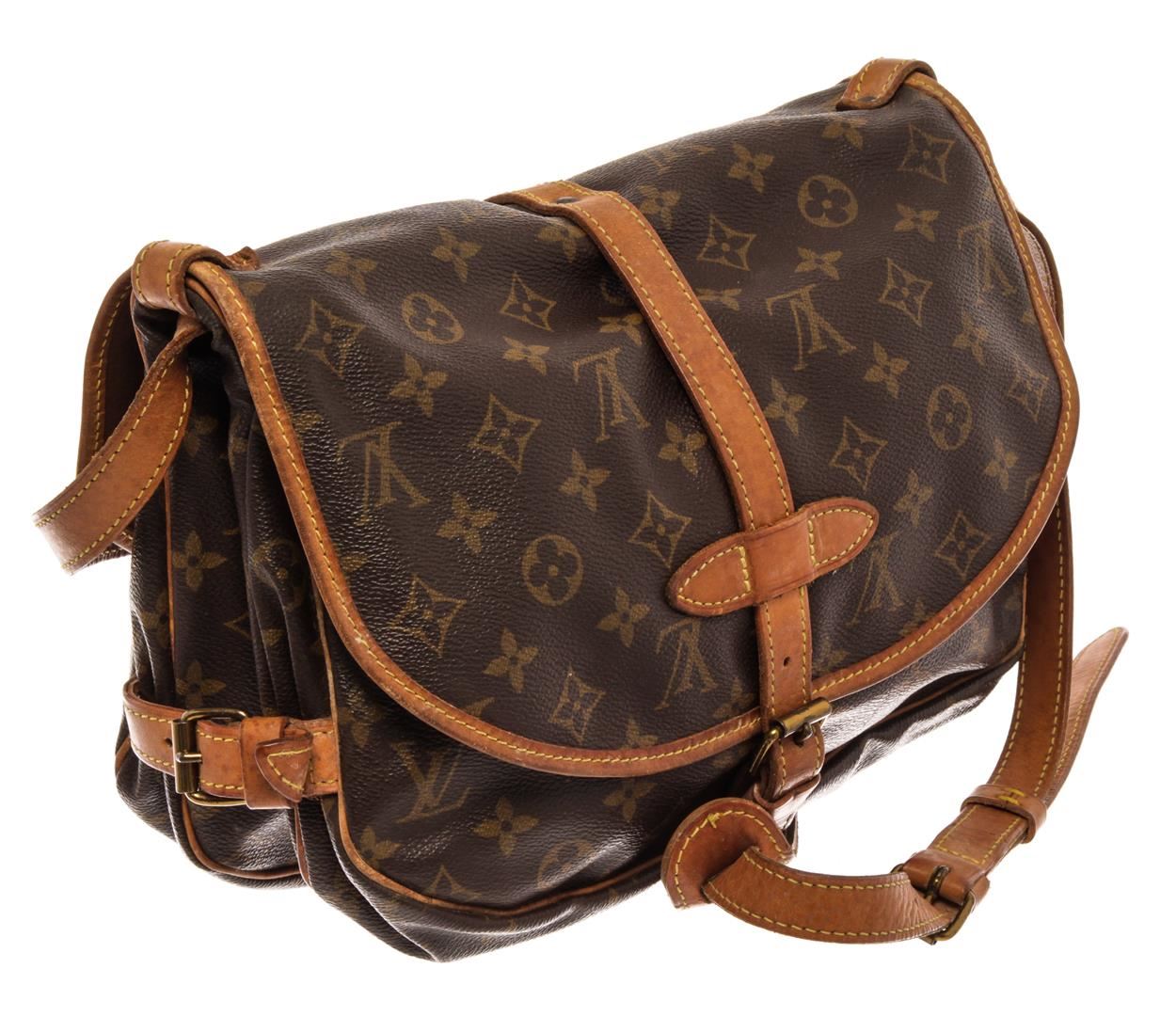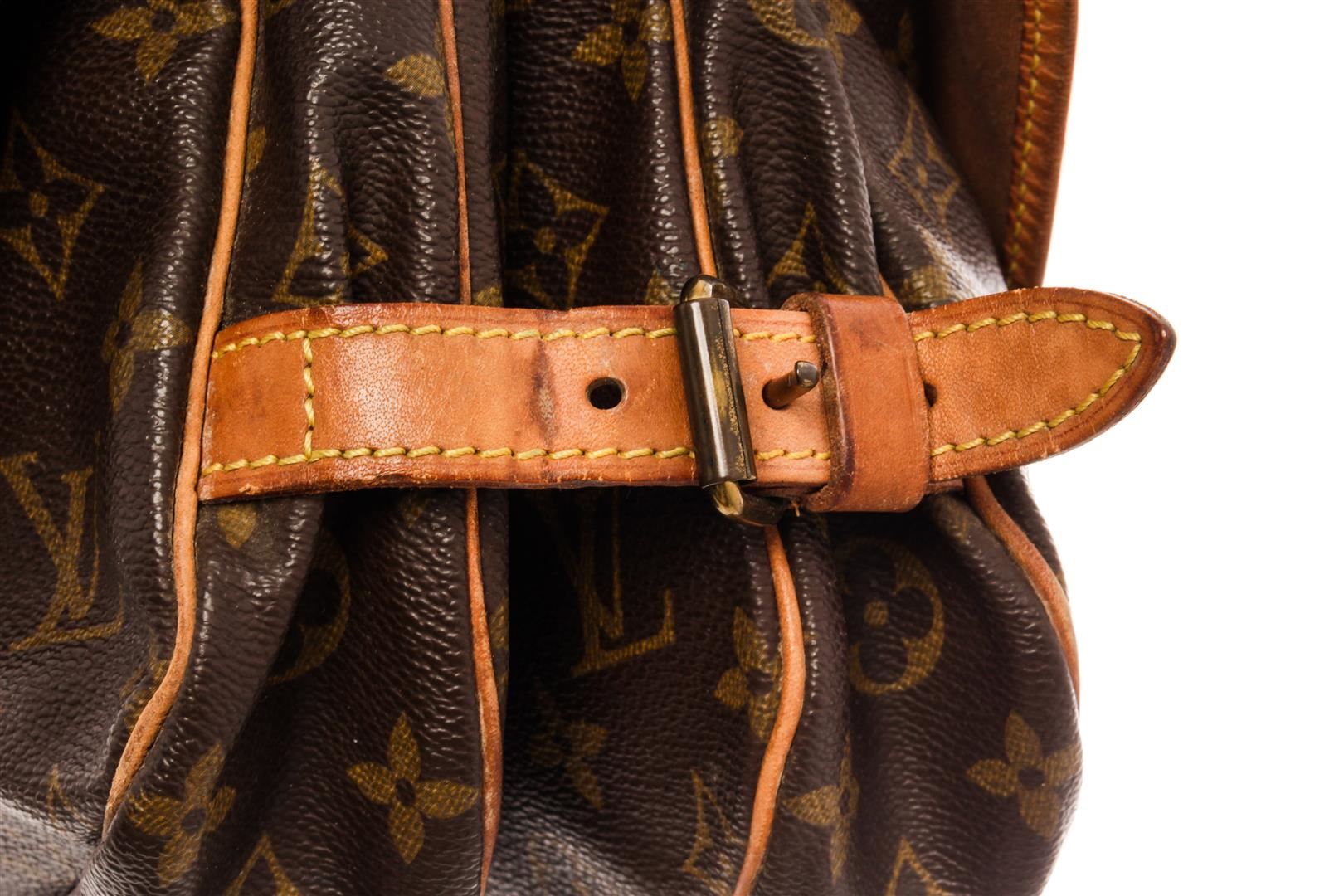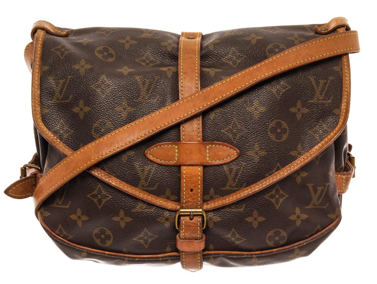 Louis Vuitton Brown Monogram Canvas Saumur 30cm Shoulder Bag. All available information is listed in the description and shown in the photos. Louis Vuitton Brown Monogram Canvas Saumur 30cm Shoulder Bag with brown coated canvas, brass hardware, leather trim, single adjustable shoulder strap, leather trim embellishment, canvas lining & three interior pockets, flap & buckle closures at front. Height: 10" Width: 12" Depth: 9.25", Shoulder Strap Drop: 19.5" / 25.4 x 30.48 x 23.49 Cm